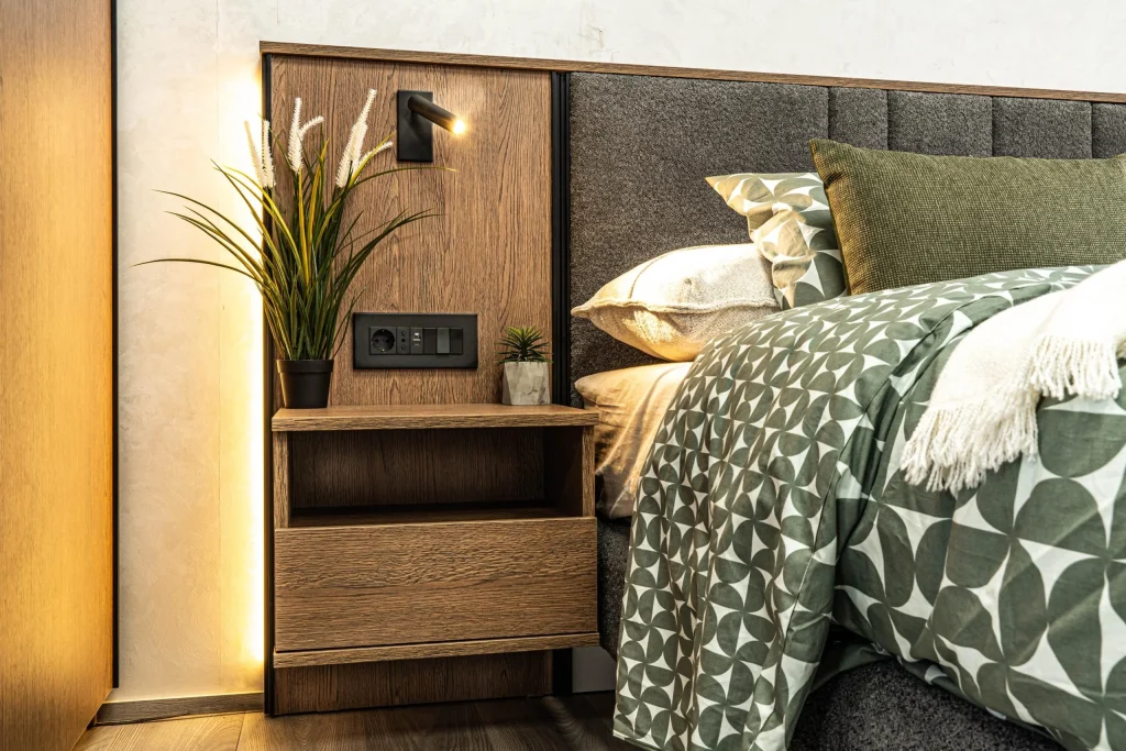 Нощни шкафчета – висок практичен гръб  –  система “ hаnging up“  – опция скриване на кабели и вграждане конзола за контакт – въздушни канали – за минаването на кабелите –  конзола и контакти, ключове за осветление – вижте допълнителните опции. Водач на чекмеджетата  – скрити Quadro Hettich – плавно затваряне, начин на монтиране – стенен монтаж – окачане на стена – 2 бр. в к-т;