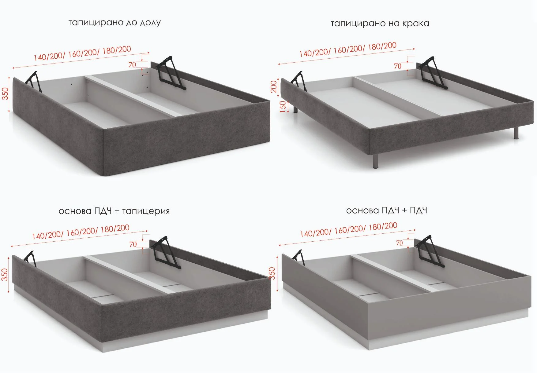 Леглото е подходящо за монтаж на еднолицев или двулицев матрак зависимост от вашите желания. За двулицев матрак е необходимо закупуване на подматрачна ламелна рамка, която осигурява  обдишване на матрака удължаваща неговия живот. За практично използване на свободното пространство под леглото е включен към цената газов механизъм и дъно.