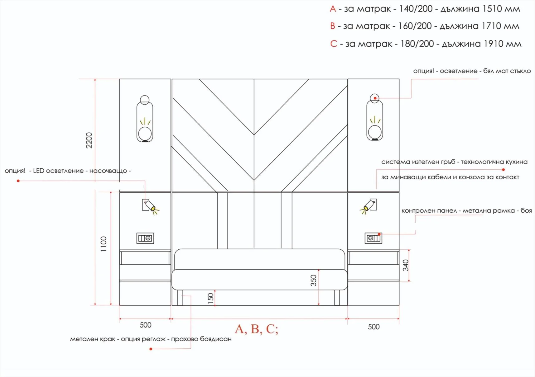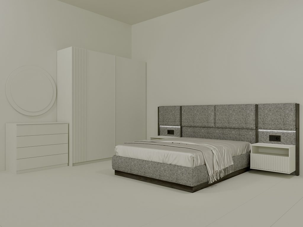 Легло: Удобна тапицирана табла вис 110 см – жакардова дамаска – кълцано букле, в левия и десния край с профил – метал – прахово боядисано в бял цвят, базата за матрак е с заработен вътрешен мост, гарантиращ прав диагонал на леглото, тапицирани царги. Всички използвани сглобки са метални – скрит монтаж, осигуряващи изряден външен вид на изделието, включени са дъно и механизъм. Така практичните крака на легло са онази част, която ще донесе необходимата височина и завършен вид. Металните крака са реглажни и позволяват перфектно нивелиране на изделието – покритие – боя – бял цвят. Опция – с допълнително заплащане – осветление;
