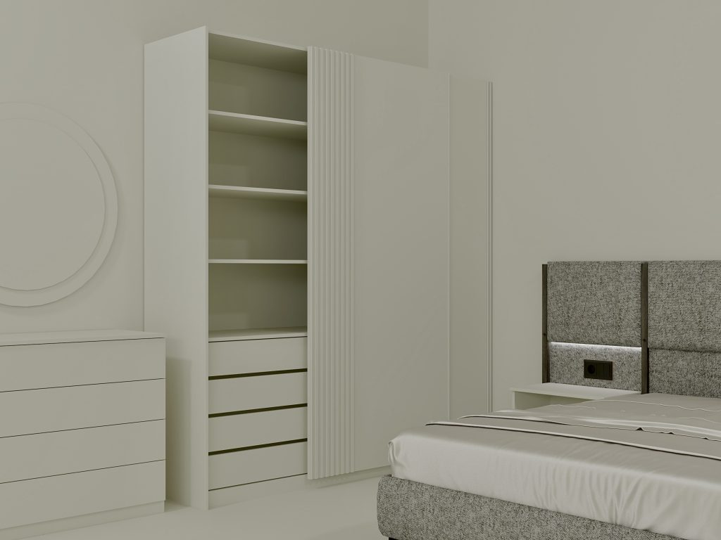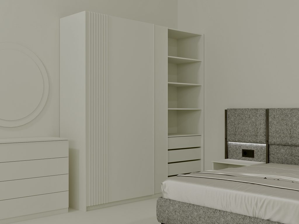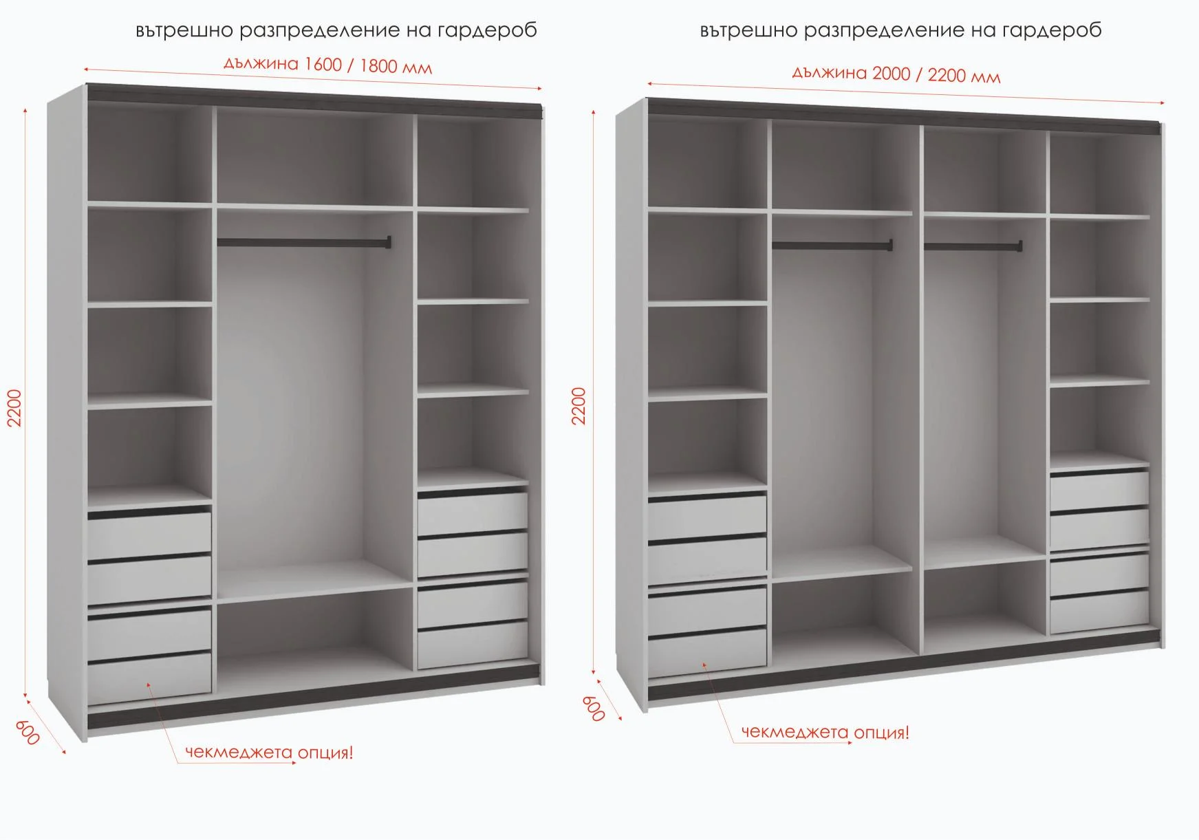 Гардероб: плъзгаща система външно водене – опция за плавно затваряне /вижте в панела/, вертикално разположени вградени алуминиеви „П“- образни кант дръжки с допълнително излят външен улей за лесно и удобно захващане, спомагащи ефективното плъзгане на системата – гарантиращи устойчивост и здравина на вратите. Покритието е прахова боя – бял цвят. Използвани са сглобки – скрит монтаж, метални рафтоносачи за стабилност на рафтовете, лост за дрехи – метален – форма – елипса – покритие – никел, цялата конструкция на гардероба е монтирана върху метални реглажни „пети“  – осигуряващи изрядна нивелация на изделието и правилната му експлоатация, вградени огледала на лява врата – опция! – 1 бр. в к-т;
