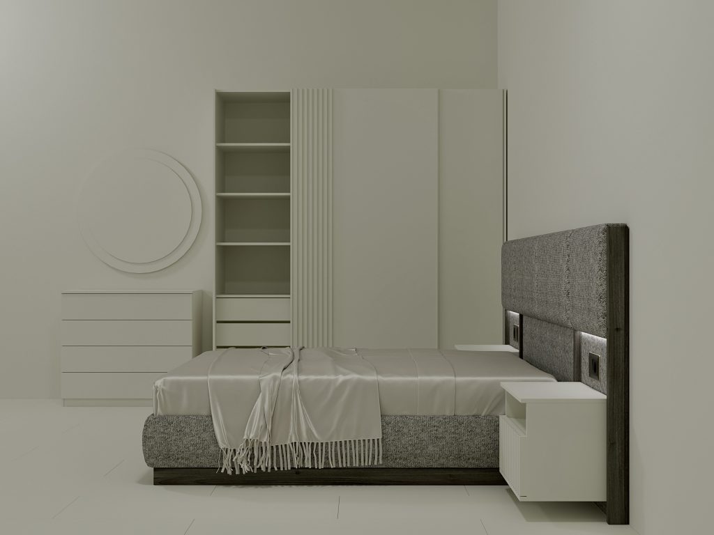 Спален комплект Серенити включва стилно тапицирано легло с повдигащ механизъм и място за съхранение, гардероб с плъзгащи врати и вградени алуминиеви дръжки, както и две окачени нощни шкафчета със скрити водачи и плавно затваряне. Конструкцията е стабилна, с метални сглобки и реглажни крака за перфектно нивелиране. Комплектът предлага модерна визия в бял цвят и практични решения за организация на пространството. Предлагат се и допълнителни модули като скрин, тоалетка с огледало и различни осветления.