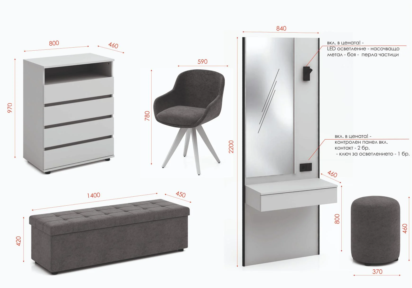 • тоалетка с огледало с 1 бр чекмедже – размер дълж 84/ вис 80/ 220 / дълб 45 см – вкл в цената 1 бр осветление насочващо  + контакт 1 бр;