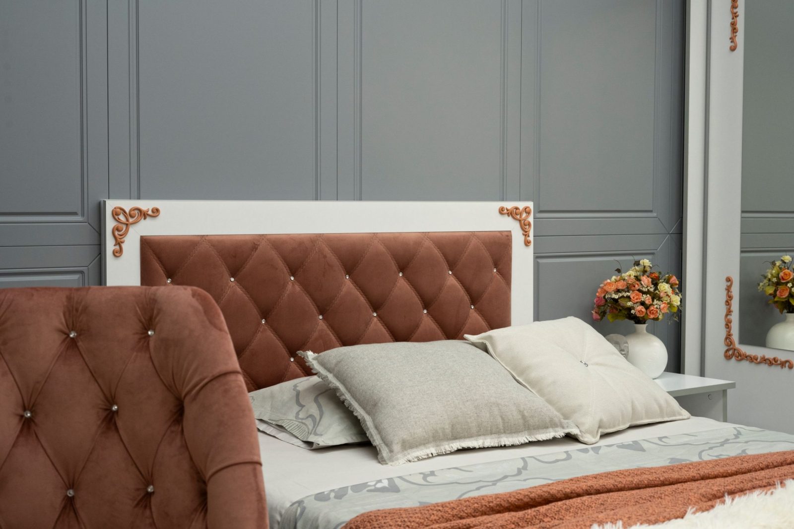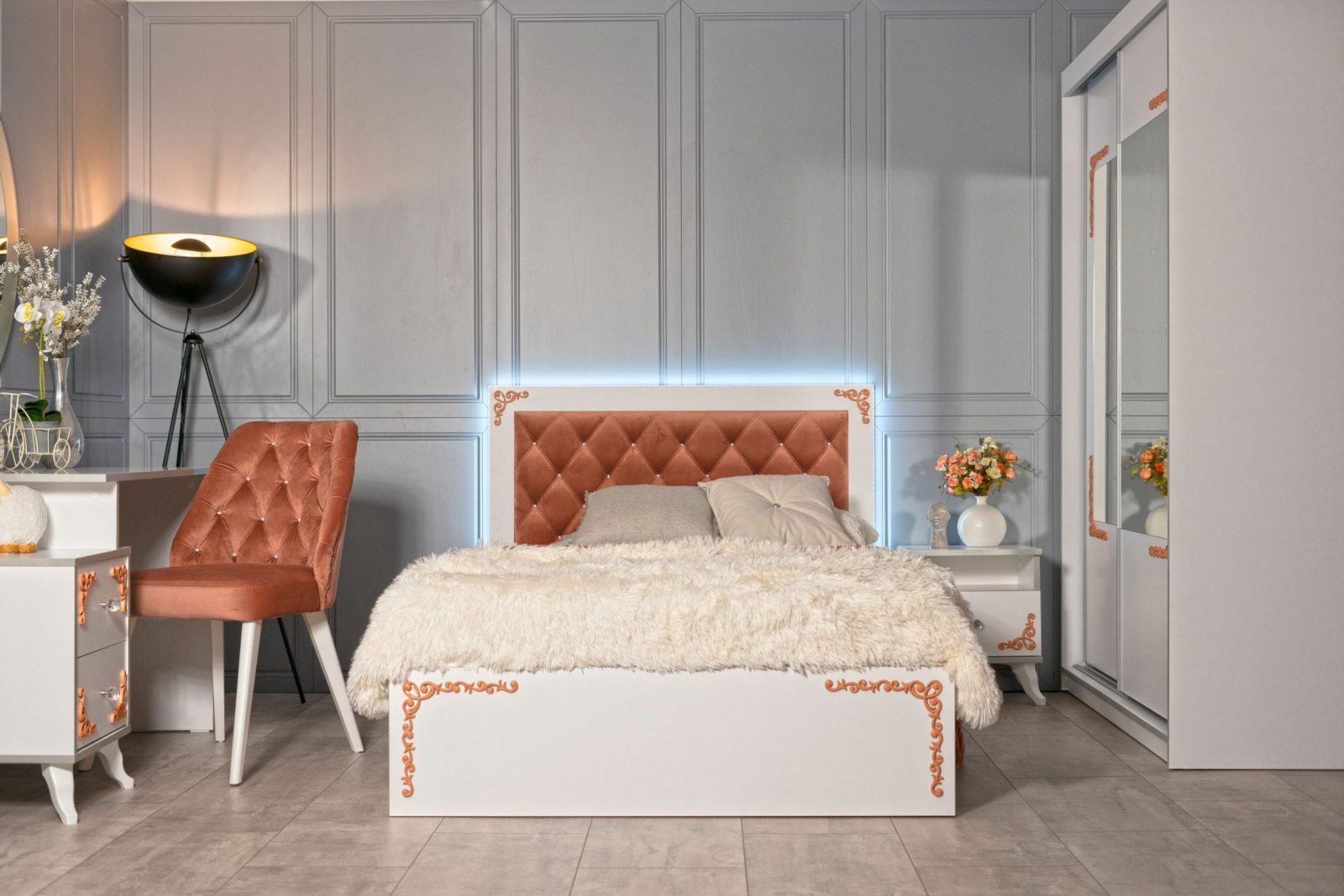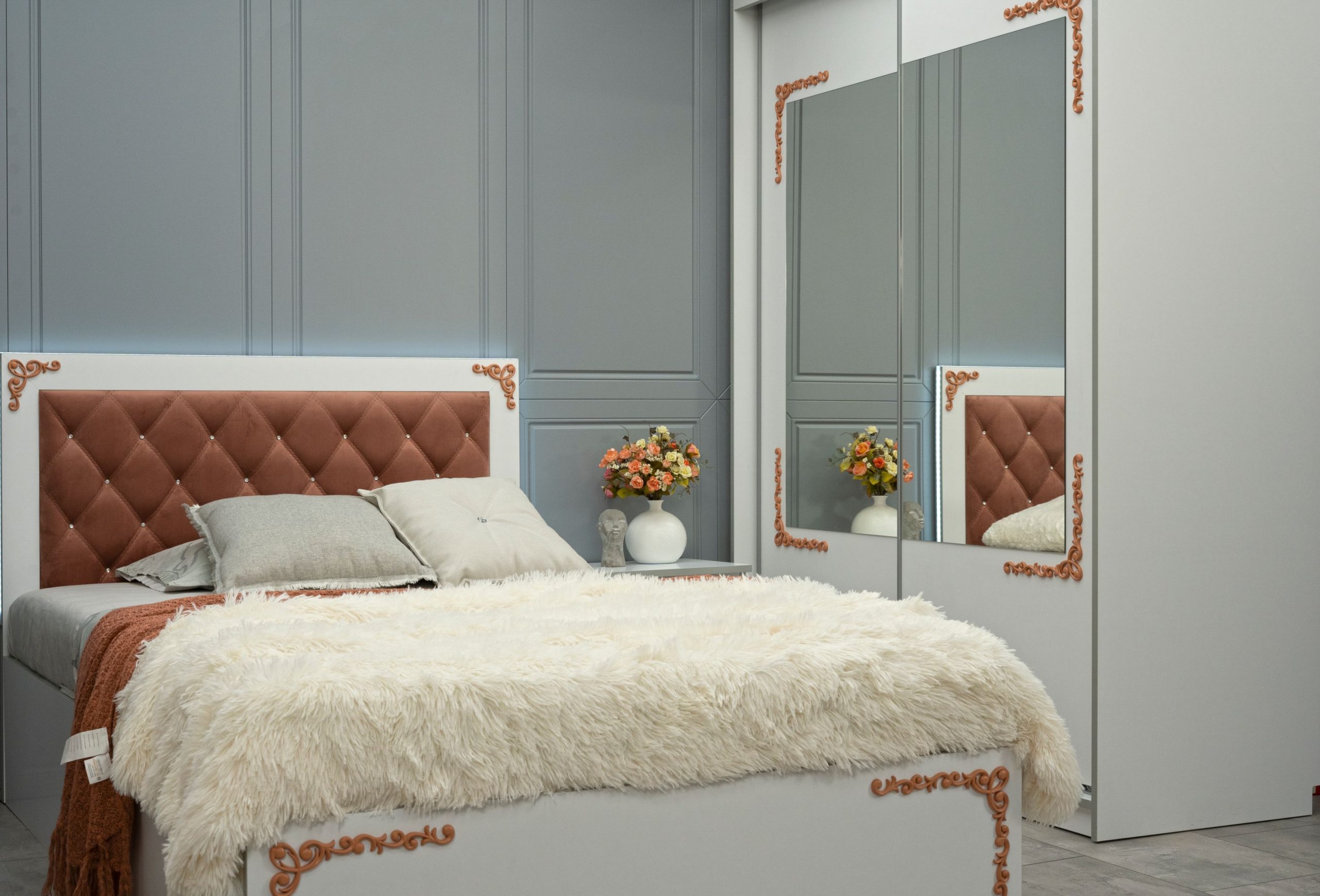 Легло: Основна табла с дебелина 36 мм ламинирано ПДЧ, по цялата табла е вградено LED осветление командвано от дистанционно с опция за регулиране силата на светлина, вградена елегантна табла с двоен лицев шев изпълнение тип „ромб“ от високо износоустойчив плюш – цвят – праскова, акценти от копчета бял прозрачен кристал. базата за матрак е с заработена вътрешна бленда за допълнителна здравина и прав диагонал на леглото. Всички използвани сглобки са метални – скрит монтаж, леглото е изработено за матрак с размер 120/200 см;