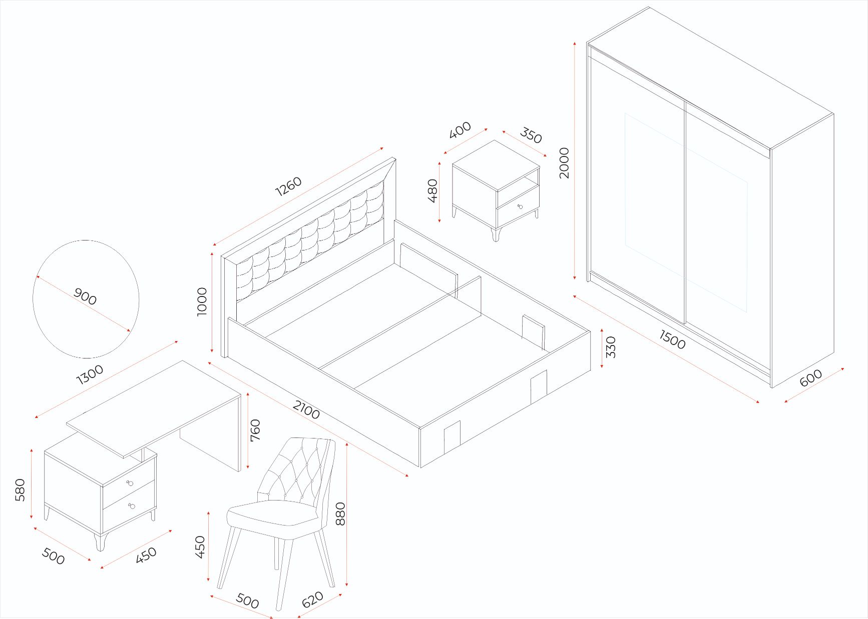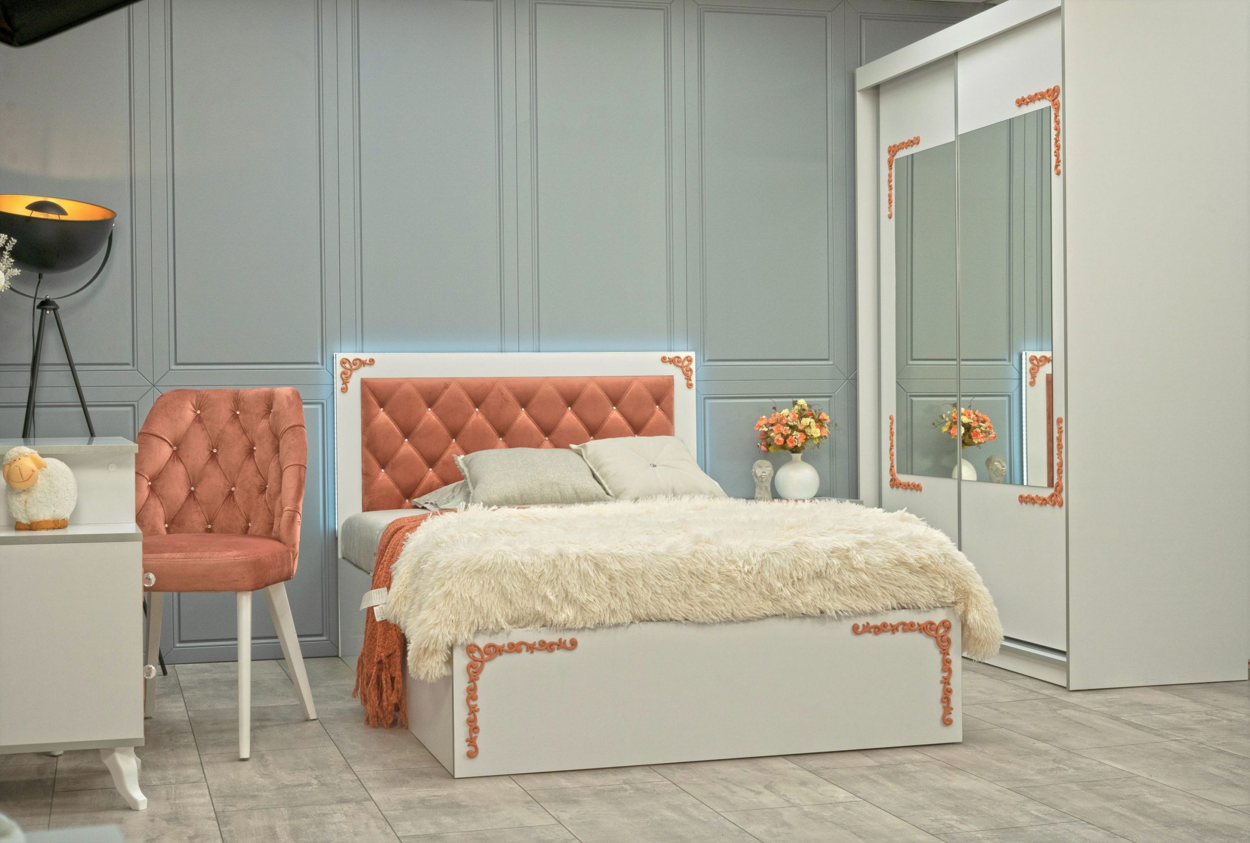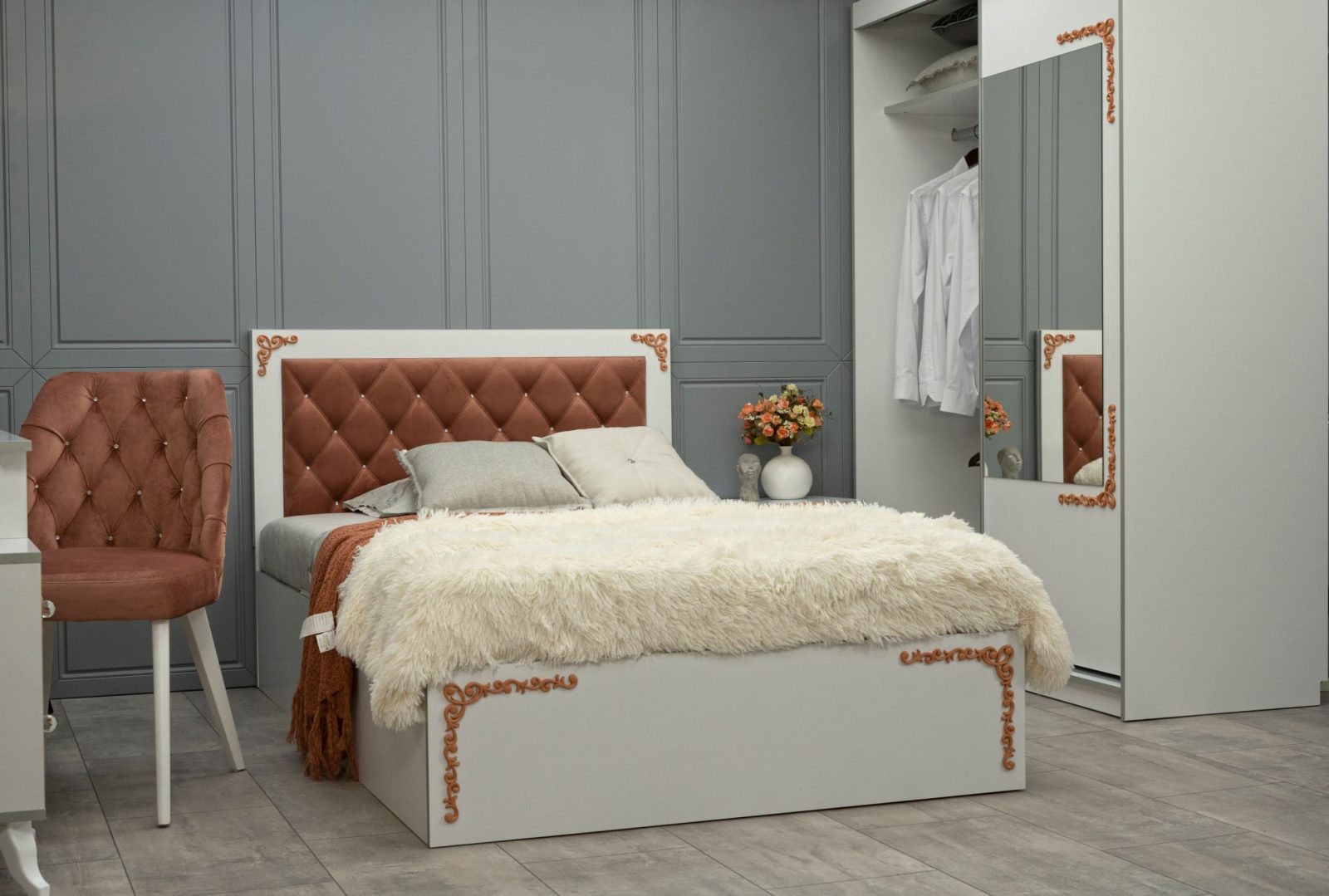 Легло: Основна табла с дебелина 36 мм ламинирано ПДЧ, по цялата табла е вградено LED осветление командвано от дистанционно с опция за регулиране силата на светлина, вградена елегантна табла с двоен лицев шев изпълнение тип „ромб“ от високо износоустойчив плюш – цвят – праскова, акценти от копчета бял прозрачен кристал. базата за матрак е с заработена вътрешна бленда за допълнителна здравина и прав диагонал на леглото. Всички използвани сглобки са метални – скрит монтаж, леглото е изработено за матрак с размер 120/200 см;