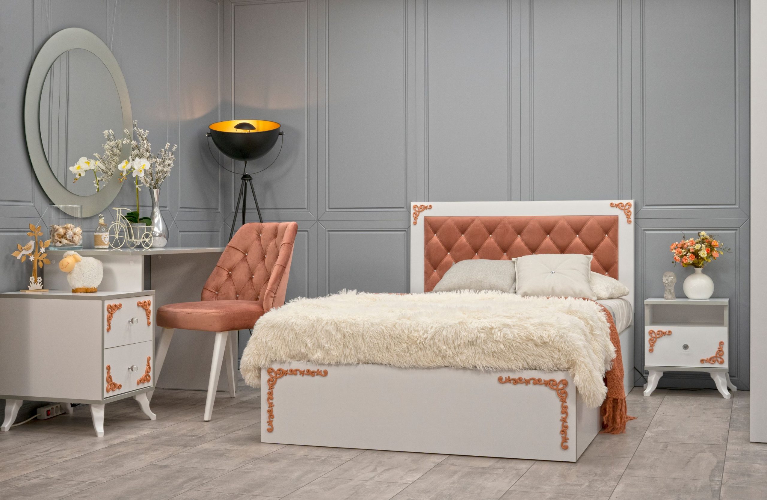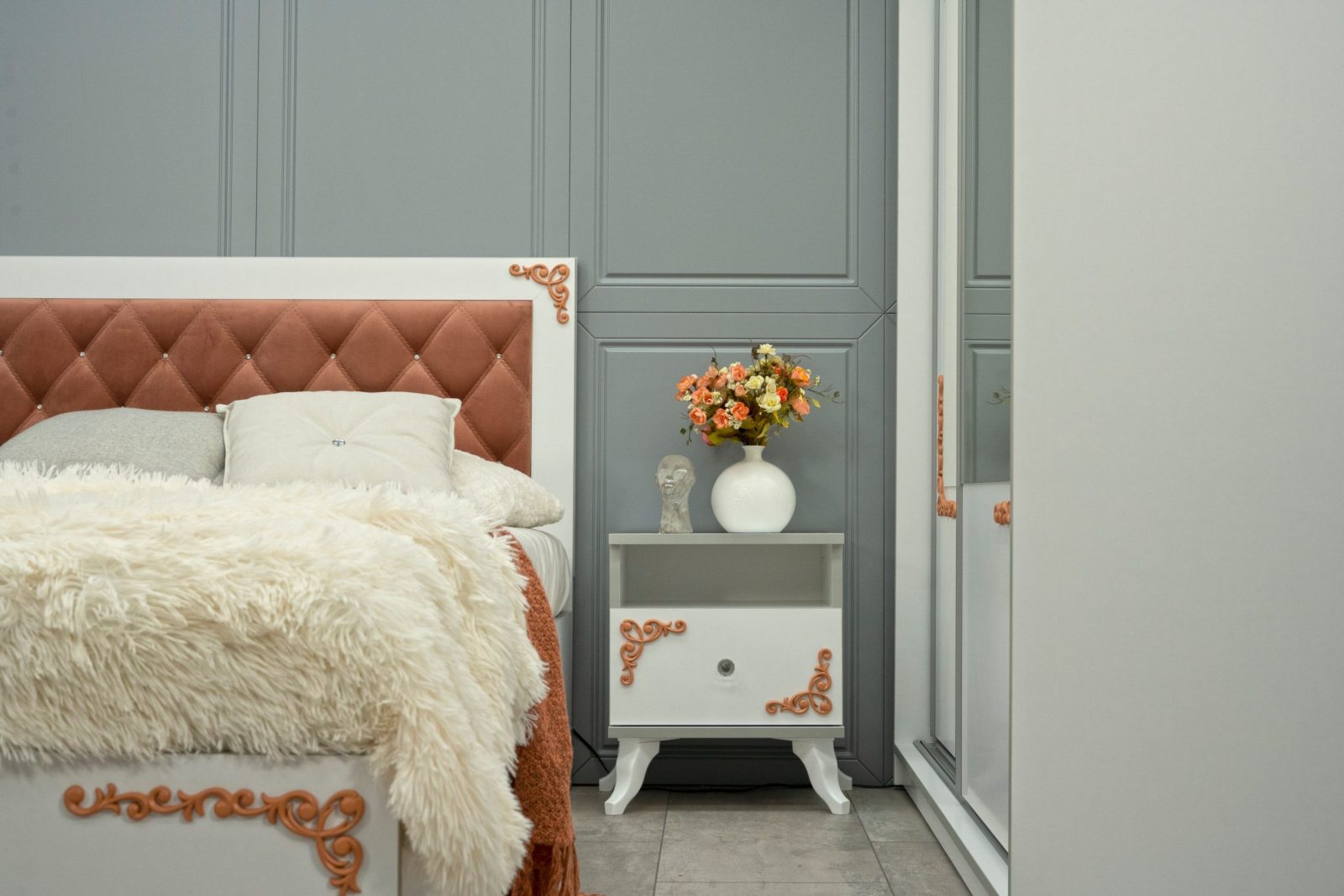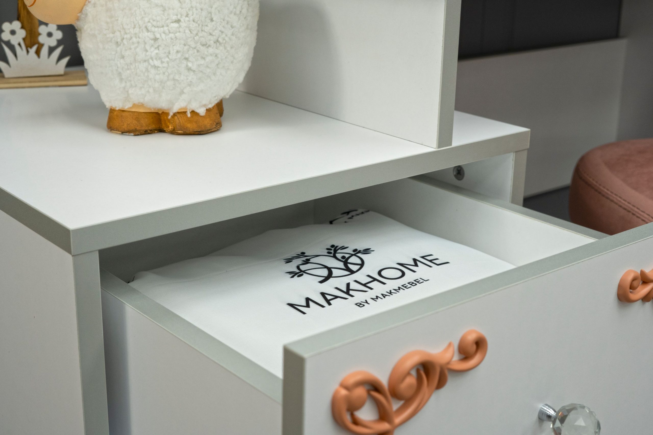 Нощно шкафче: дълбоко практично чекмедже, челото на чекмеджето е с нежни орнаменти – цвят праскова, дръжка от полиран прозрачен кристал – форма сфера, метален ролков водач, букови струговани крака – цвят бял – осигуряващи ефирност и елегантност – 1 бр. в к-т;