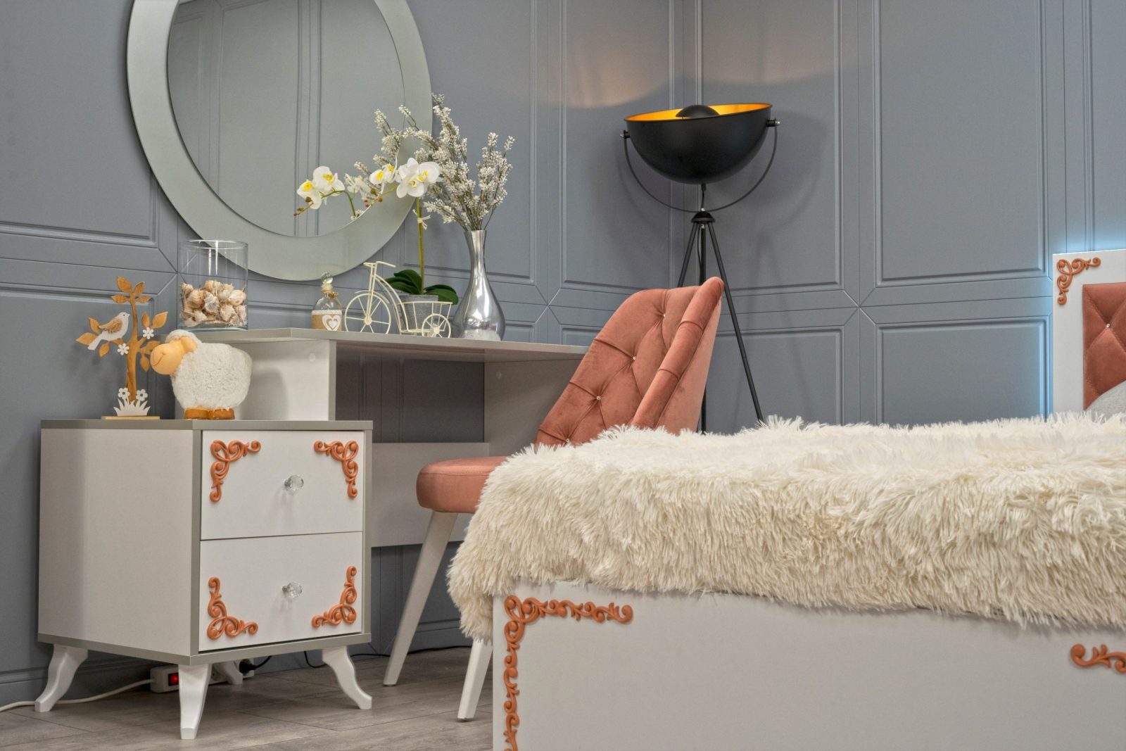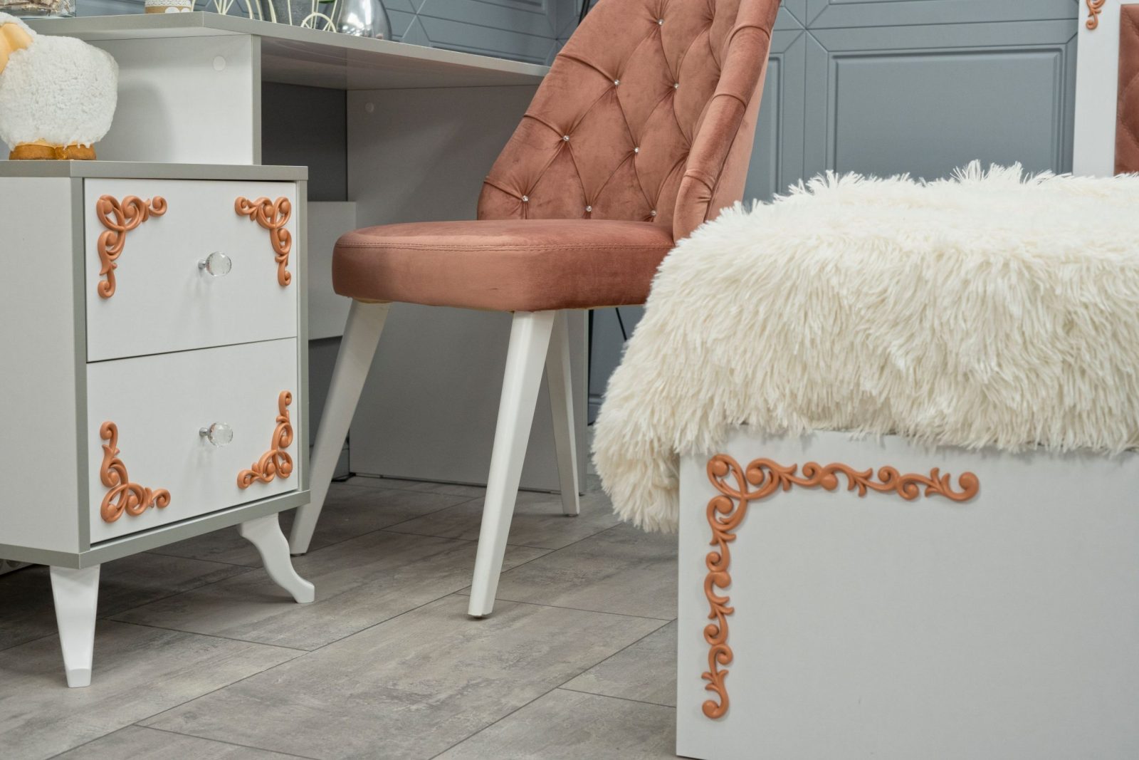 Бюро – тоалетка: две практични чекмеджета, челата на чекмеджетата се с нежни орнаменти – цвят праскова, дръжки от полиран прозрачен кристал – форма сфера, металени ролков водач, букови струговани крака – цвят бял – осигуряващи ефирност и елегантност – 1 бр. в к-т;