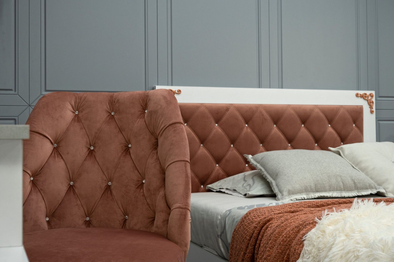 Кресло – високоизносоустойчив плюш – цвят – праскова- облегалка – ръчен свободен капитонаж – акценти – прозрачен бял кристал. Крака от масивна букова дървесина, покритие – боя – бяла – 1 бр. в к-т;