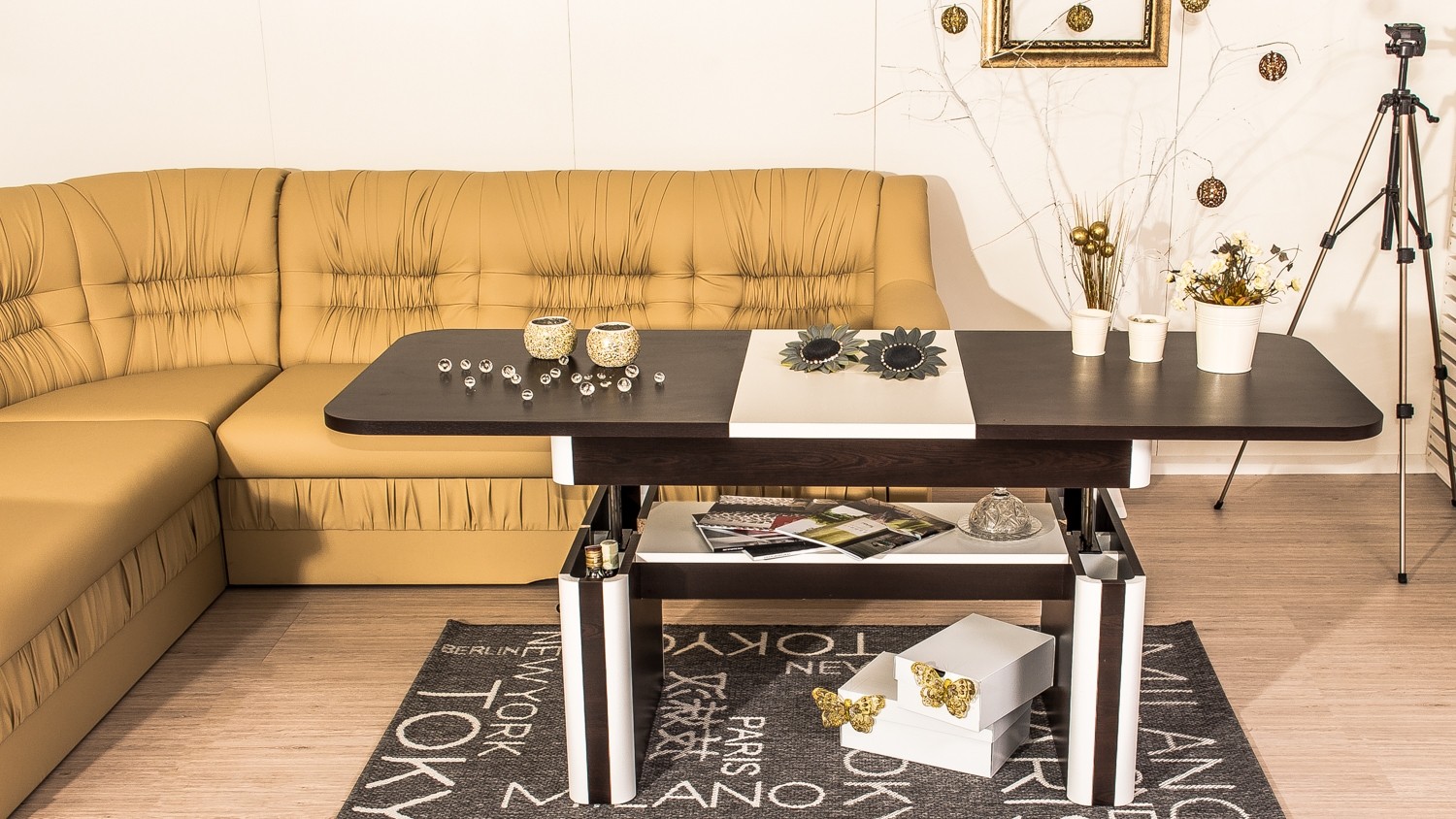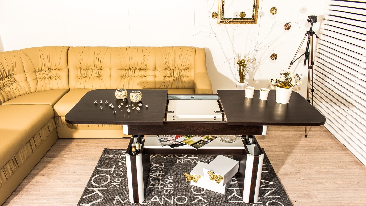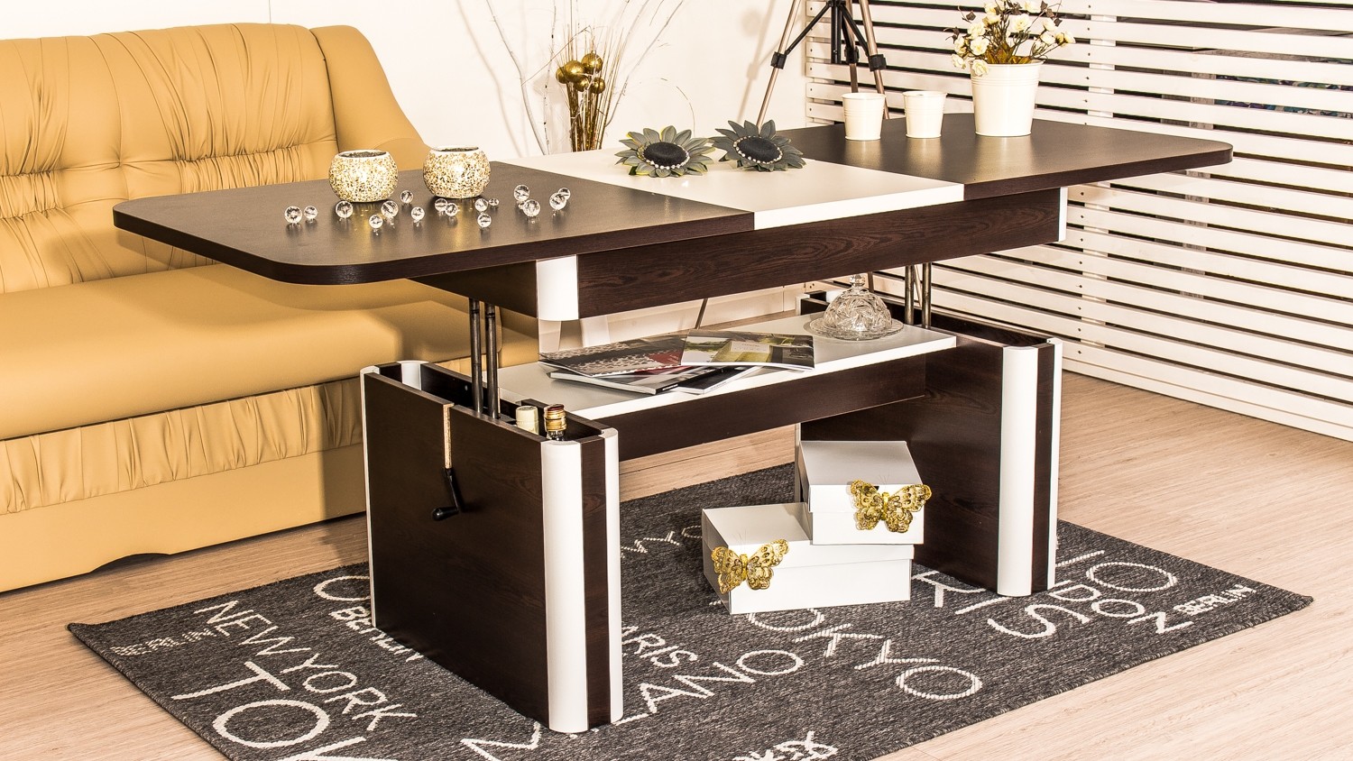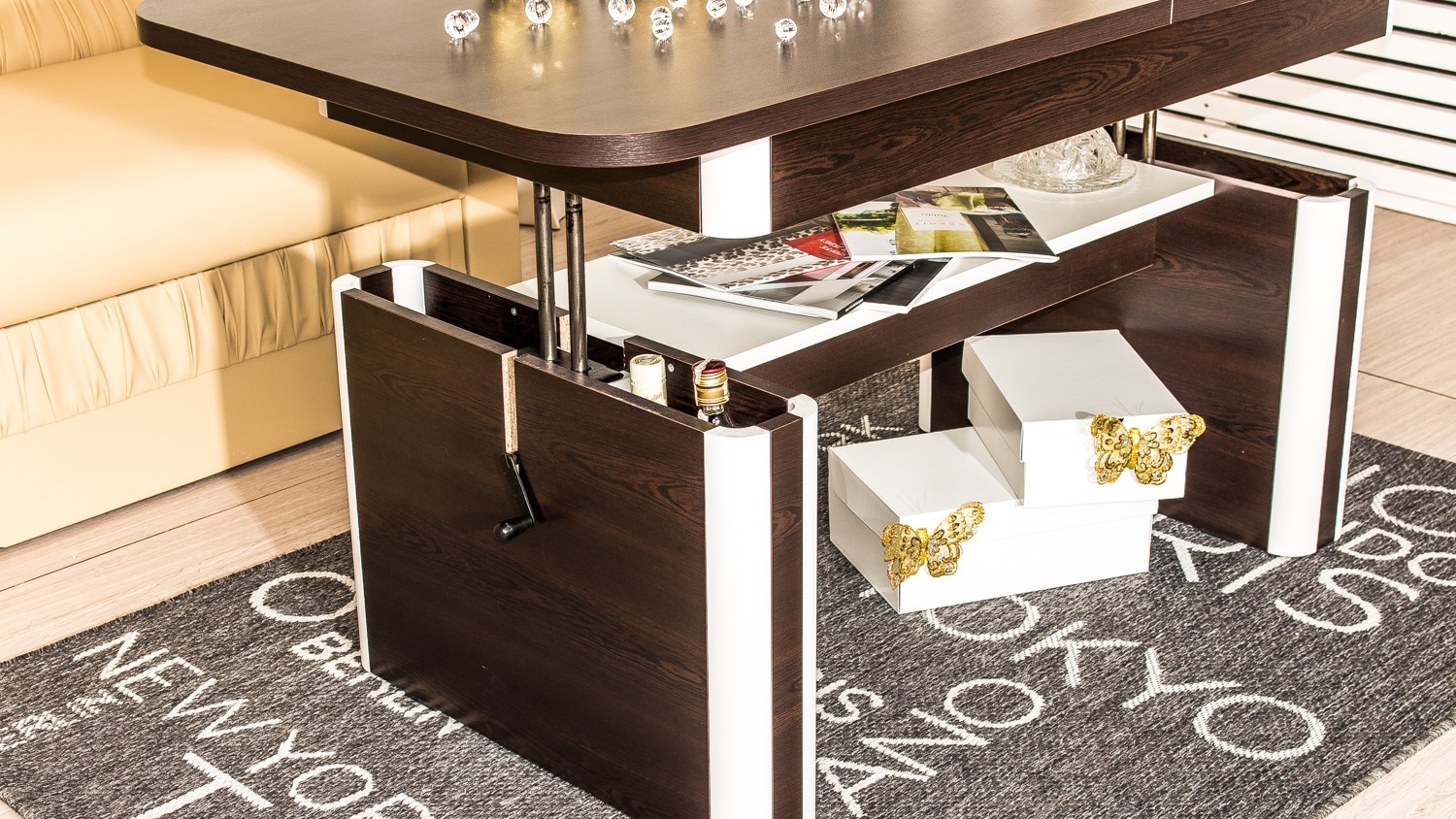 Конструкцията е изработена от  ПДЧ 18 мм, плот с дебелина 25 мм, МДФ – профили в бял цвят, метален механизъм за повдигане до желаното ниво, разтегателен плот.