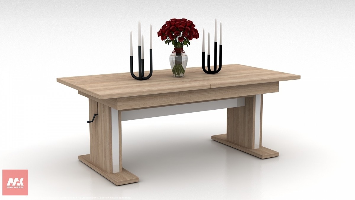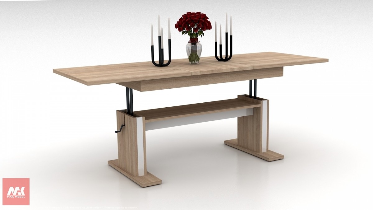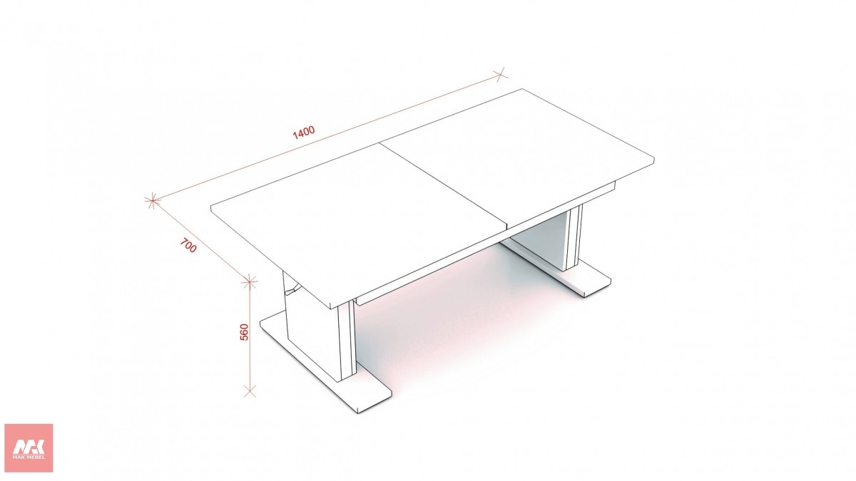 Конструкцията е изработена от ПДЧ 18 мм, плот с дебелина 25 мм, метален механизъм за повдигане до желаното ниво, разтегателен плот.