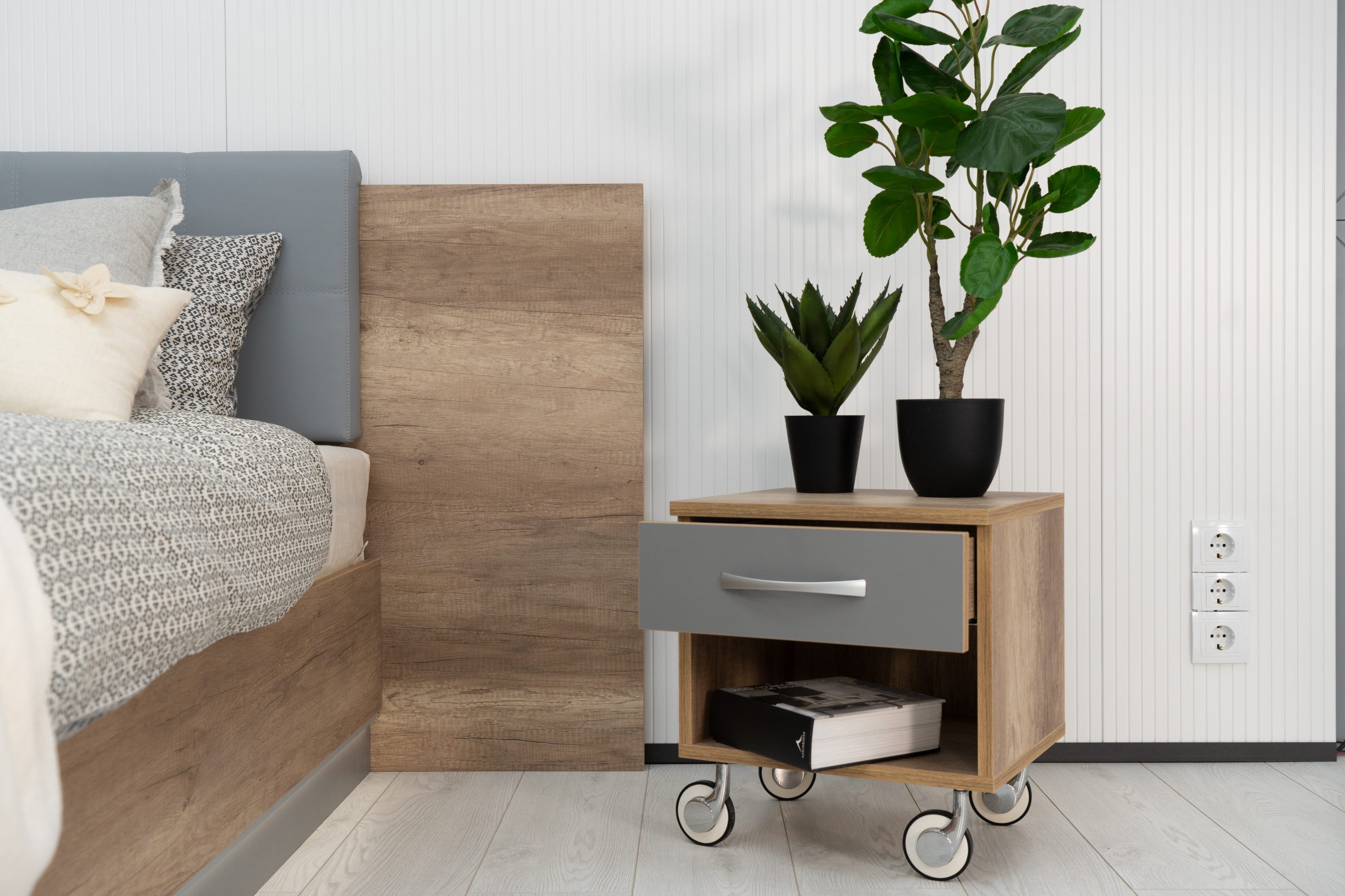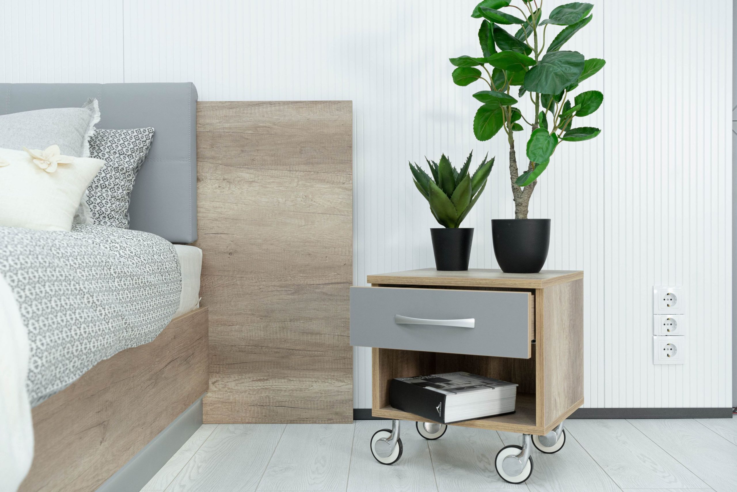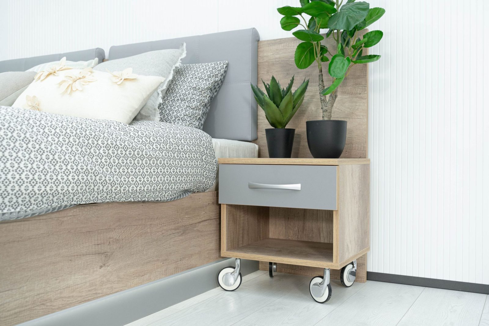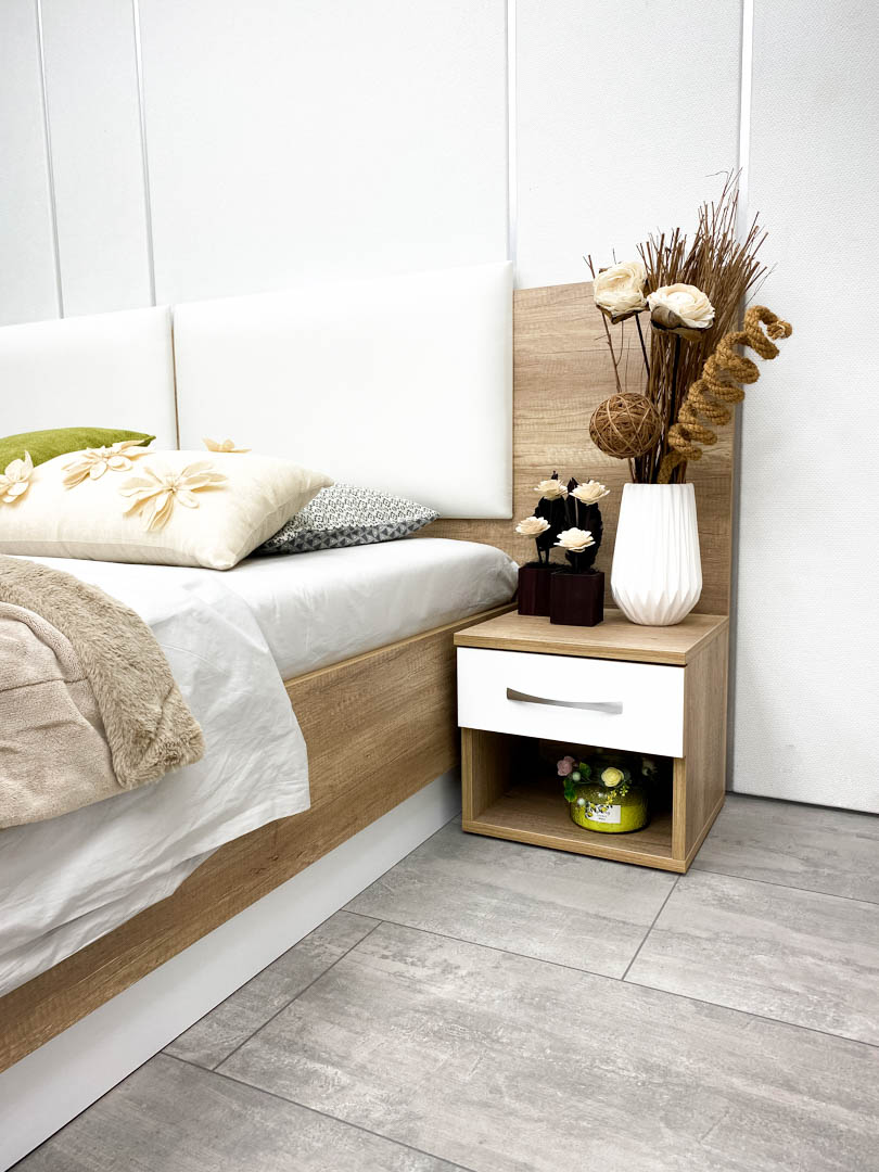Нощно шкафче: практично чекмедже и удобна ниша, дръжки – метал – иноксово покритие, система скрити водачи Quadro Hettich – плавно затваряне, лесно подвижно с метални колела – 2 бр;