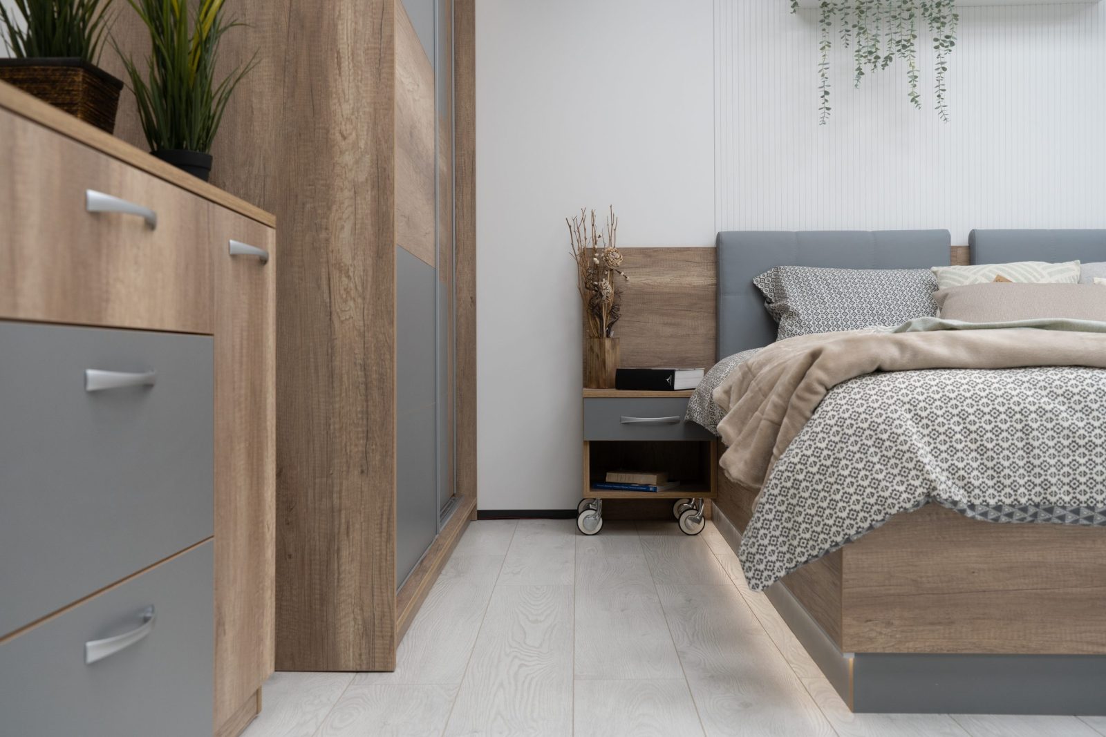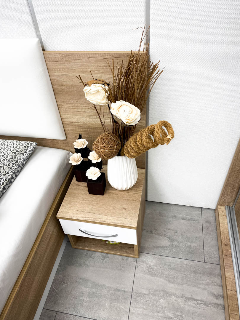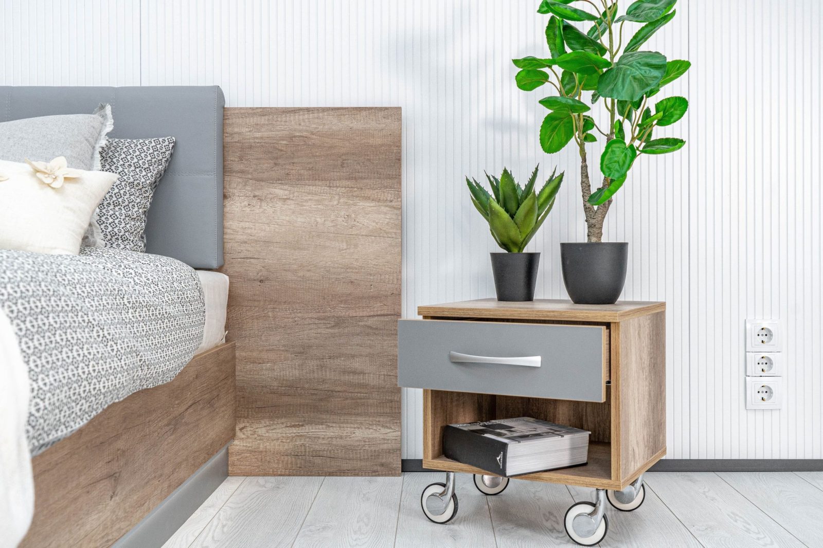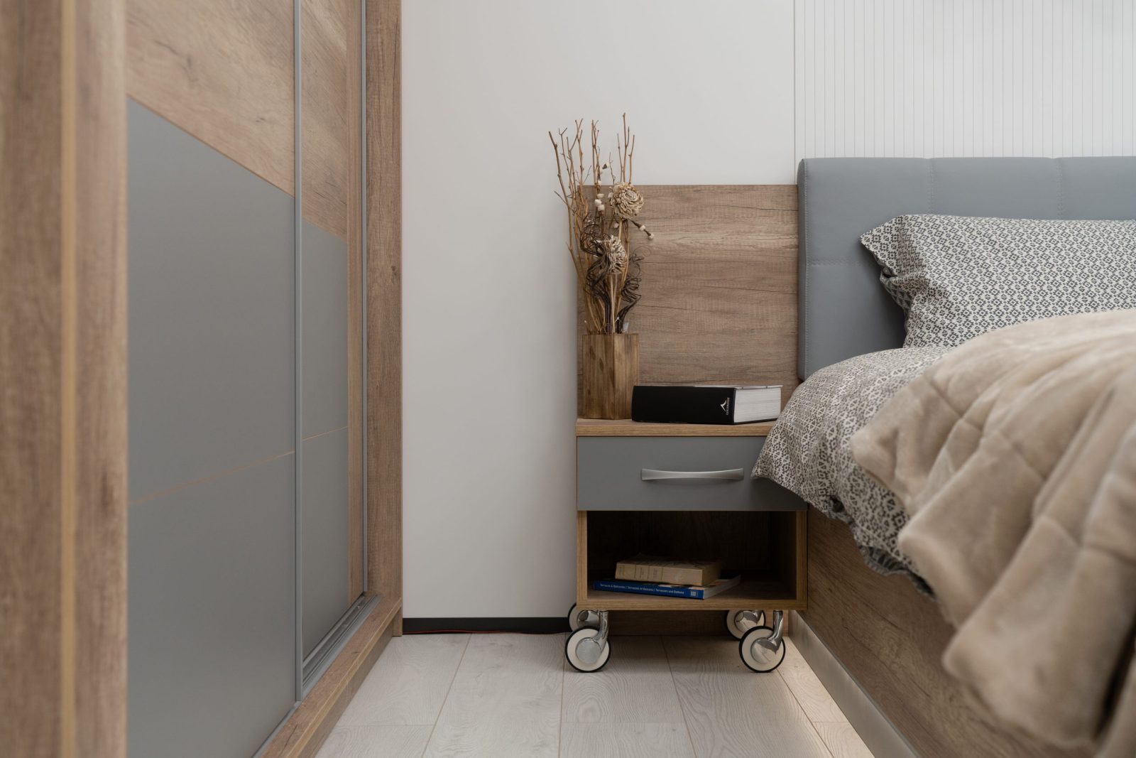 Нощно шкафче: практично чекмедже и удобна ниша, дръжки – метал – иноксово покритие, система скрити водачи Quadro Hettich – плавно затваряне, лесно подвижно с метални колела – 2 бр;