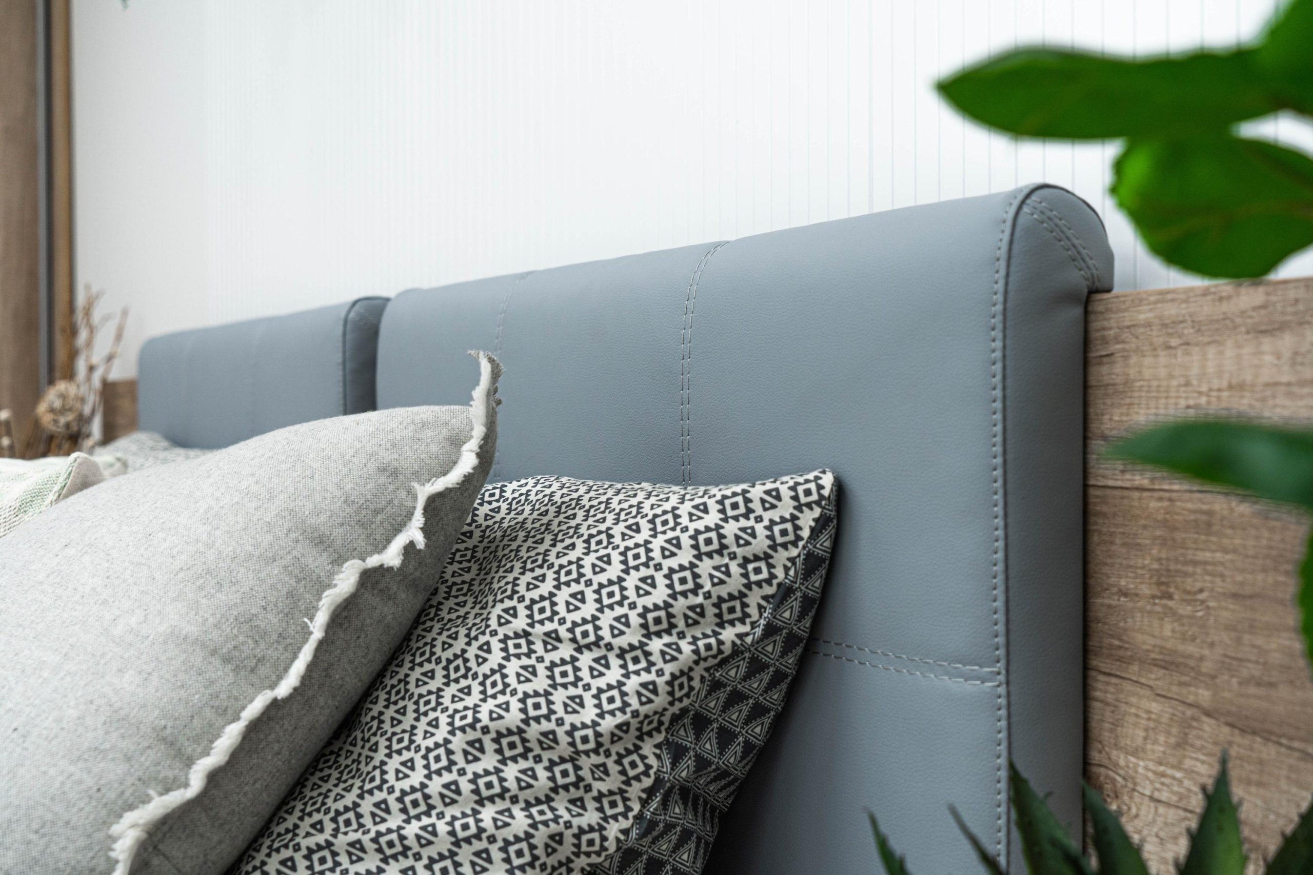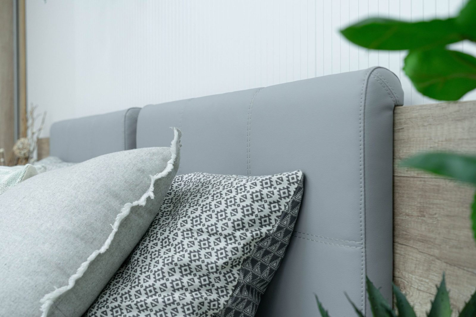 Легло: основна табла – декор – аляска фрезе – декорирана от елегантни тапицирани табли с високо износоустойчива еко кожа, цвят – светло сив, база за матрак с вътрешен мост – гарантиращ прав диагонал на леглото, царги – сдвоени обща дебелина 36 мм, всички използвани сглобки са скрит монтаж – 1 бр.