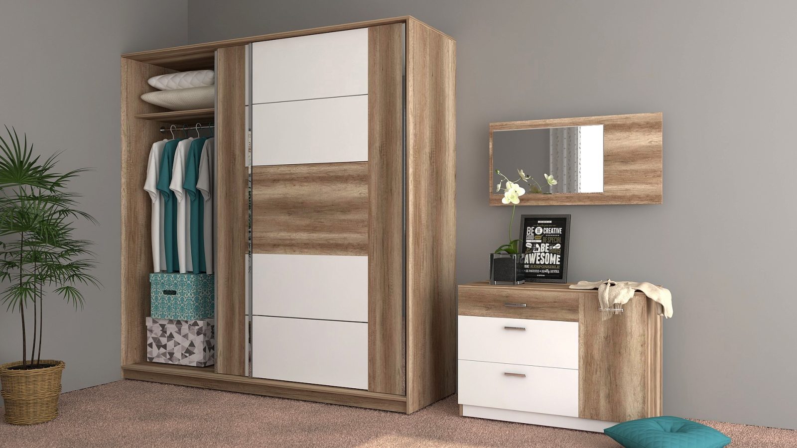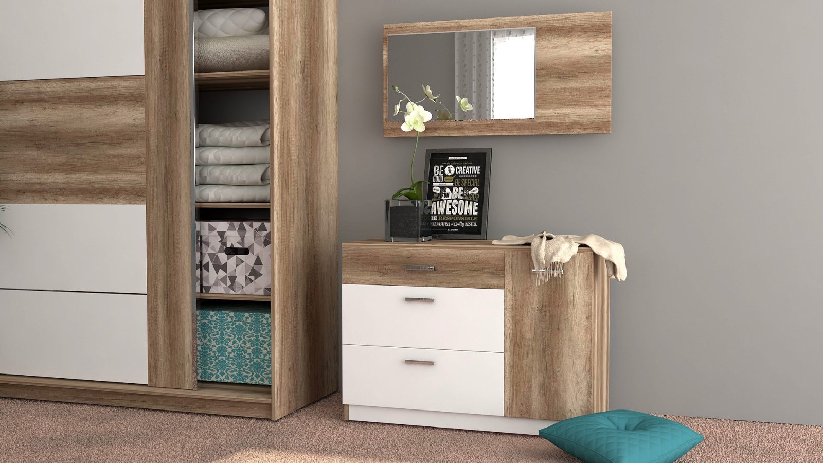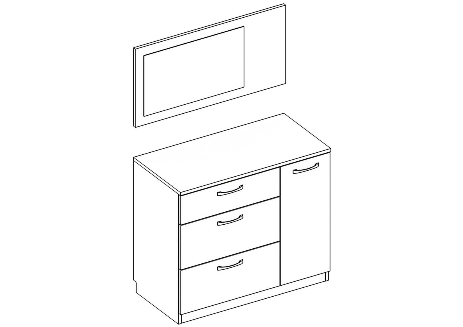 Скрин с огледало – Опция! три практични чекмеджета, страничен шкаф с рафт, дръжки – метал – иноксово покритие, система скрити водачи Quadro Hettich – плавно затваряне, панти – плавно затваряне, пано с огледало – позиционирано за стенен монтаж;