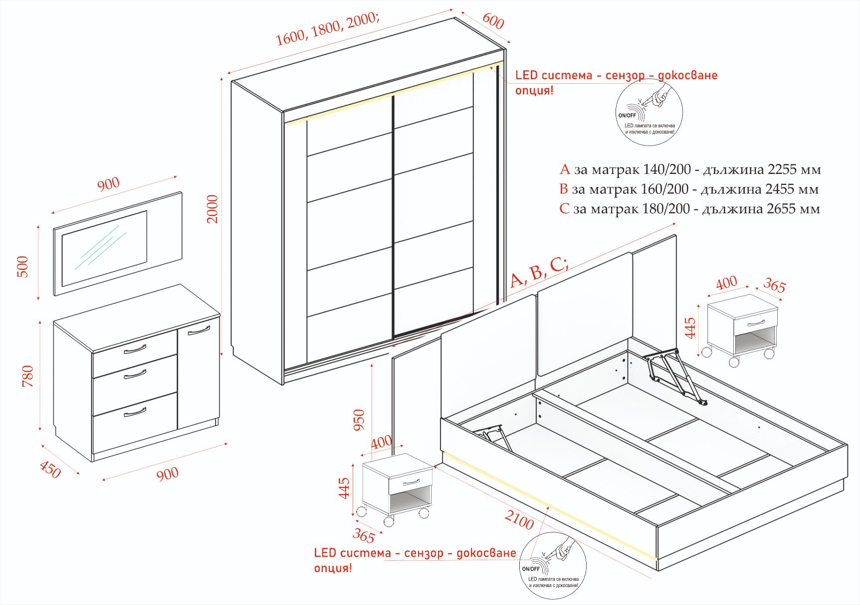 5. За представените снимки СК ”Аляска” е с монтиран двулицев матрак и подматрачна ламелна рамка. Спалния комплект се предлага без тези изделия и те са допълнителни опции с допълнително заплащане (виж съответната категория)!