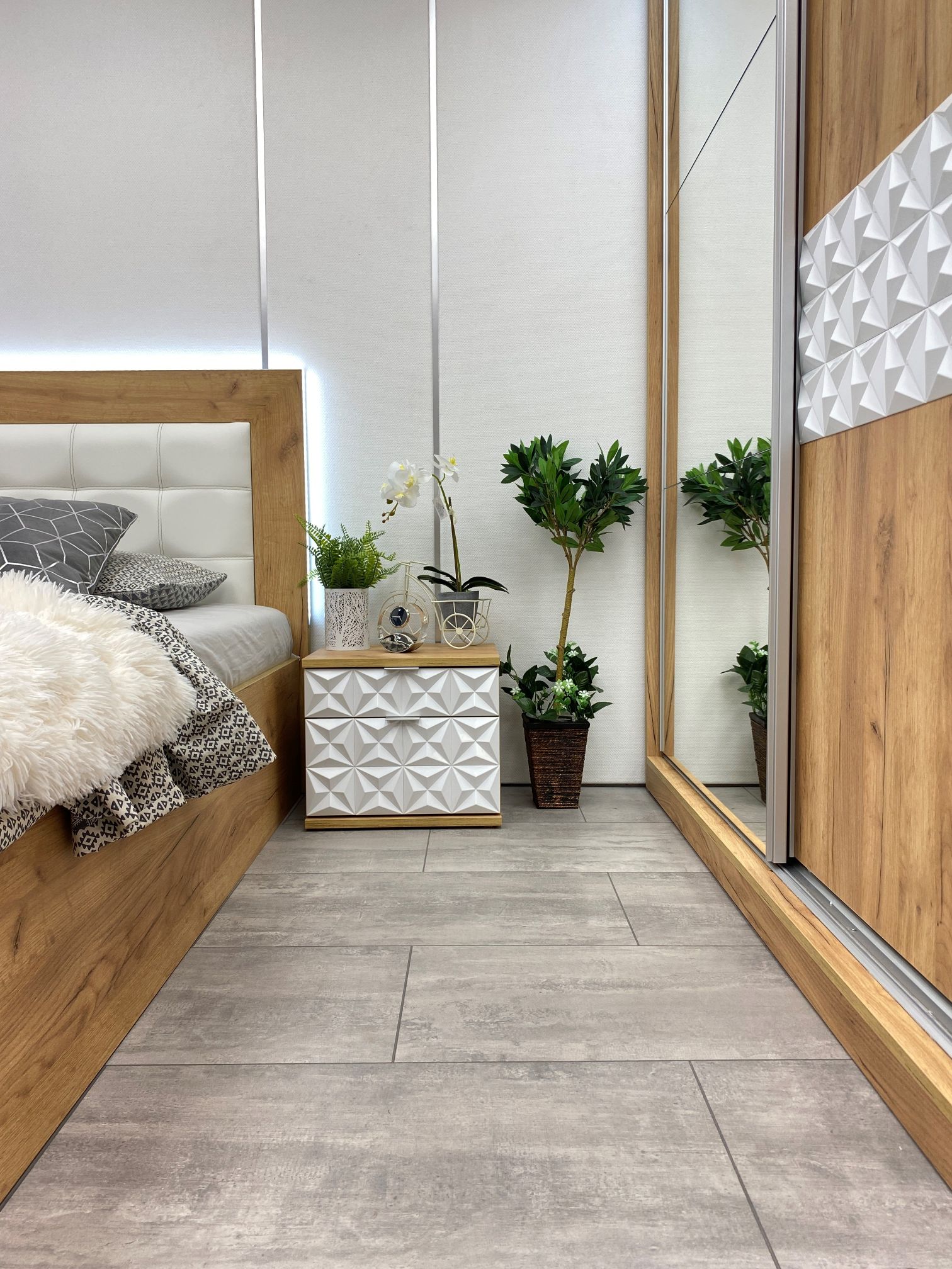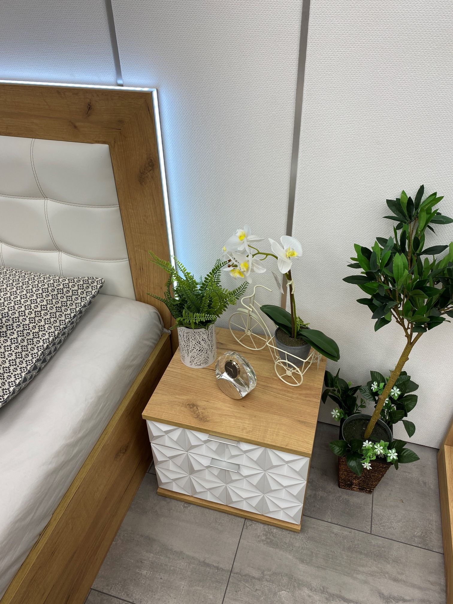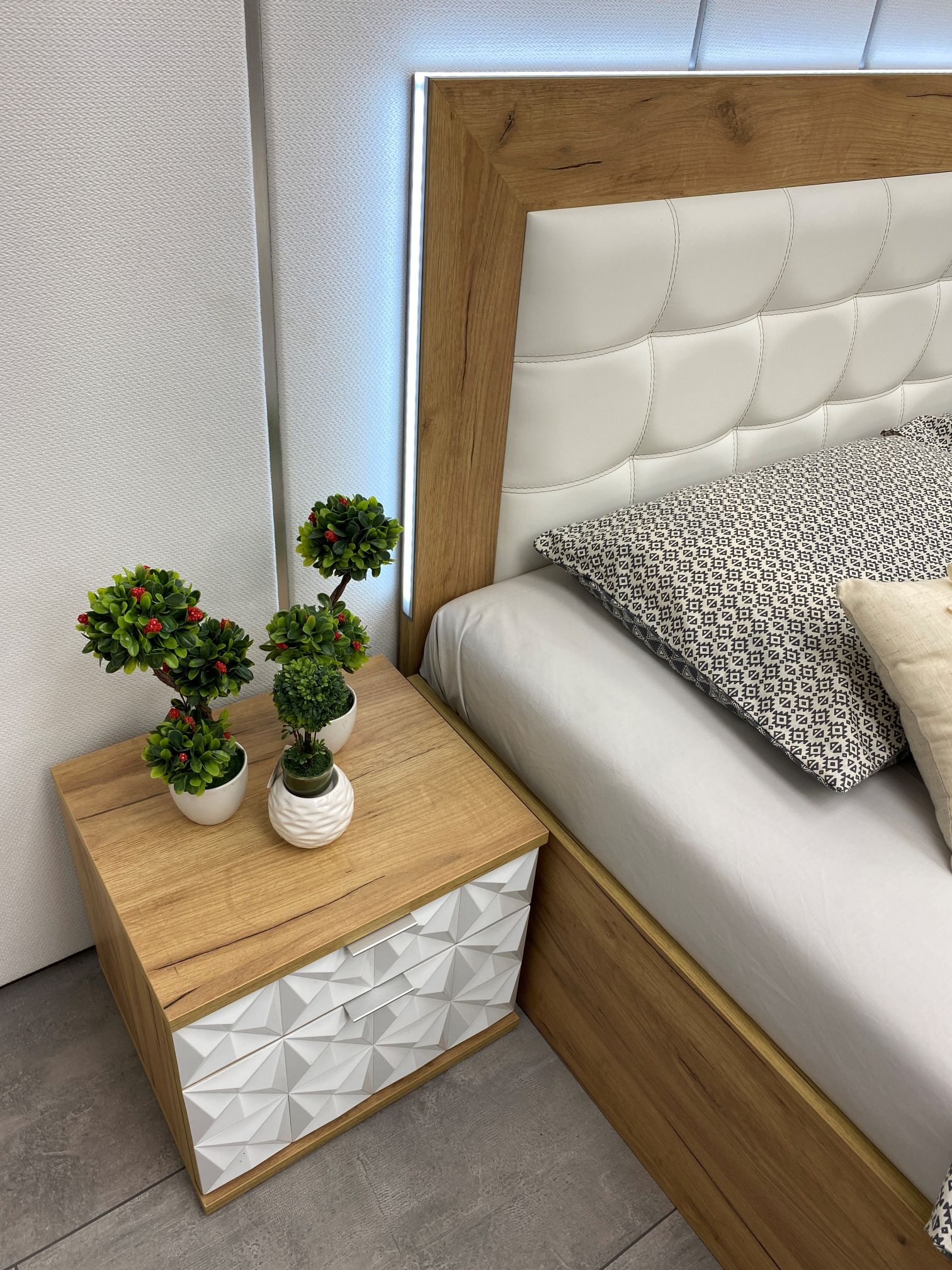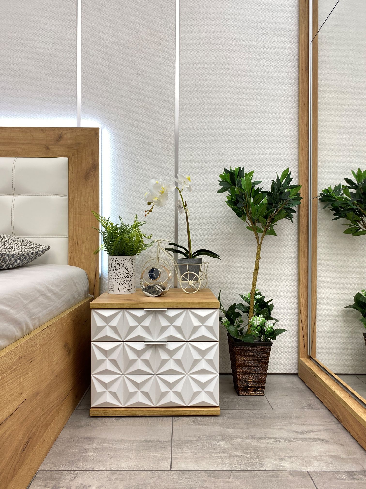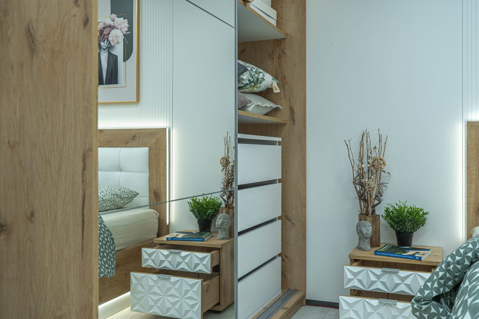 Нощно шкафче: две практични чекмеджета, система скрити водачи Quadro Hettich – плавно затваряне, челото на чекмеджето е изцяло от луксозни гланцови бели призми, дръжки вградени по канта – 2 бр. в к-т;