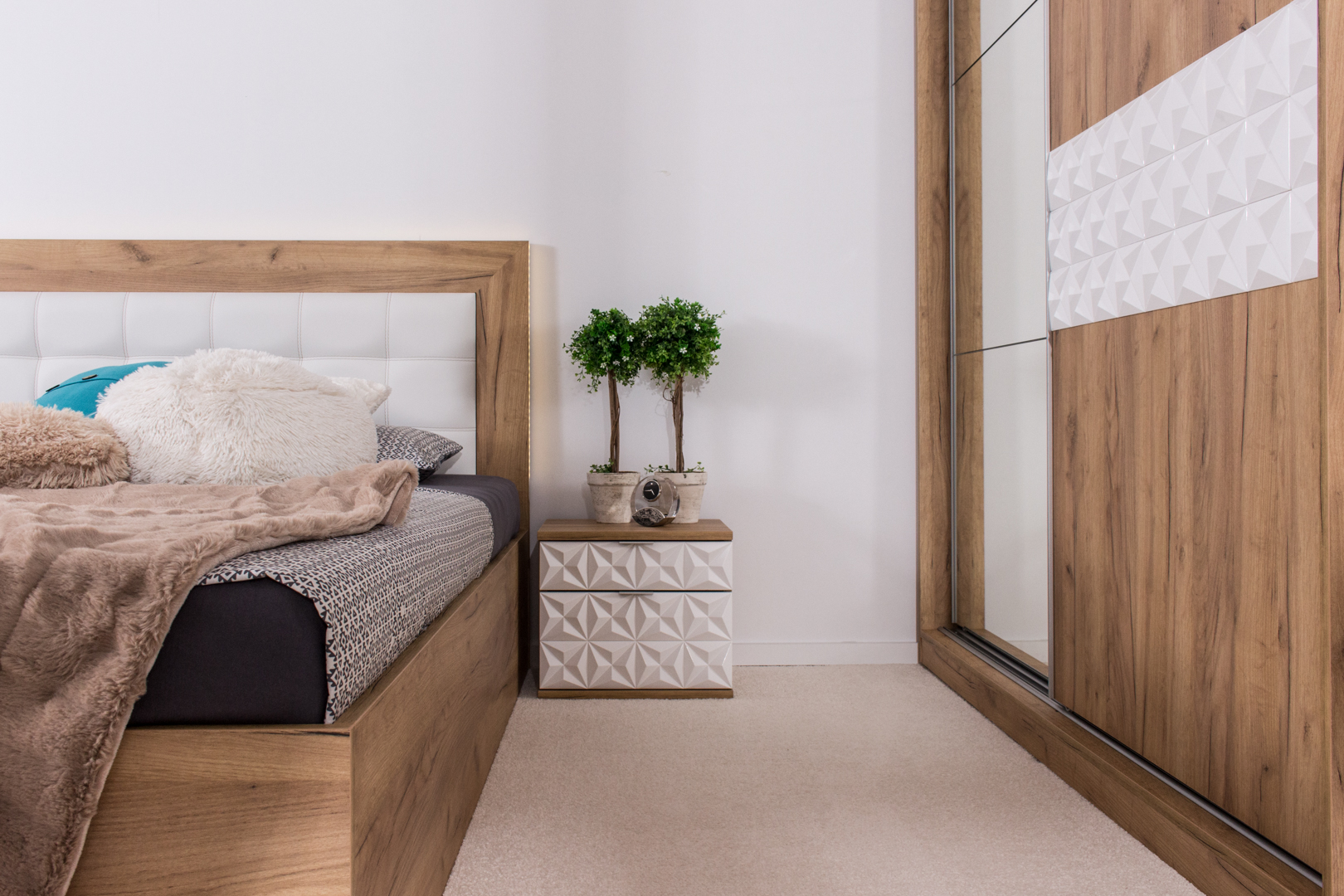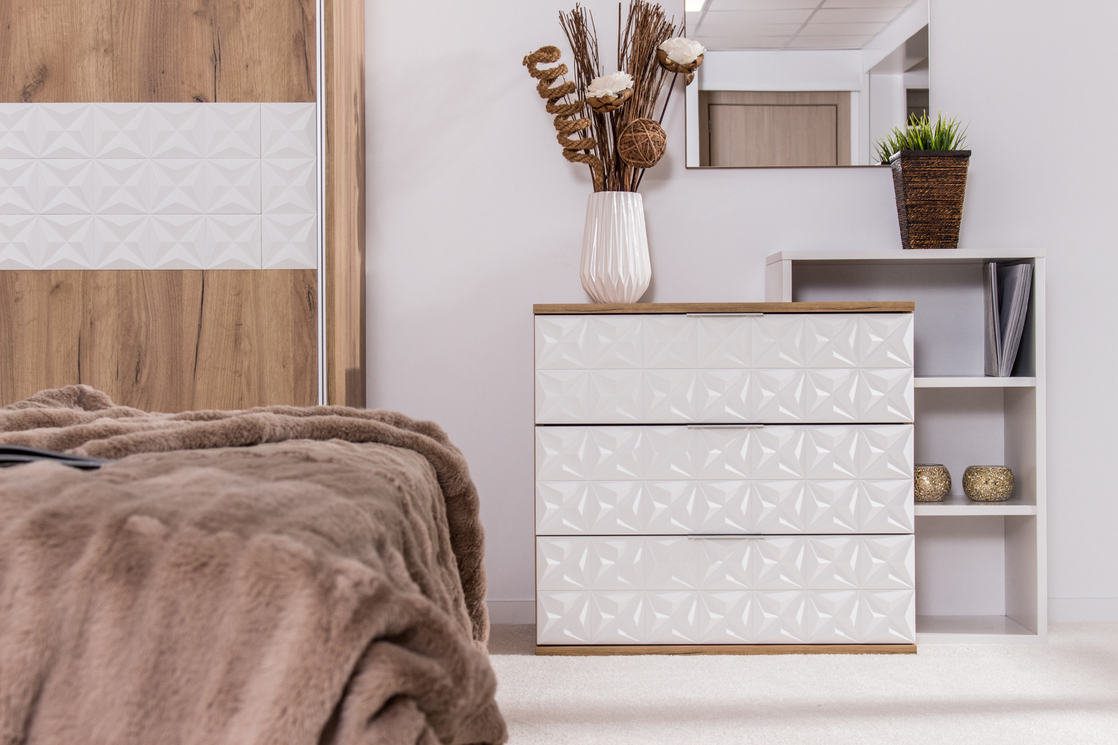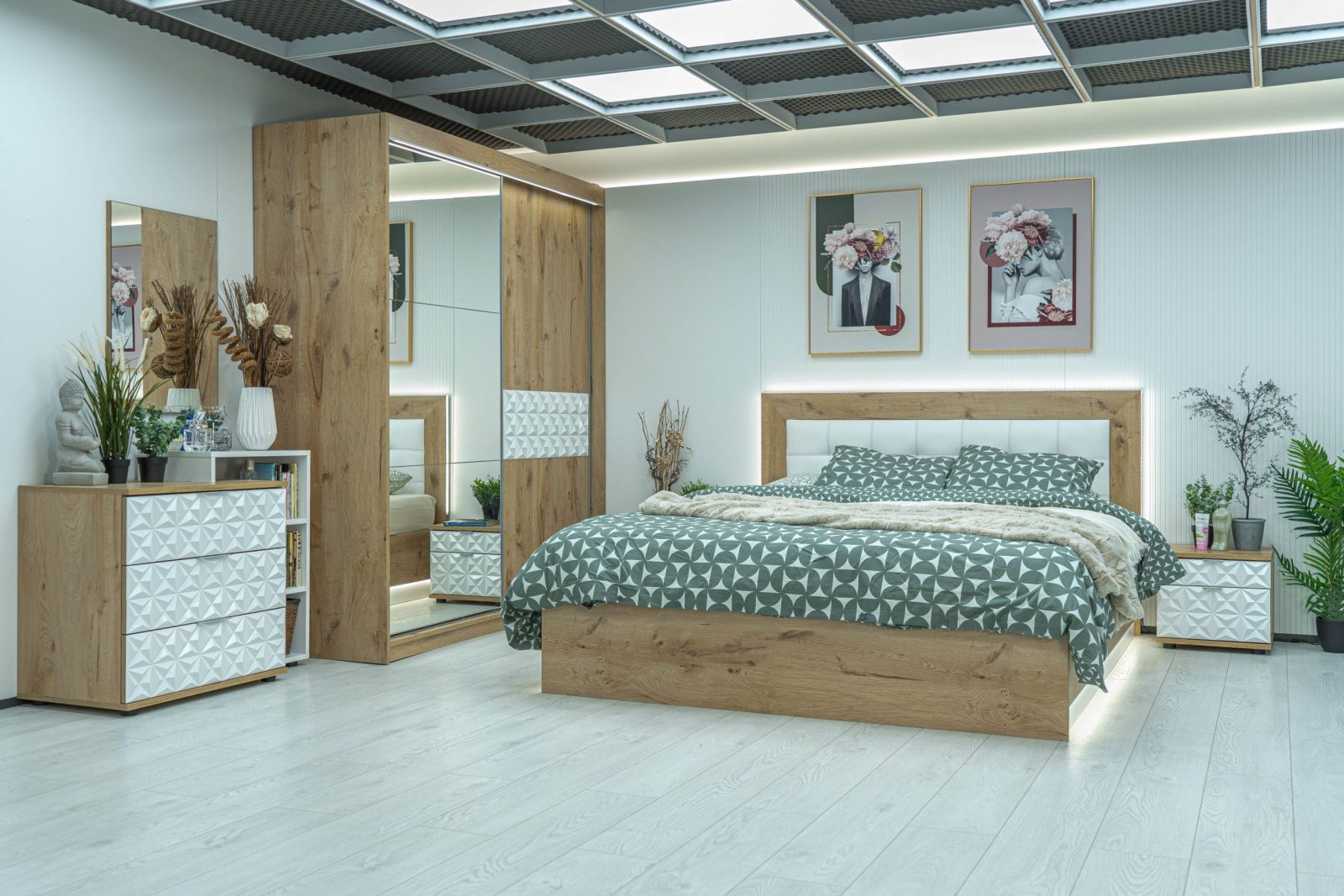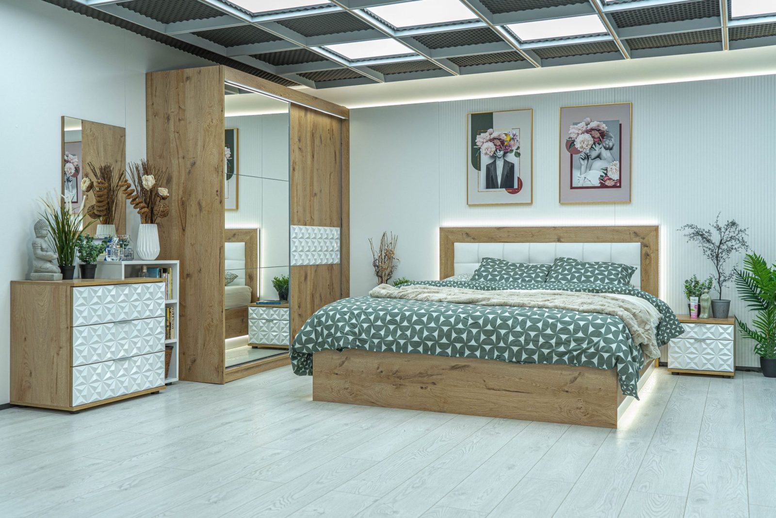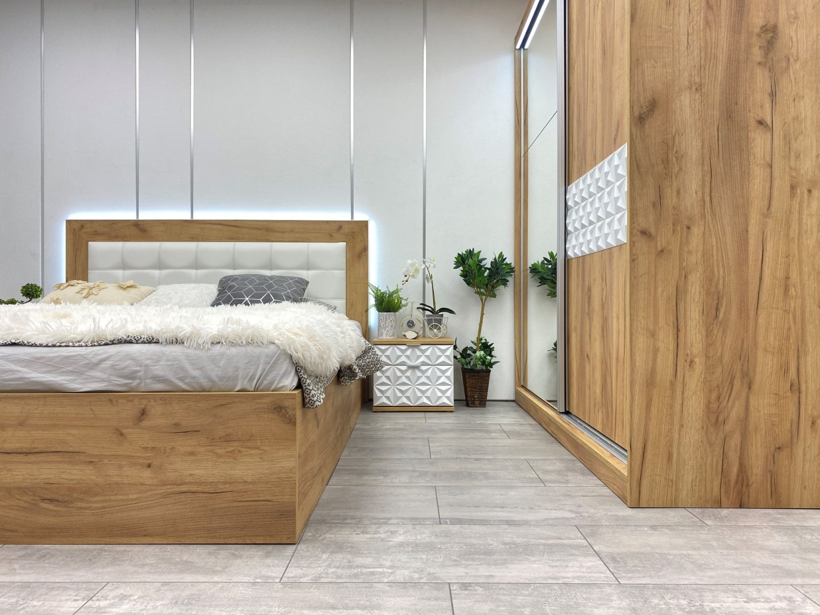 Нощно шкафче: две практични чекмеджета, система скрити водачи Quadro Hettich – плавно затваряне, челото на чекмеджето е изцяло от луксозни гланцови бели призми, дръжки вградени по канта – 2 бр. в к-т;