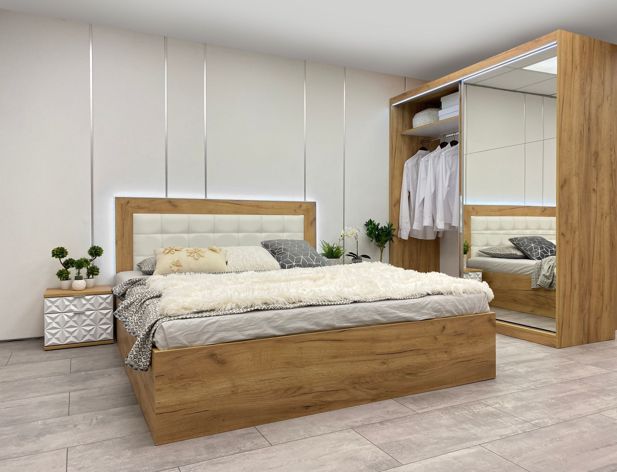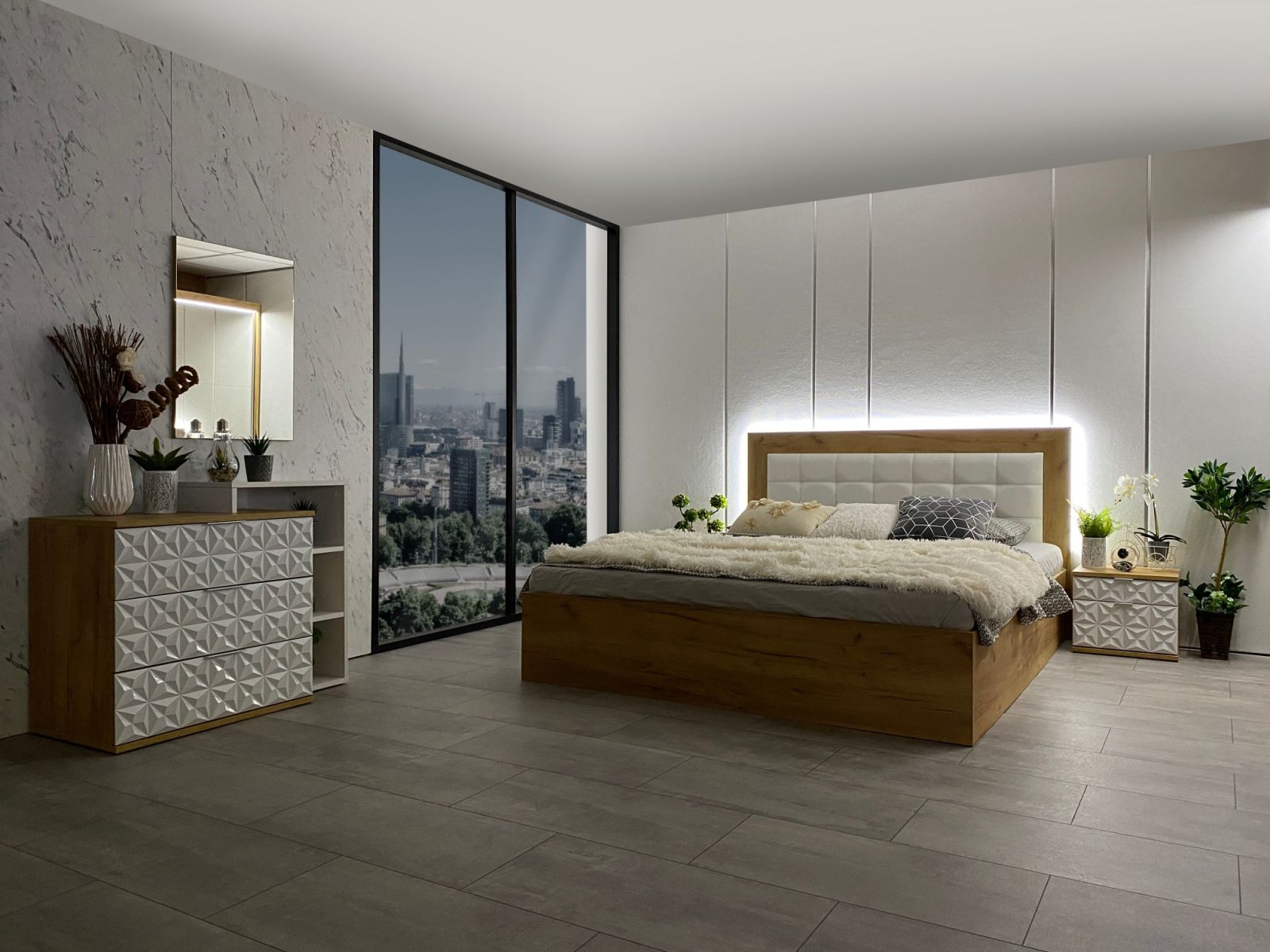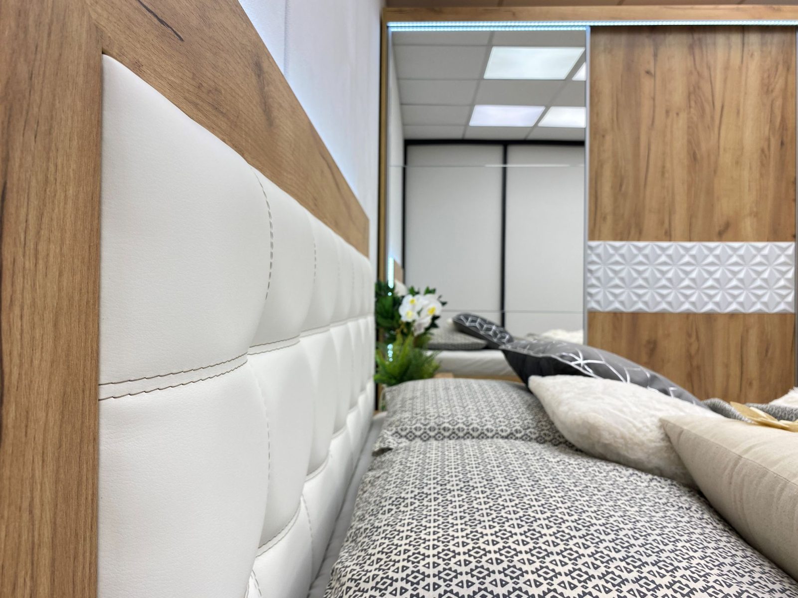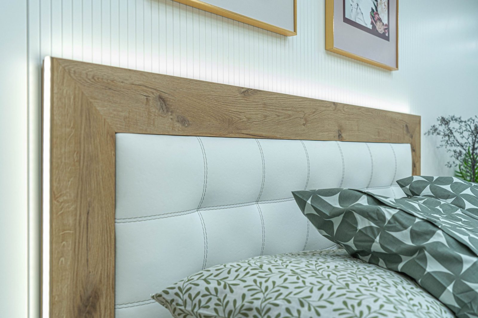 Легло: основна табла с дебелина 36 мм, по дебелината на таблата е вградено LED осветление командвано от дистанционно с опция за регулиране силата на светлина, вградена елегантна табла с двоен лицев шев изпълнение тип „квадрат“ от високо износоустойчива еко кожа цвят – бял. Всички използвани сглобки са метални – скрит монтаж. Базата за матрак е вграден вътрешен мост гарантиращ прав диагонал на леглото. LED система на царгите – опция!