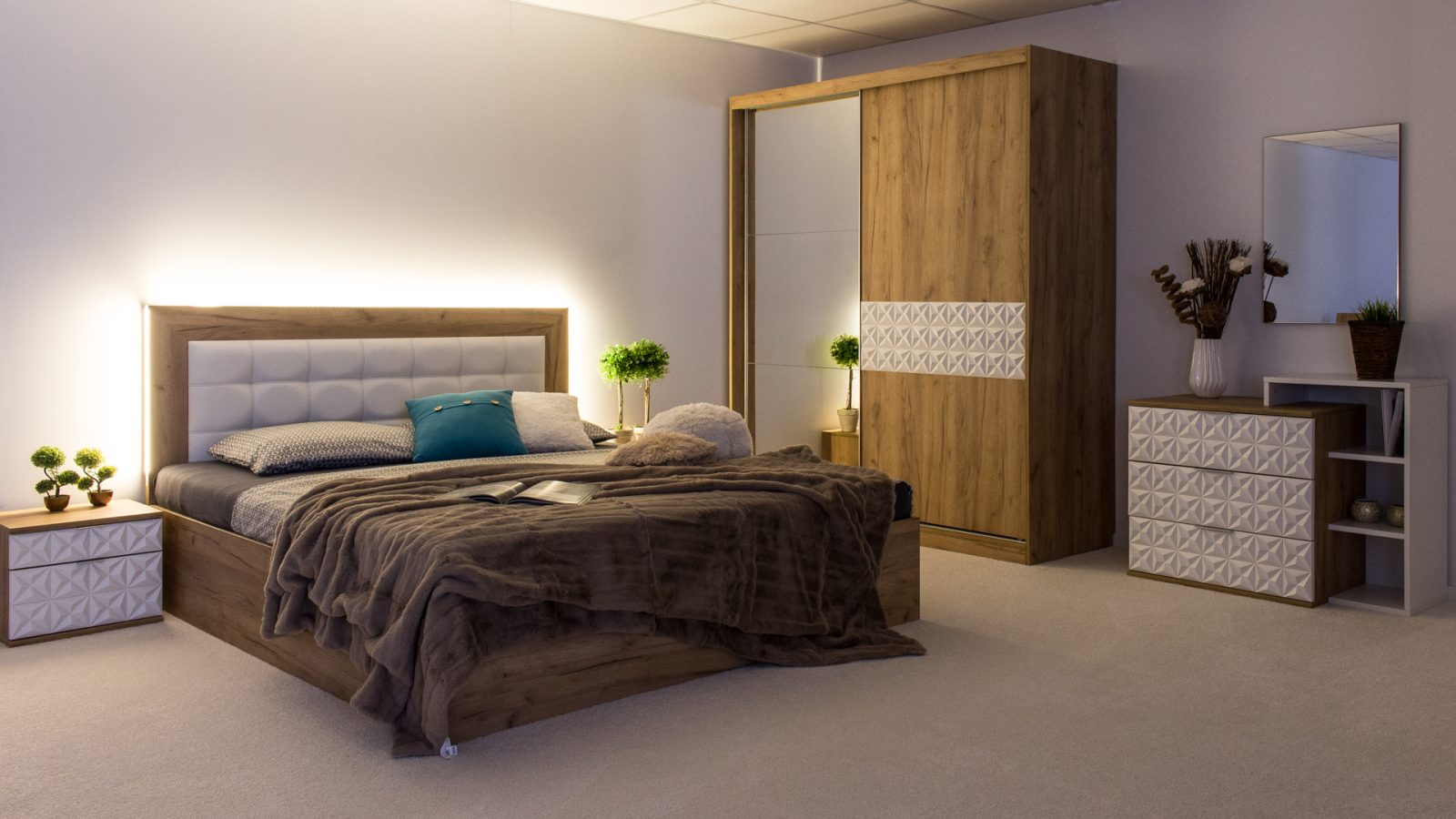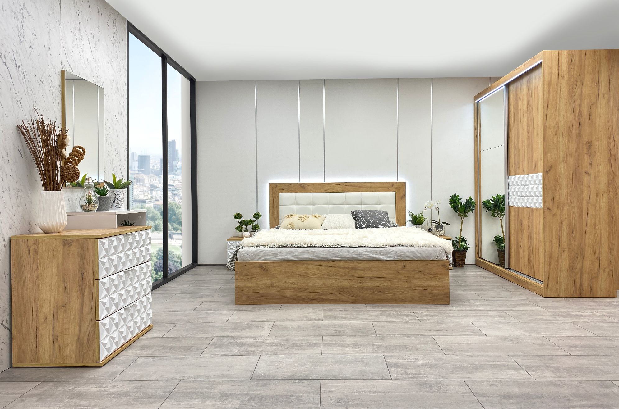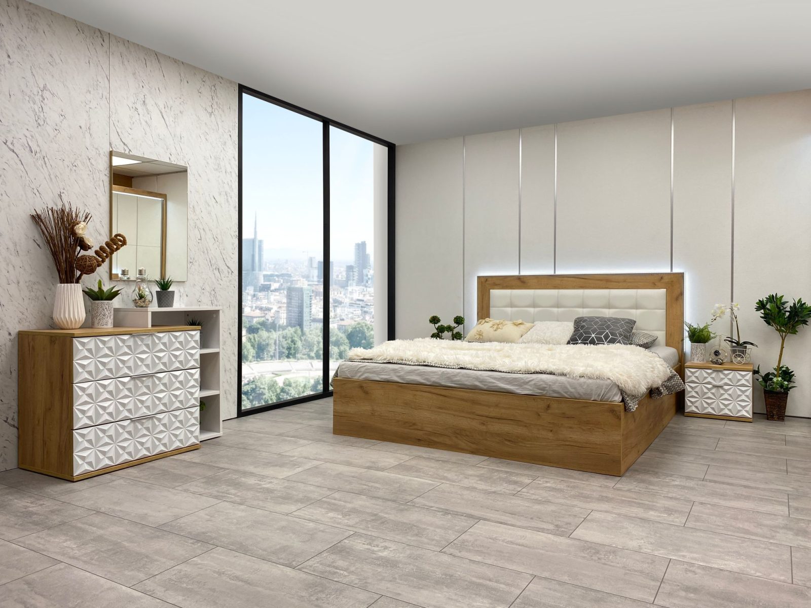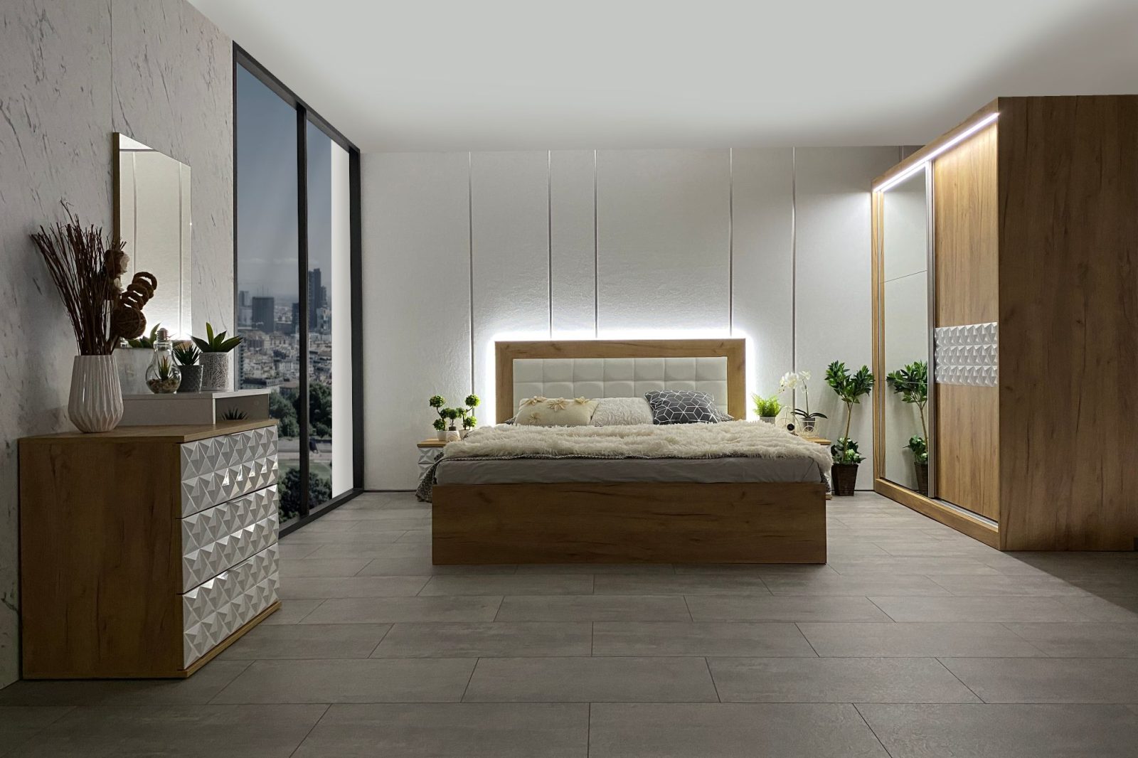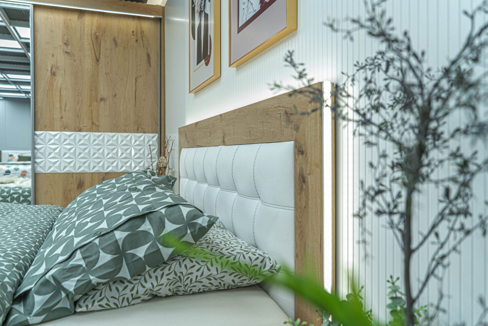 Легло: основна табла с дебелина 36 мм, по дебелината на таблата е вградено LED осветление командвано от дистанционно с опция за регулиране силата на светлина, вградена елегантна табла с двоен лицев шев изпълнение тип „квадрат“ от високо износоустойчива еко кожа цвят – бял. Всички използвани сглобки са метални – скрит монтаж. Базата за матрак е вграден вътрешен мост гарантиращ прав диагонал на леглото. LED система на царгите – опция!