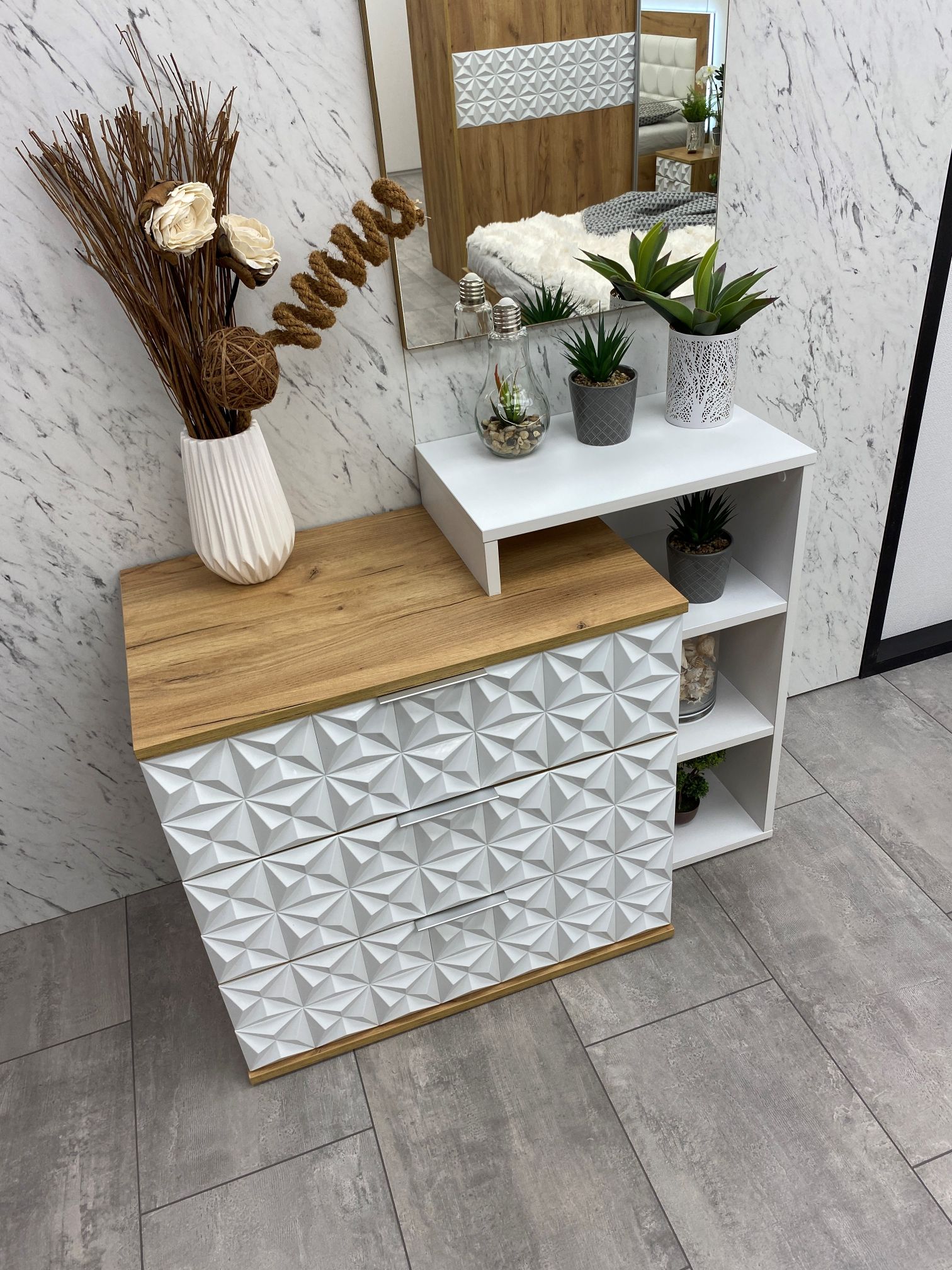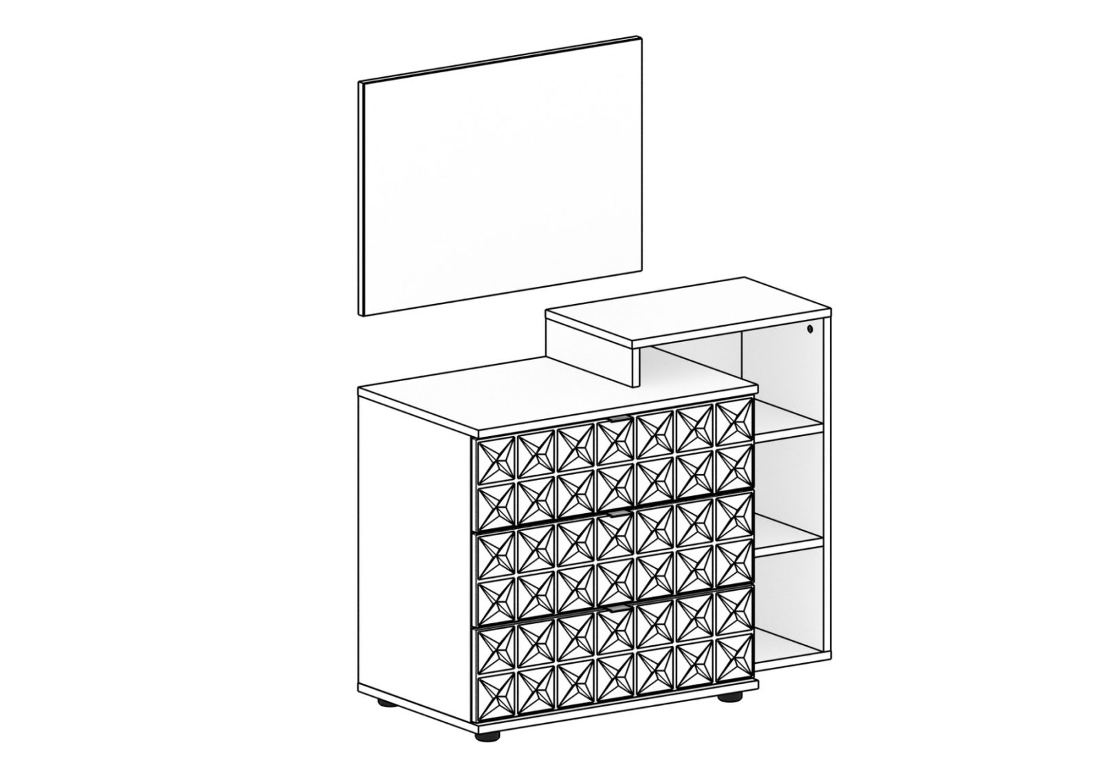 Скрин с огледало – Опция! три практични чекмеджета, система скрити водачи Quadro Hettich – плавно затваряне, пано с вградено – огледало, странична вградена открита етажерка, челата на скрина са изцяло от луксозни бели гланцови призми, всички дръжки са вградени по канта, огледалото е ориентирано за стенен монтаж;