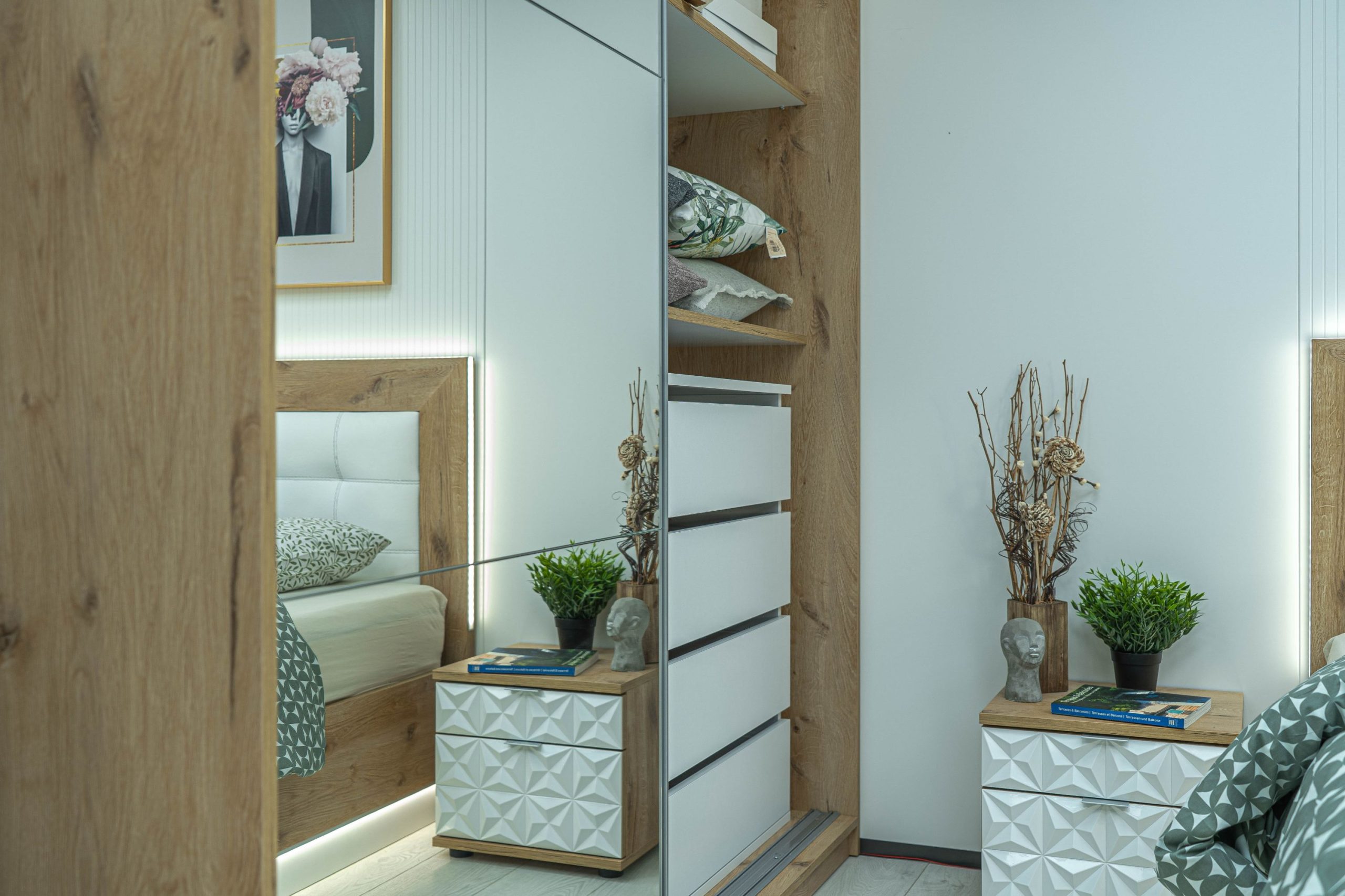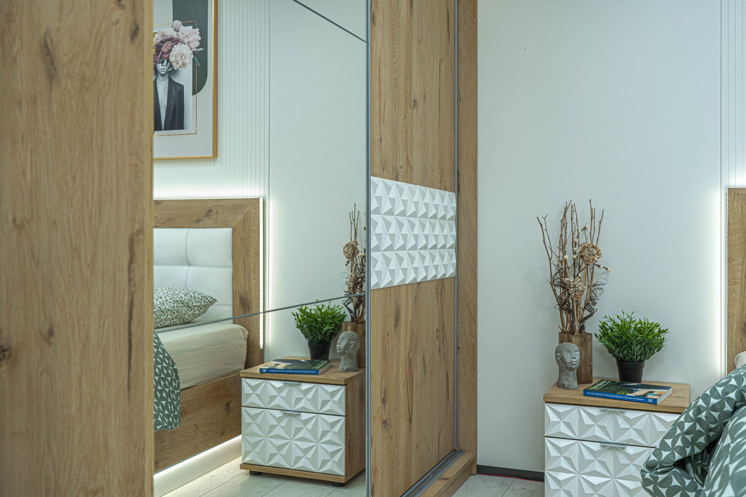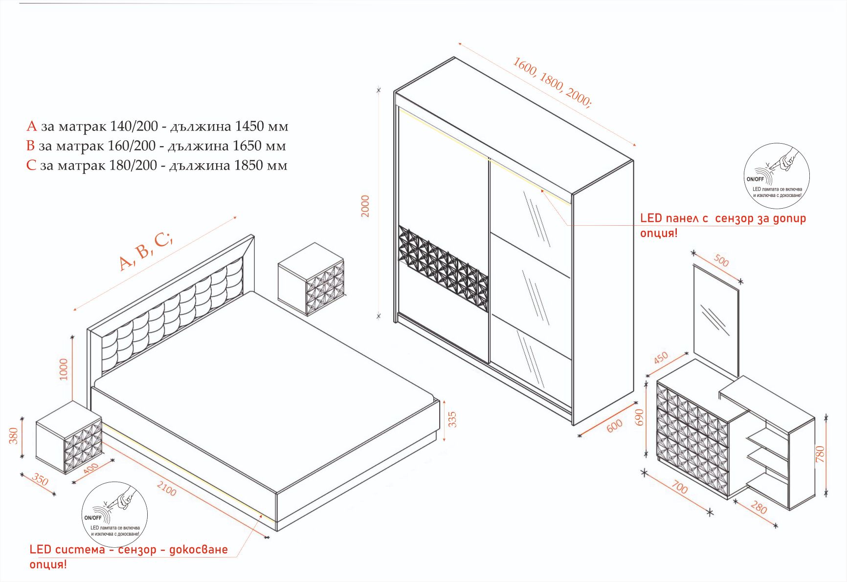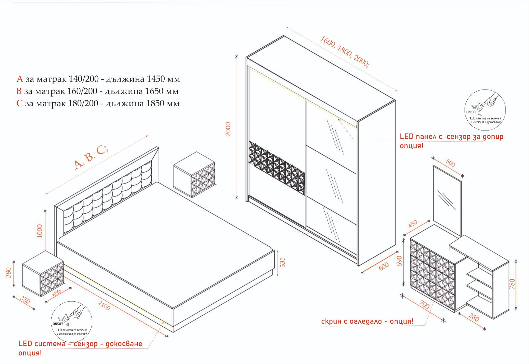 Гардероб: плъзгаща система вътрешно водене, вертикално разположени вградени алуминиеви „П“- образни кант дръжки, спомагащи ефективното плъзгане на системата – гарантиращи устойчивост и здравина на вратите, вградени огледала на едната врата, използвани са сглобки – скрит монтаж, метални рафтоносачи за стабилност на рафтовете, лост за дрехи – метален – форма – елипса – покритие – никел, цялата конструкция на гардероба е монтирана върху метални реглажни „пети“ – осигуряващи изрядна нивелация на изделието и правилната му експлоатация, луксозни завършващи детайли от бели гланцови призми. Осветителен LED панел – опция!