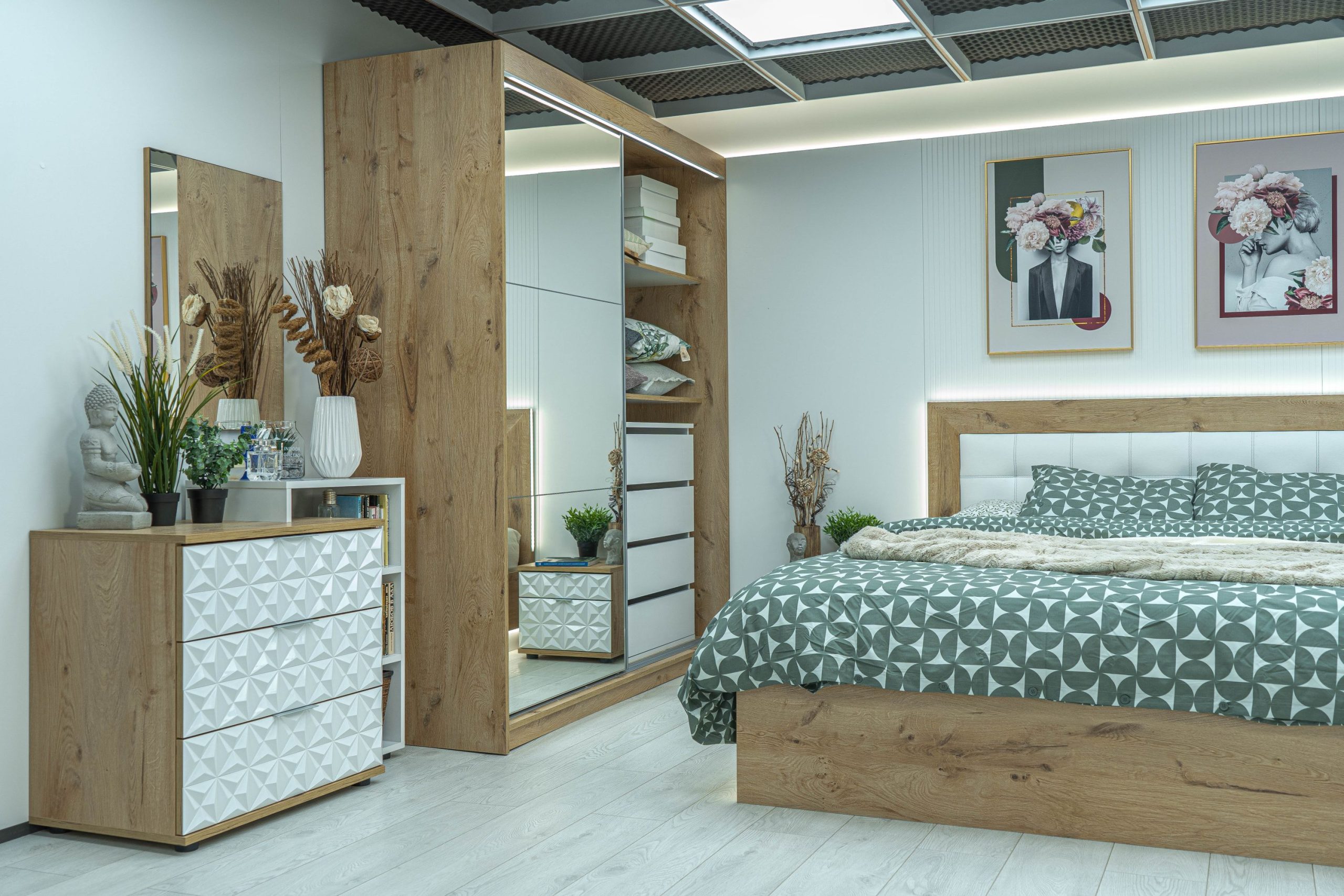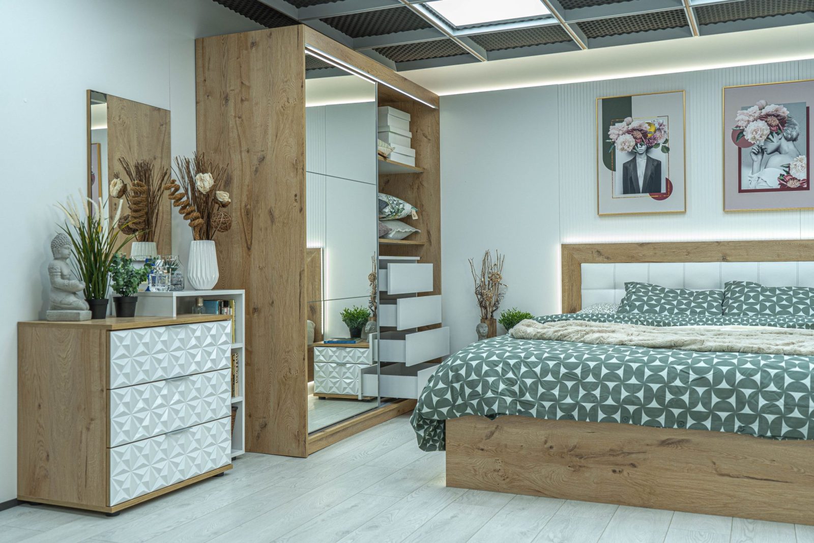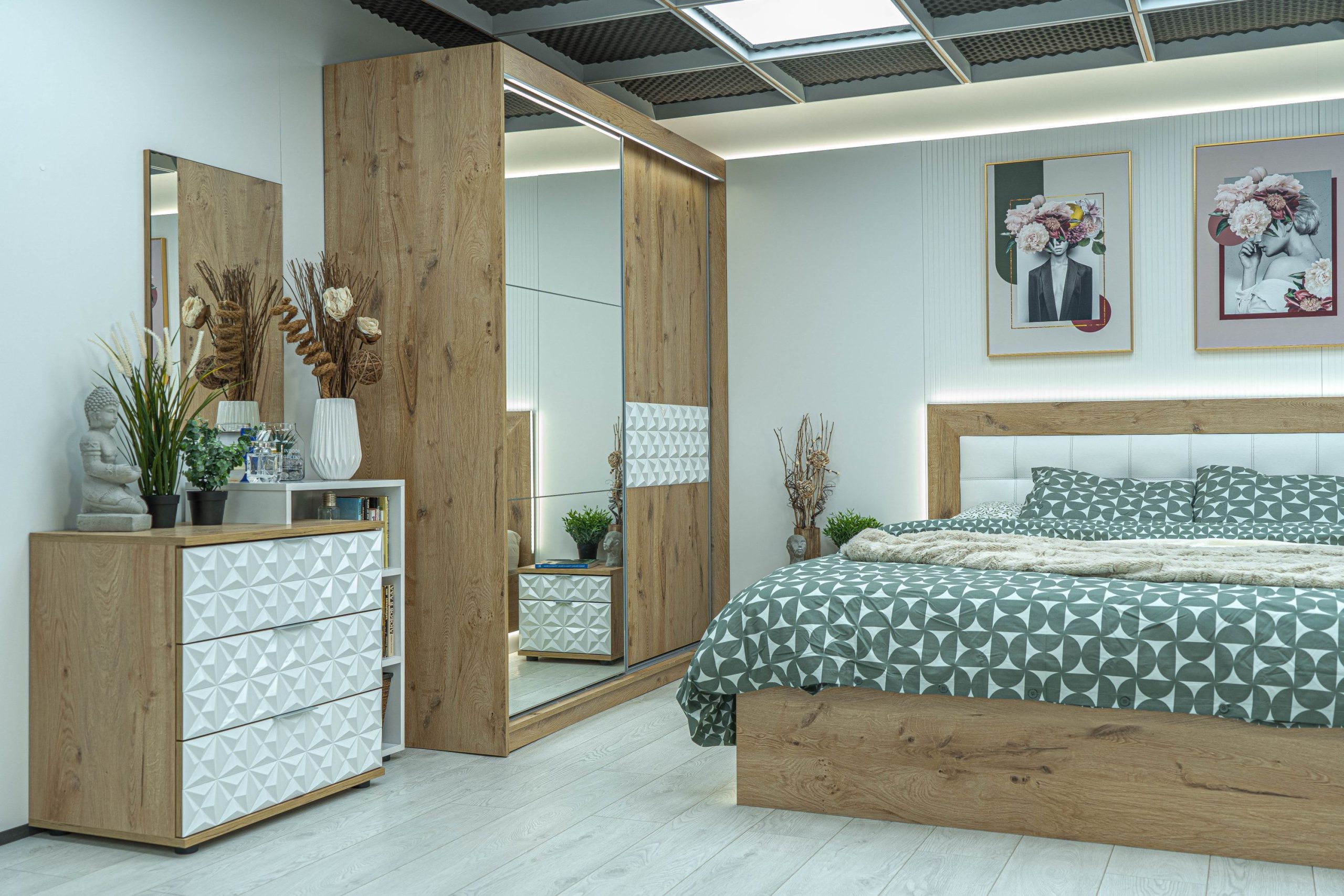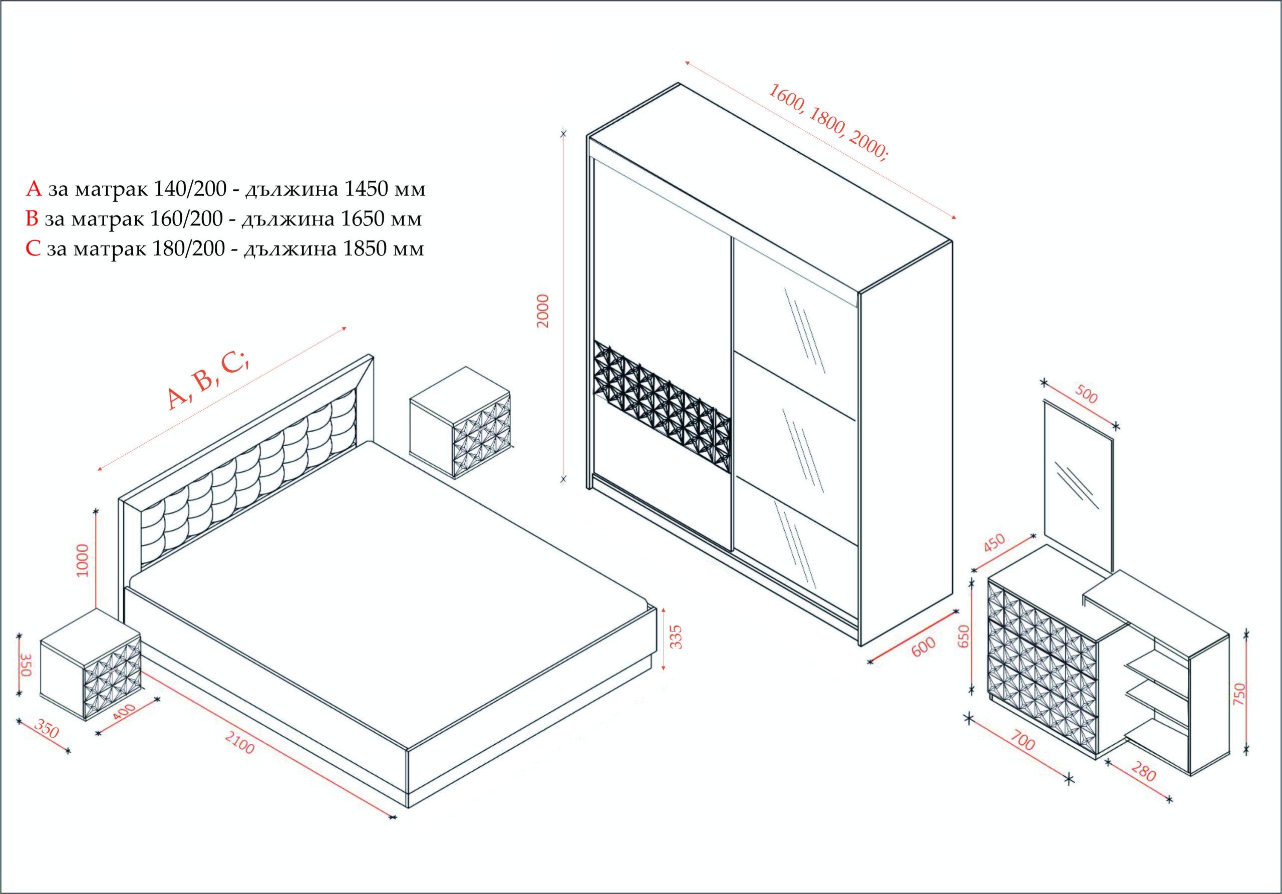 Гардероб: плъзгаща система вътрешно водене, вертикално разположени вградени алуминиеви „П“- образни кант дръжки, спомагащи ефективното плъзгане на системата – гарантиращи устойчивост и здравина на вратите, вградени огледала на едната врата, използвани са сглобки – скрит монтаж, метални рафтоносачи за стабилност на рафтовете, лост за дрехи – метален – форма – елипса – покритие – никел, цялата конструкция на гардероба е монтирана върху метални реглажни „пети“ – осигуряващи изрядна нивелация на изделието и правилната му експлоатация, луксозни завършващи детайли от бели гланцови призми. Осветителен LED панел – опция!