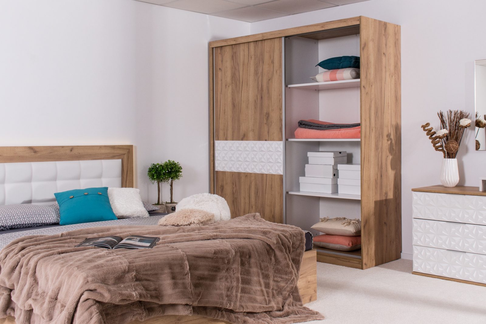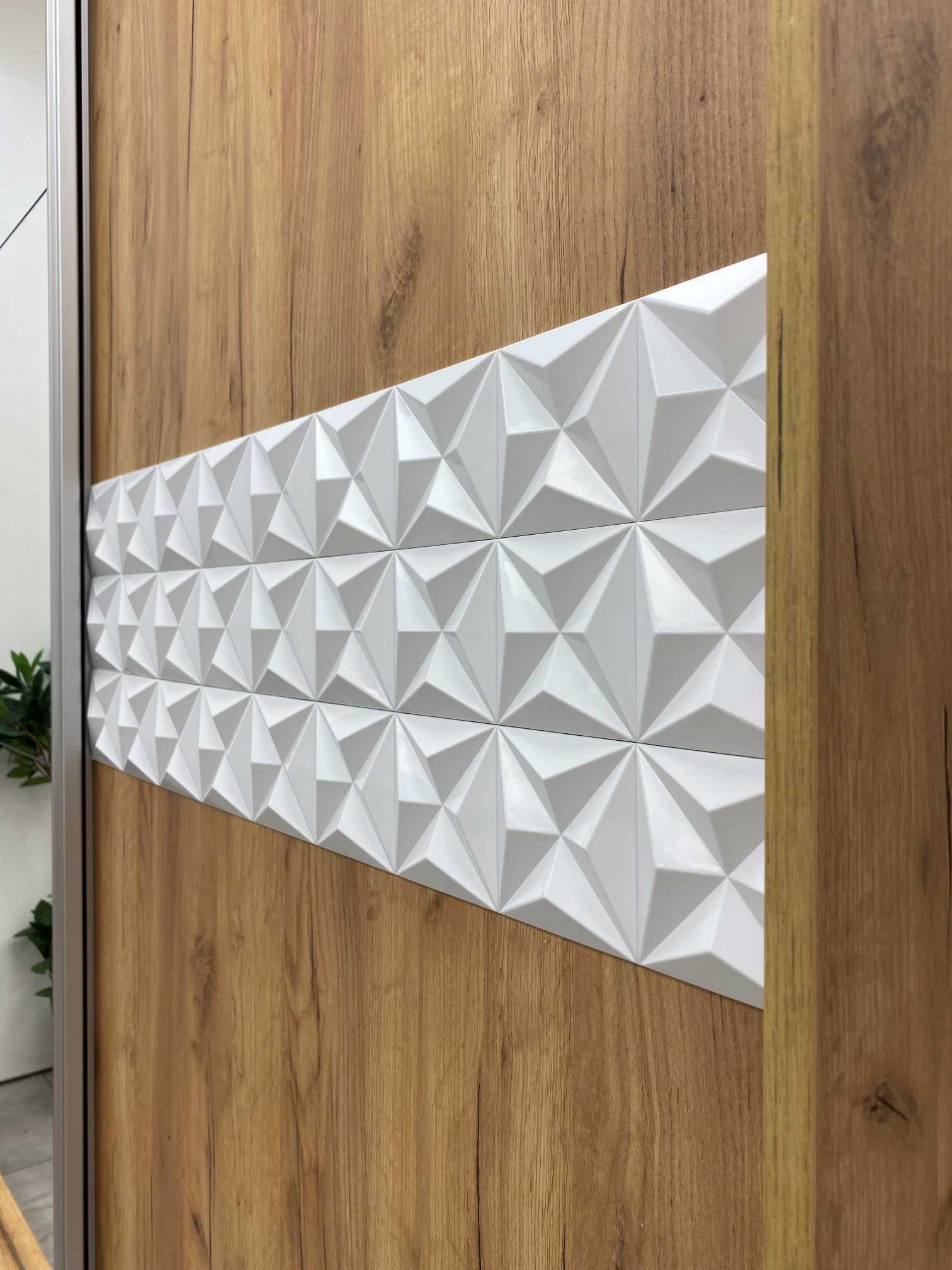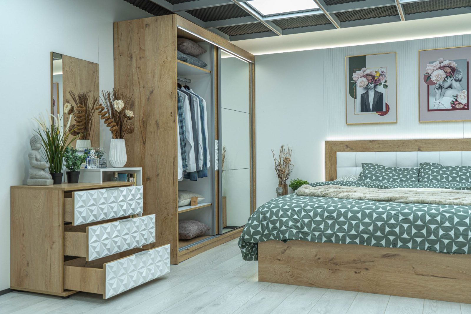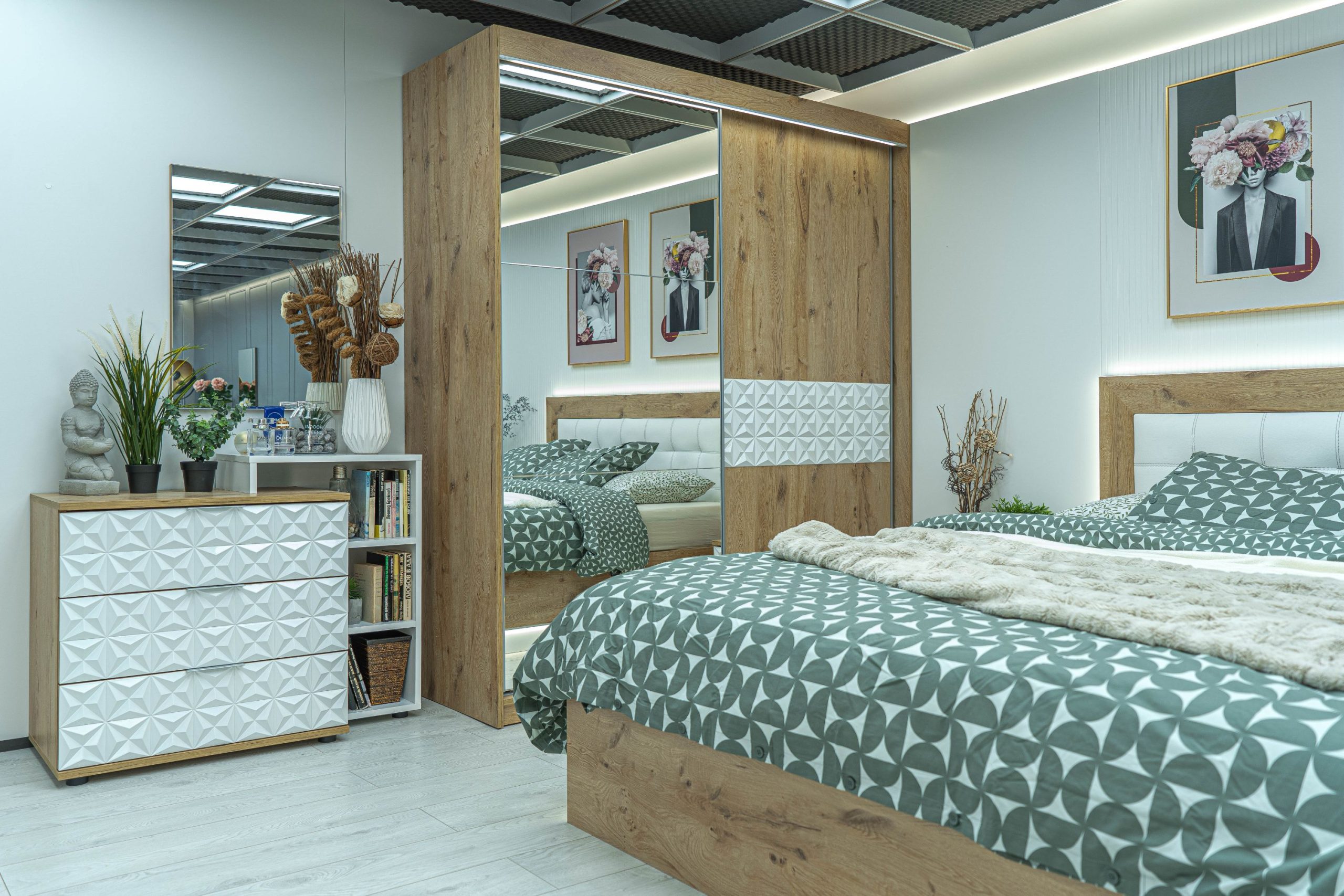 Гардероб: плъзгаща система вътрешно водене, вертикално разположени вградени алуминиеви „П“- образни кант дръжки, спомагащи ефективното плъзгане на системата – гарантиращи устойчивост и здравина на вратите, вградени огледала на едната врата, използвани са сглобки – скрит монтаж, метални рафтоносачи за стабилност на рафтовете, лост за дрехи – метален – форма – елипса – покритие – никел, цялата конструкция на гардероба е монтирана върху метални реглажни „пети“ – осигуряващи изрядна нивелация на изделието и правилната му експлоатация, луксозни завършващи детайли от бели гланцови призми. Осветителен LED панел – опция!