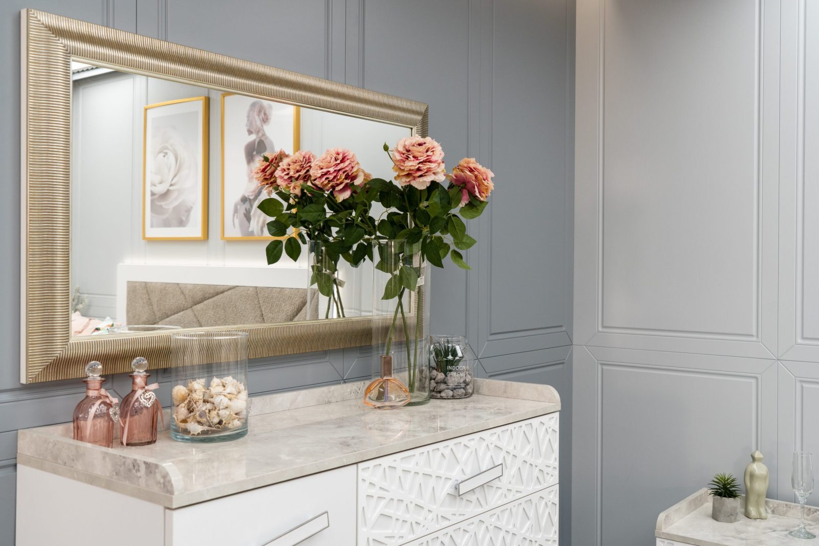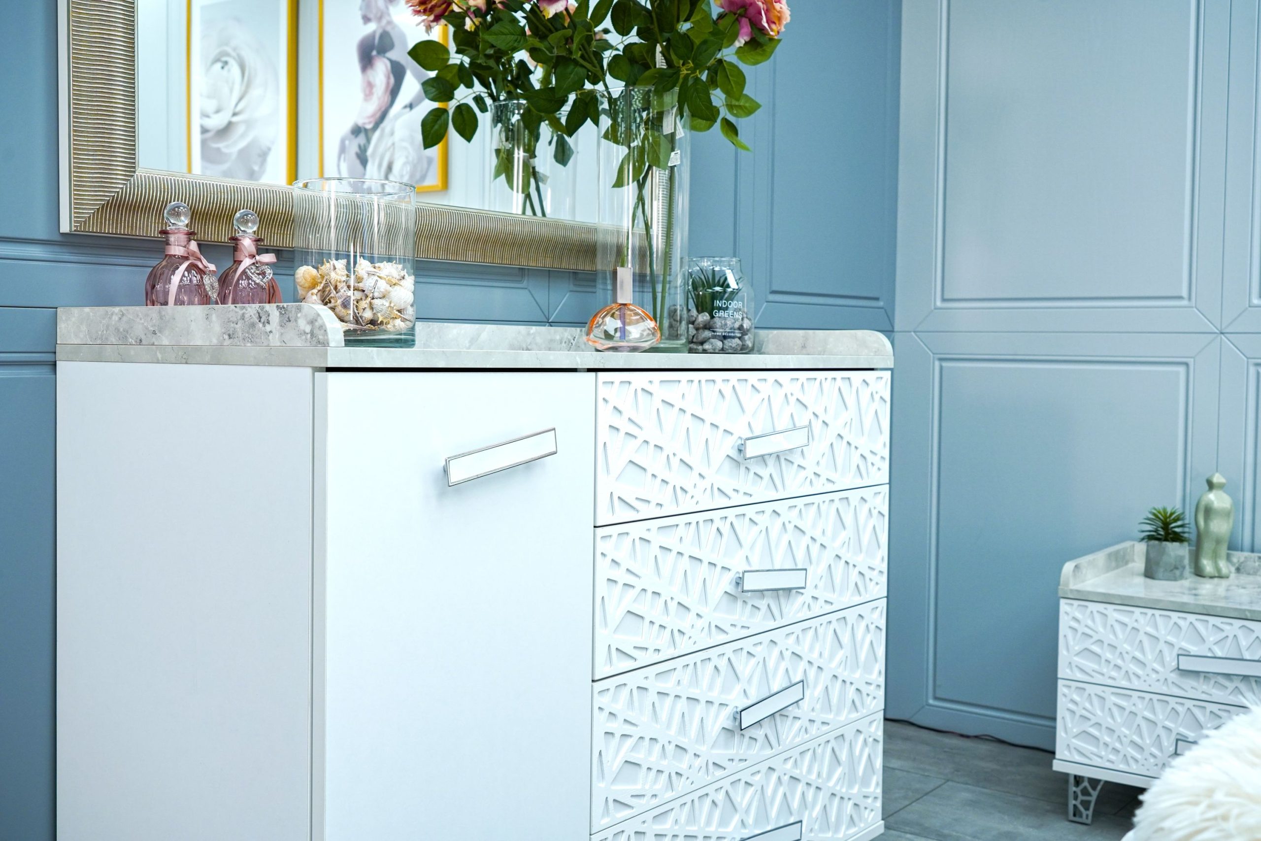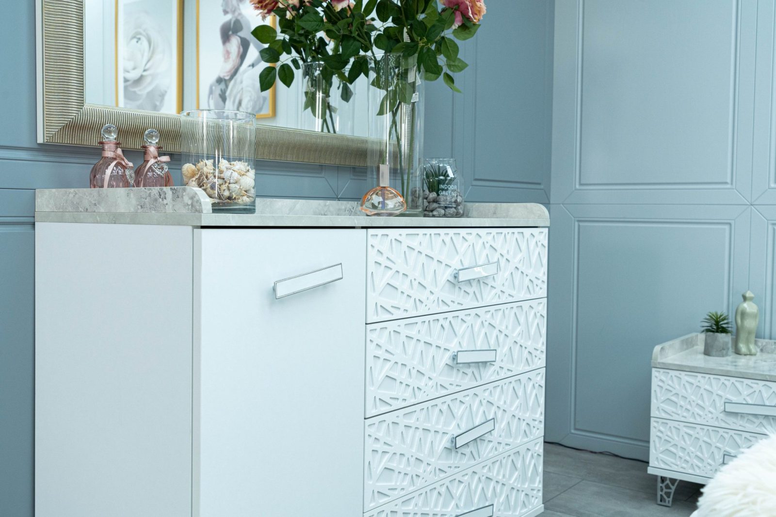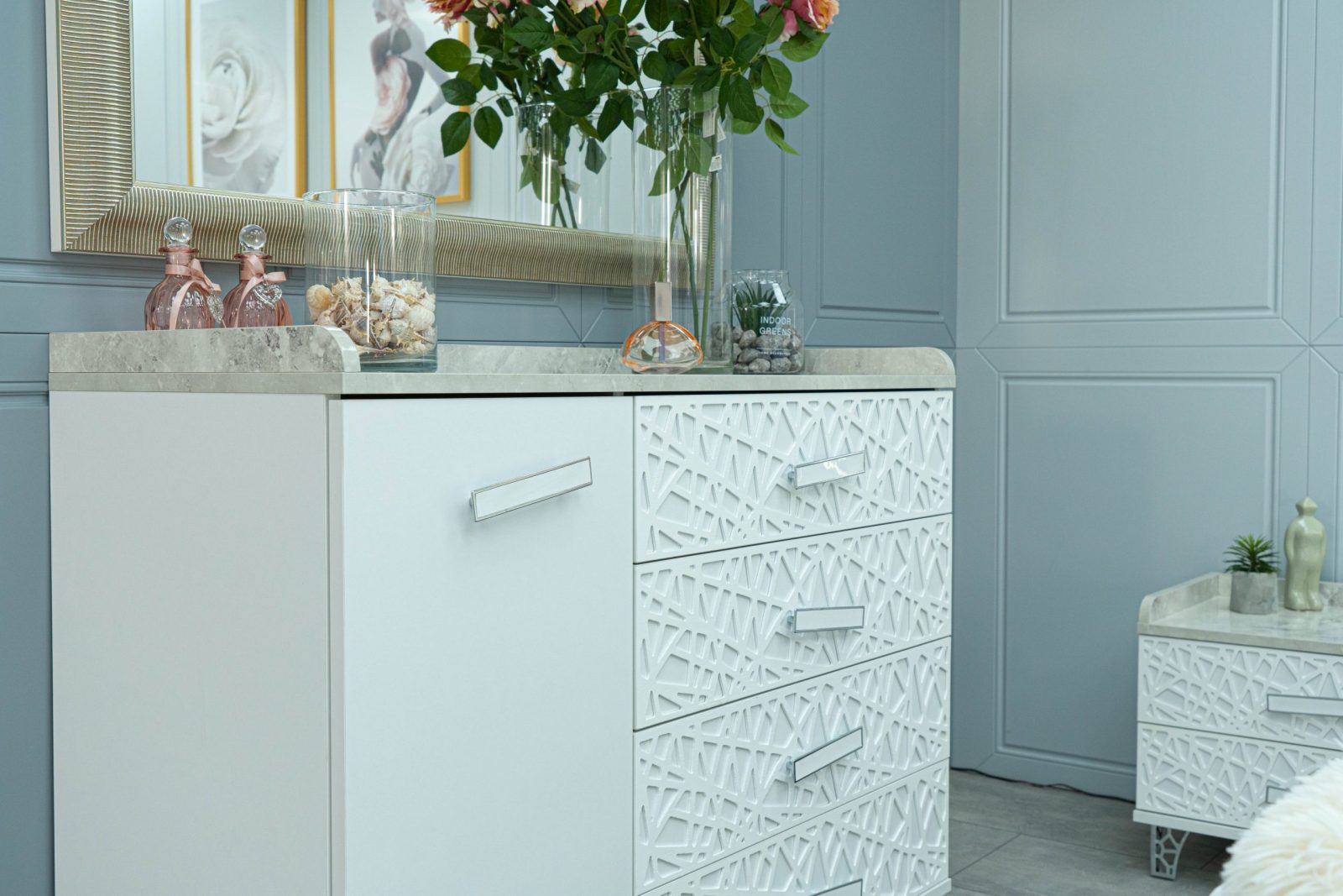 Скрин + пано с огледало: четири практични чекмеджета и страничен шкаф с рафт, дръжки с форма дъга, дръжки с покритие – полиран никел и сърцевина от бяла керамика, крака от перфориран полиран никел, вградени МДФ ажурни пана, система скрити водачи Quadro Hettich – плавно затваряне, панти – плавно затваряне, паното с огледало е обкантено от луксозен интериорен профил – състарено сребро, може да се монтира по хоризонтал и по вертикал зависимост от вашите предпочитания; – 1 бр. в к-т;
