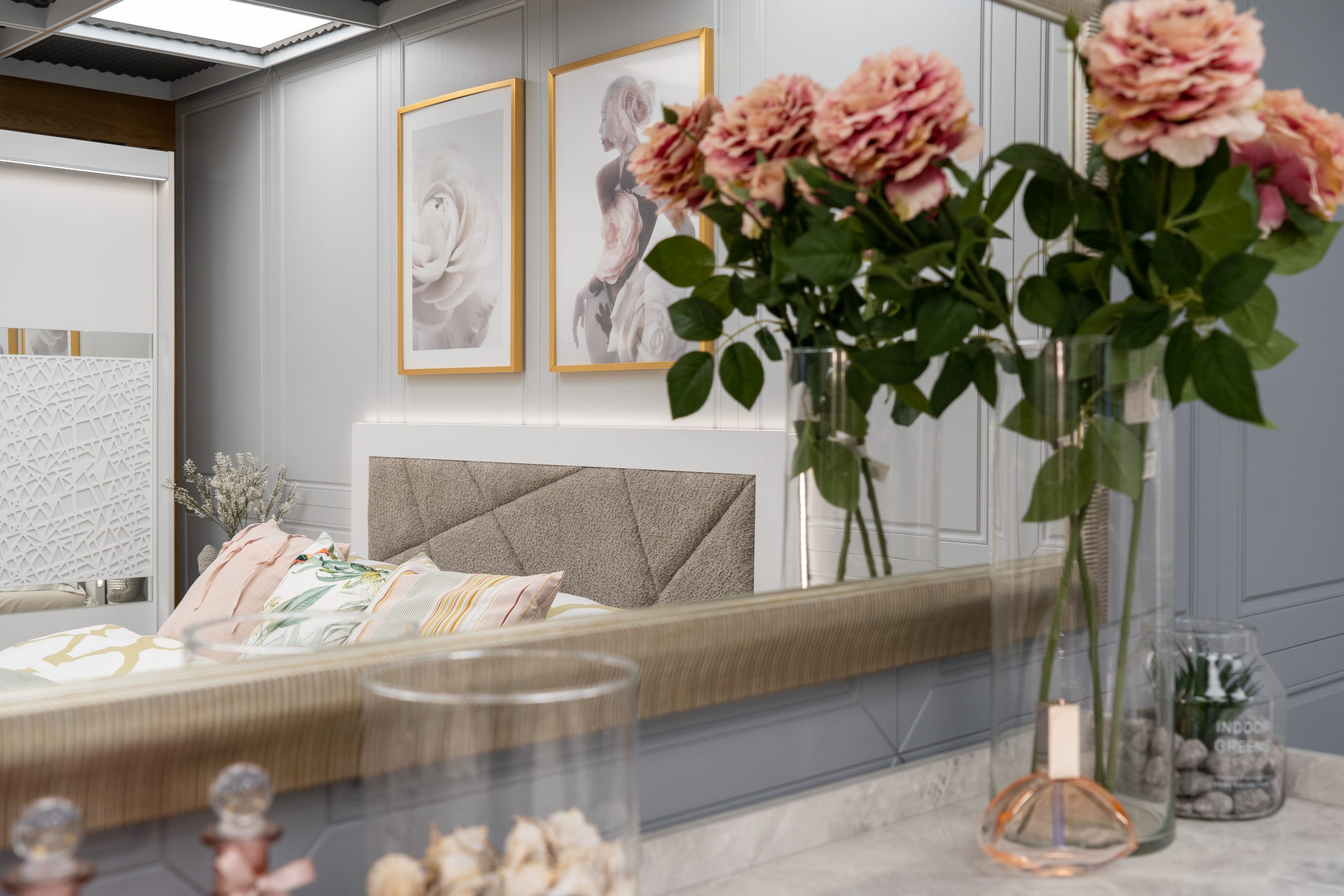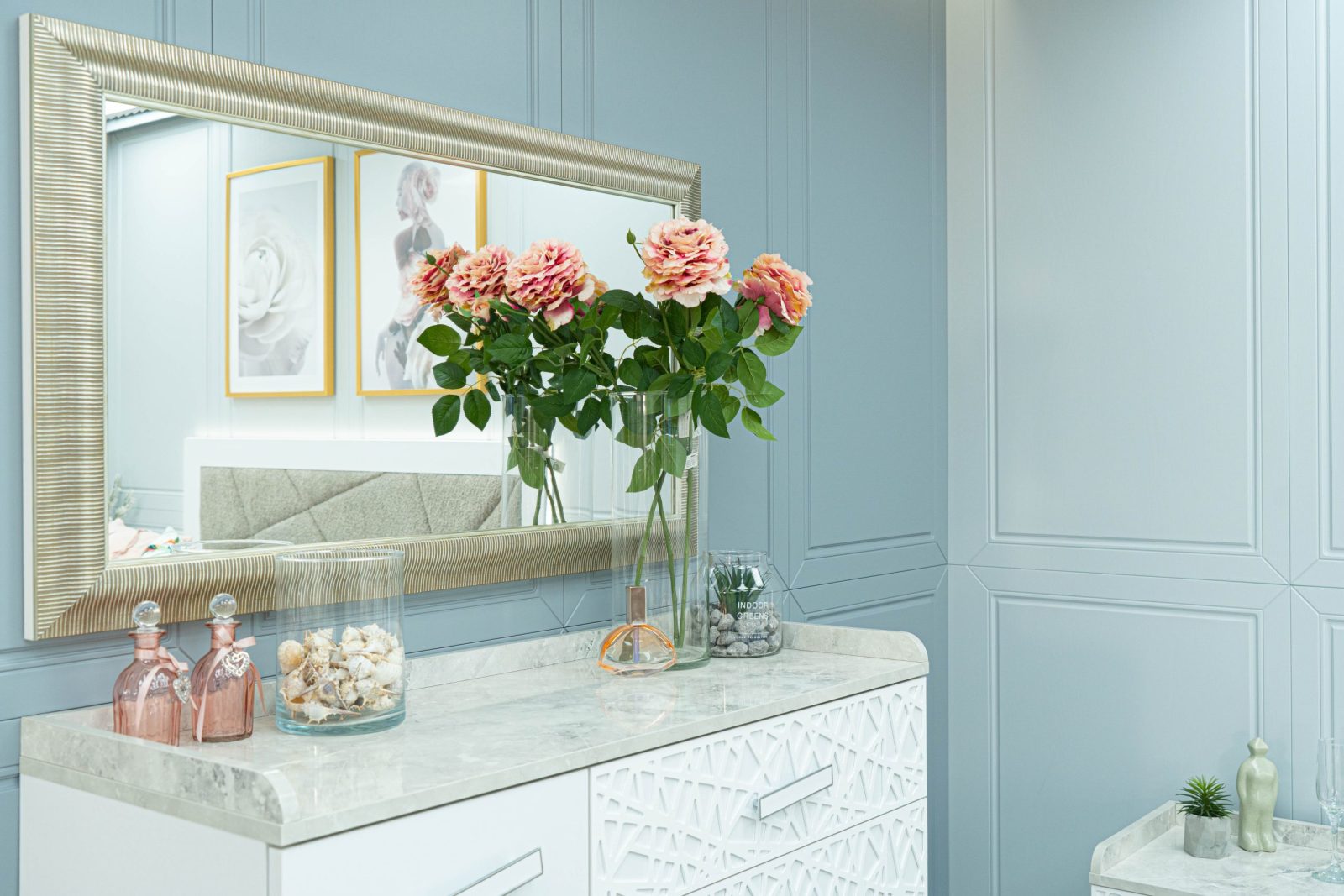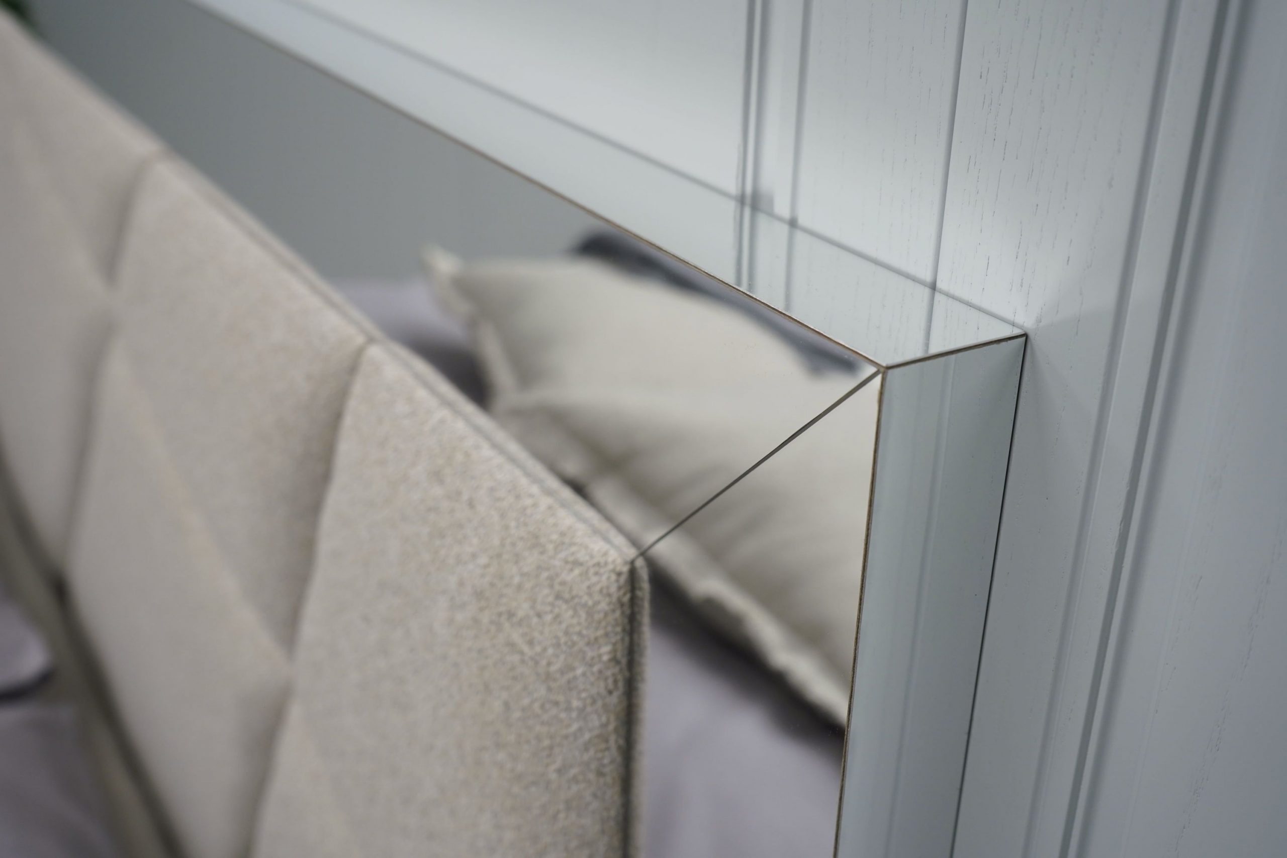 Скрин + пано с огледало: четири практични чекмеджета и страничен шкаф с рафт, дръжки с форма дъга, дръжки с покритие – полиран никел и сърцевина от бяла керамика, крака от перфориран полиран никел, вградени МДФ ажурни пана, система скрити водачи Quadro Hettich – плавно затваряне, панти – плавно затваряне, паното с огледало е обкантено от луксозен интериорен профил – състарено сребро, може да се монтира по хоризонтал и по вертикал зависимост от вашите предпочитания; – 1 бр. в к-т;