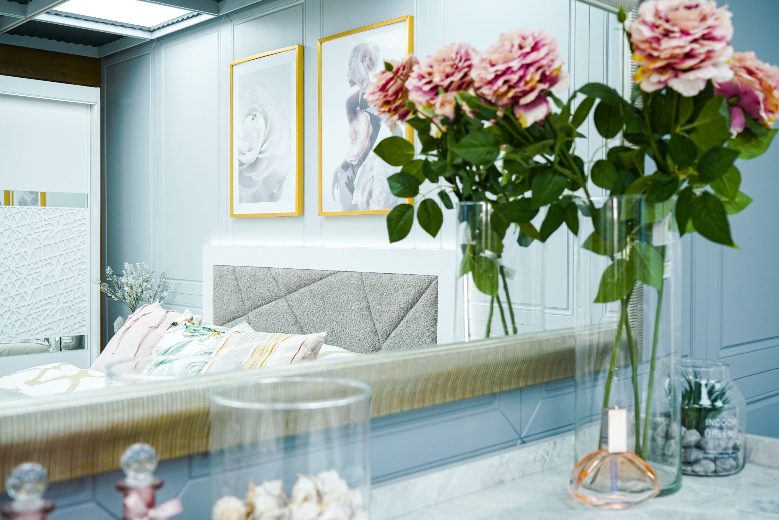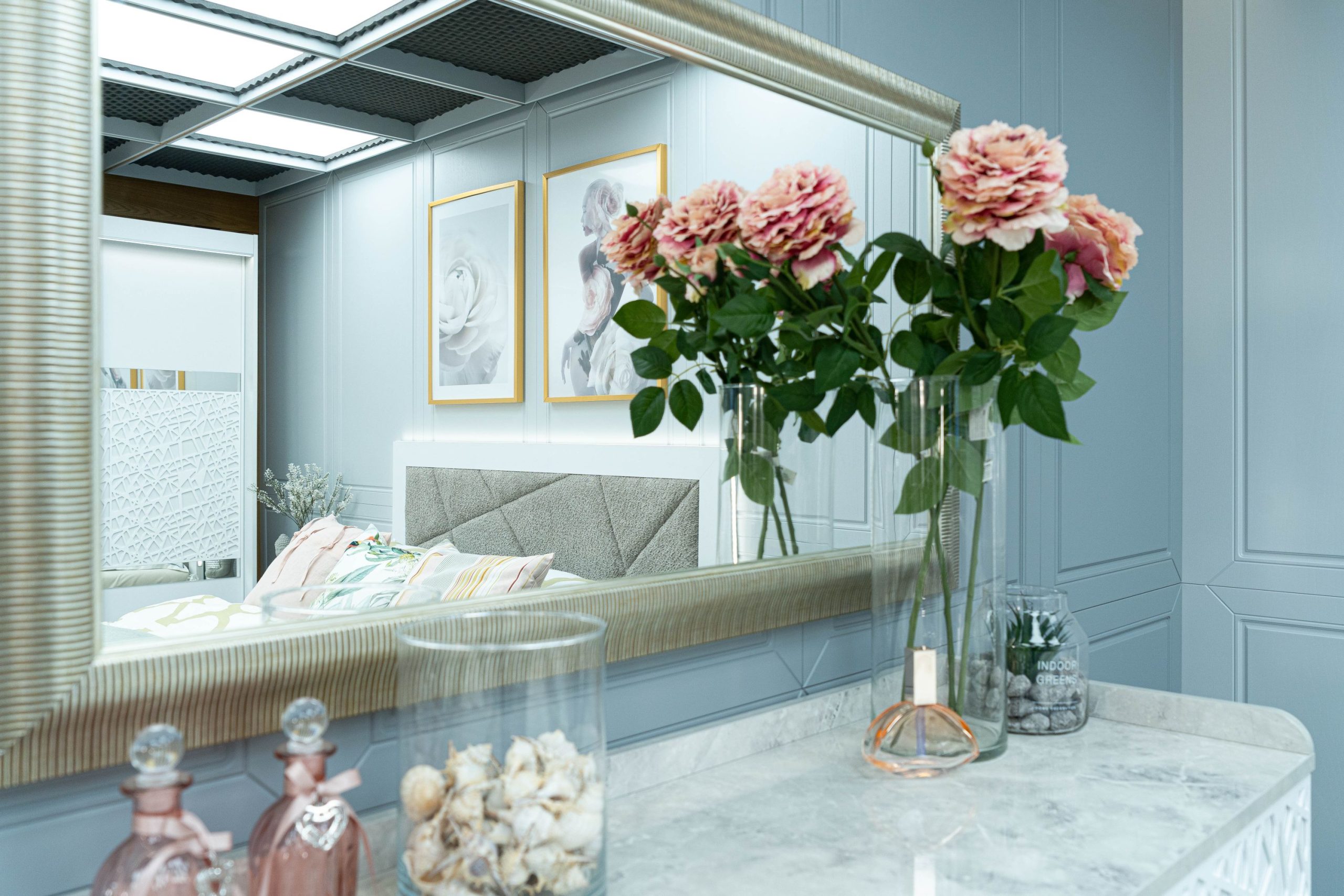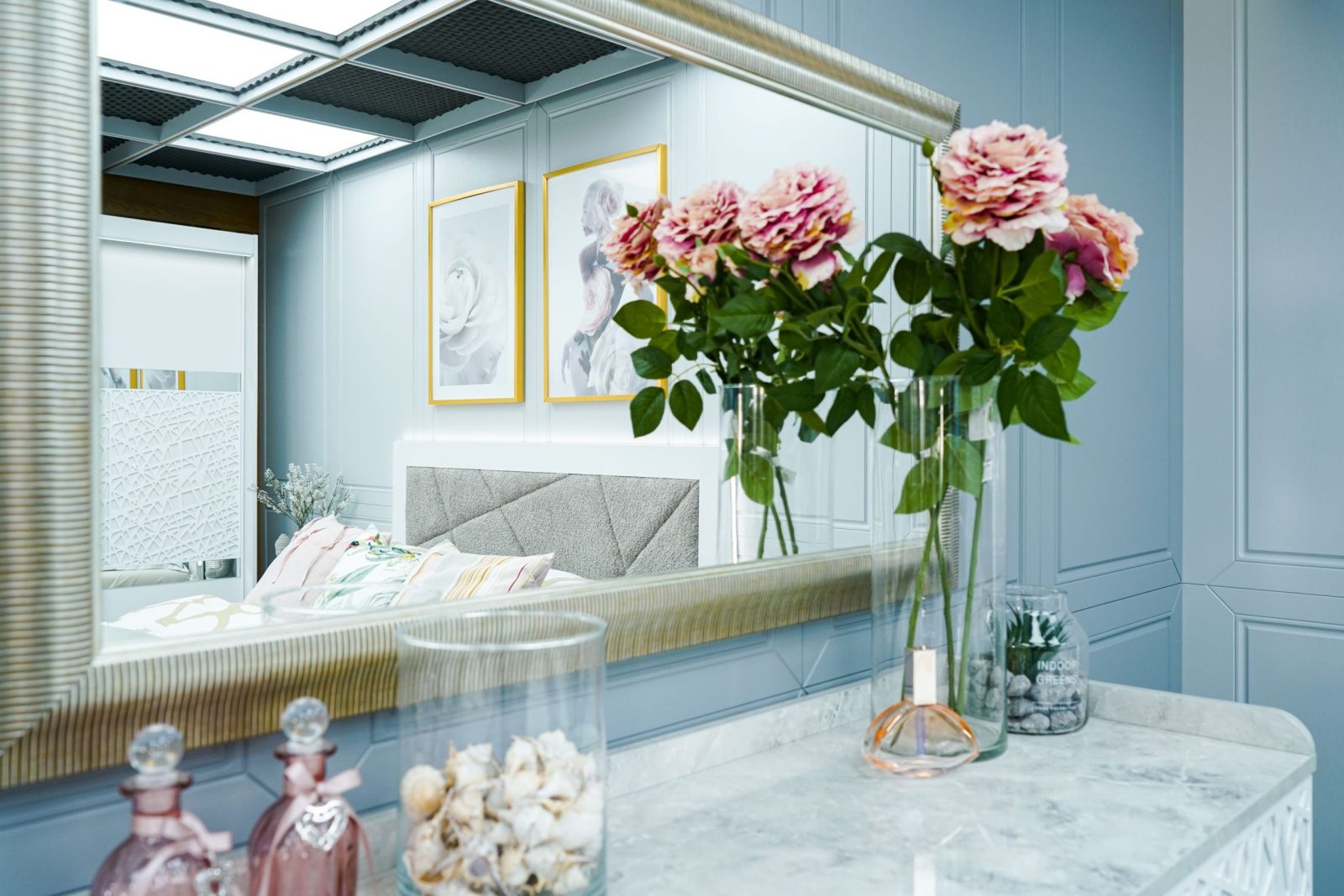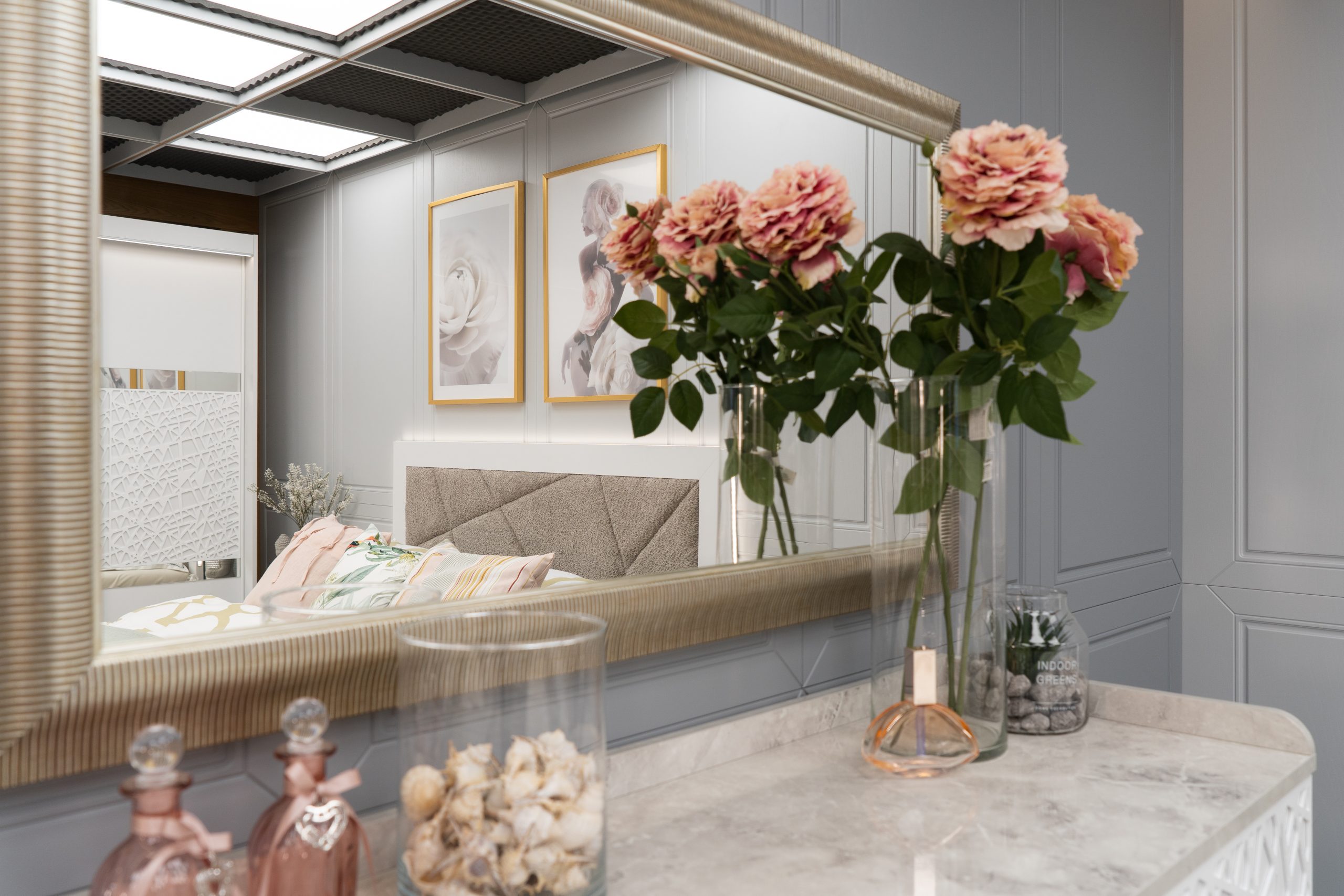 Скрин + пано с огледало: четири практични чекмеджета и страничен шкаф с рафт, дръжки с форма дъга, дръжки с покритие – полиран никел и сърцевина от бяла керамика, крака от перфориран полиран никел, вградени МДФ ажурни пана, система скрити водачи Quadro Hettich – плавно затваряне, панти – плавно затваряне, паното с огледало е обкантено от луксозен интериорен профил – състарено сребро, може да се монтира по хоризонтал и по вертикал зависимост от вашите предпочитания; – 1 бр. в к-т;
