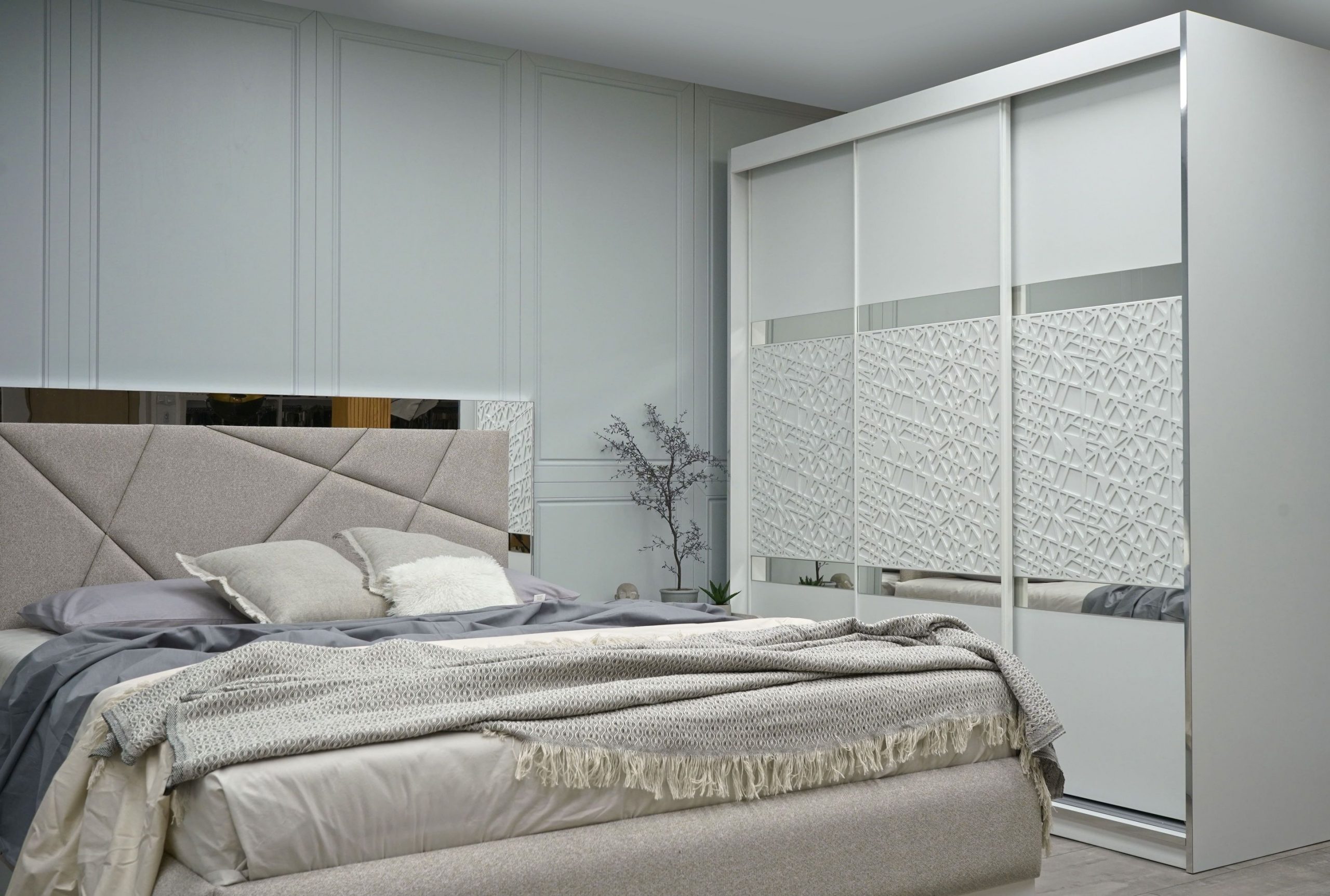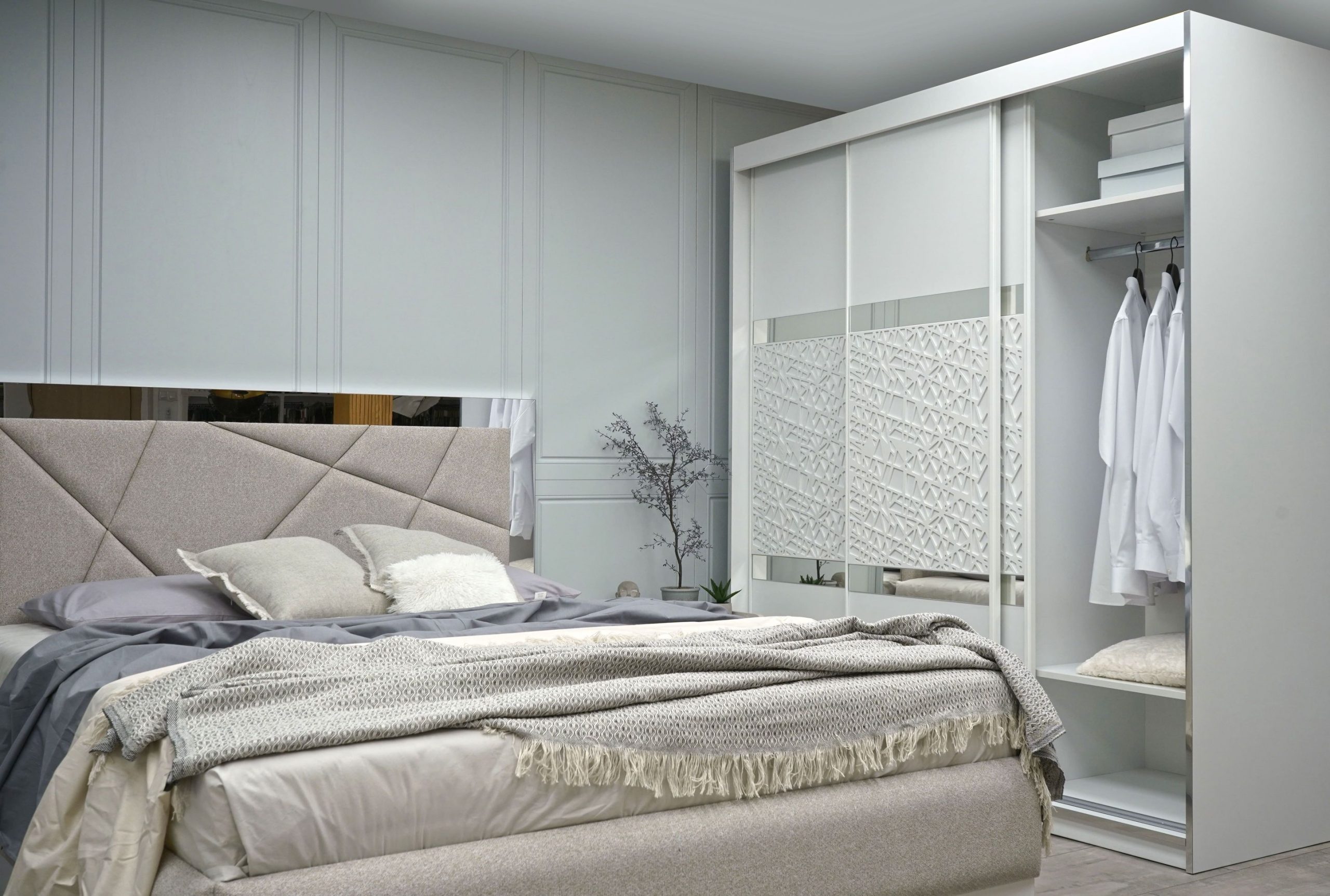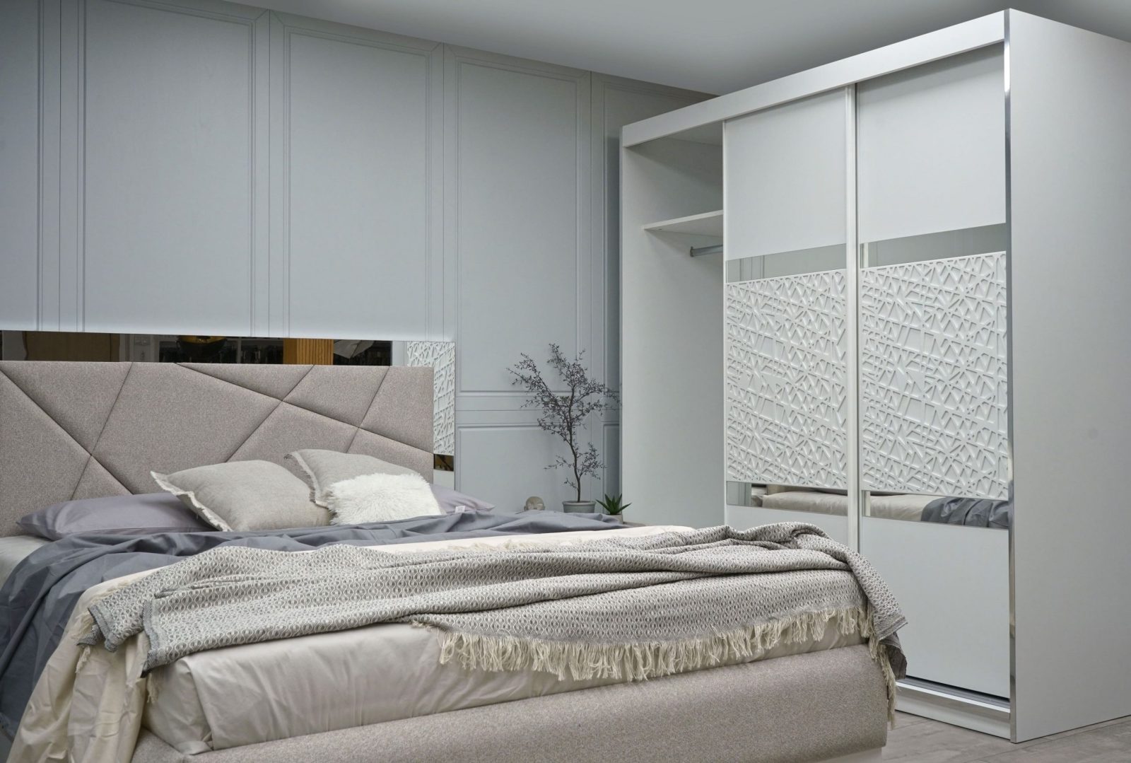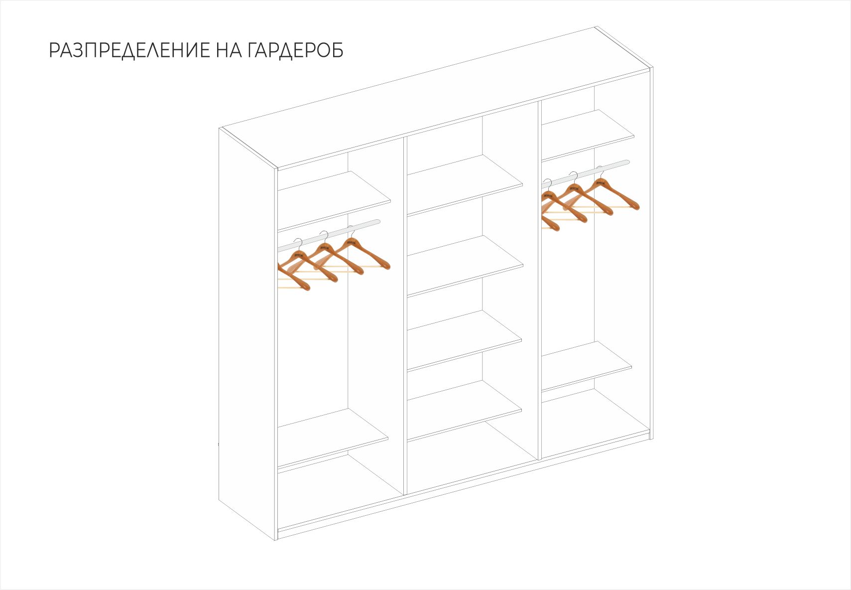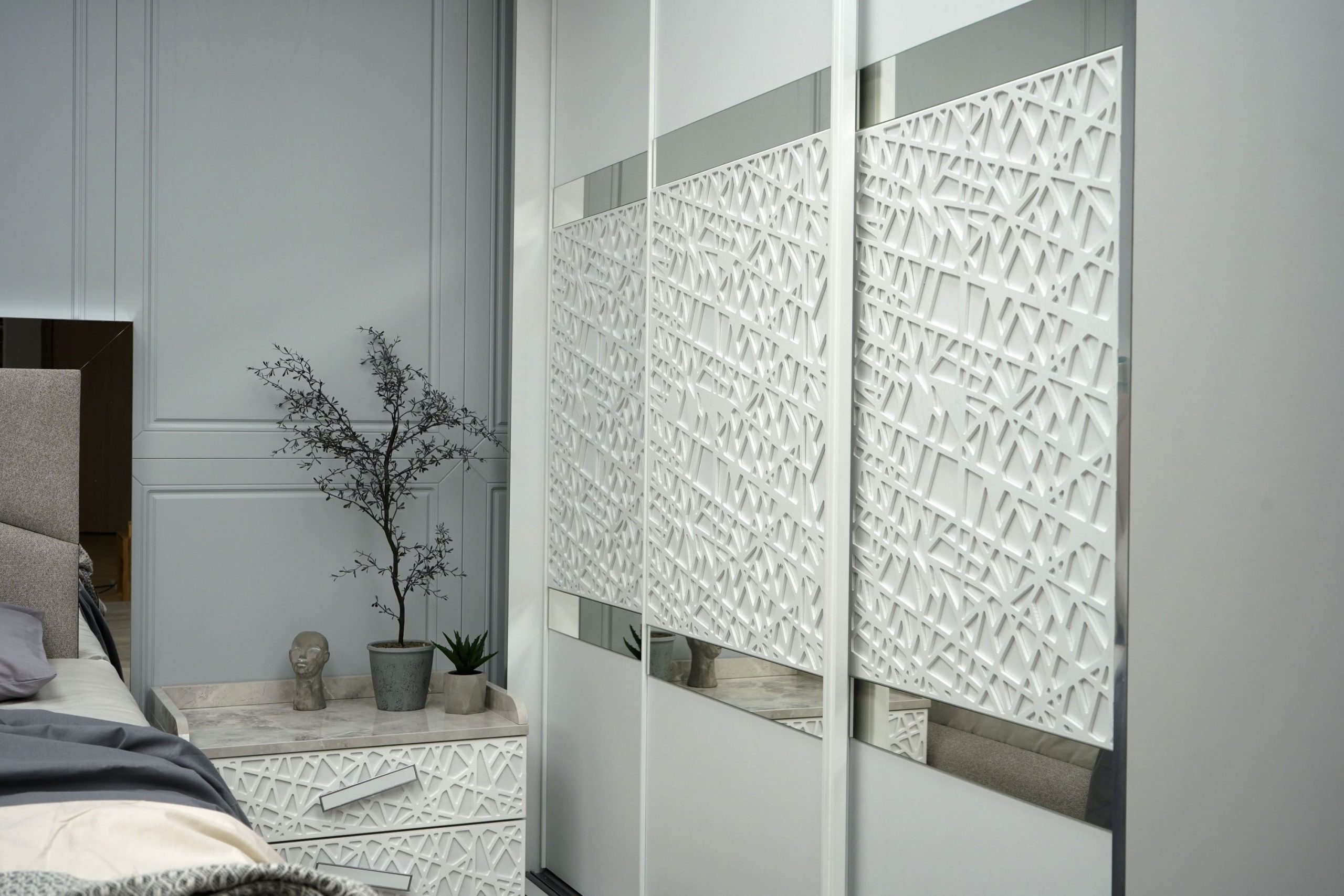 Гардероб: плъзгаща система – вътрешно водене, разпределение 3 крила, вертикално разположени вградени алуминиеви „П“- образни кант дръжки с допълнително излят външен улей за лесно и удобно захващане, спомагащи ефективното плъзгане на системата – гарантиращи устойчивост и здравина на вратите – прахово боядисани в бял мат, използвани са сглобки – скрит монтаж, метални рафтоносачи за стабилност на рафтовете, лост за дрехи – метален – форма – елипса – покритие – никел, цялата конструкция на гардероба е монтирана върху метални реглажни „пети“ – осигуряващи изрядна нивелация на изделието и правилната му експлоатация, таблени врати в съчетание на бял мат с елегантни ажурни пана от МДФ – естествен фурнир – дъб, вгрден осветителен LED панел – сензор за допир; – 1 бр.