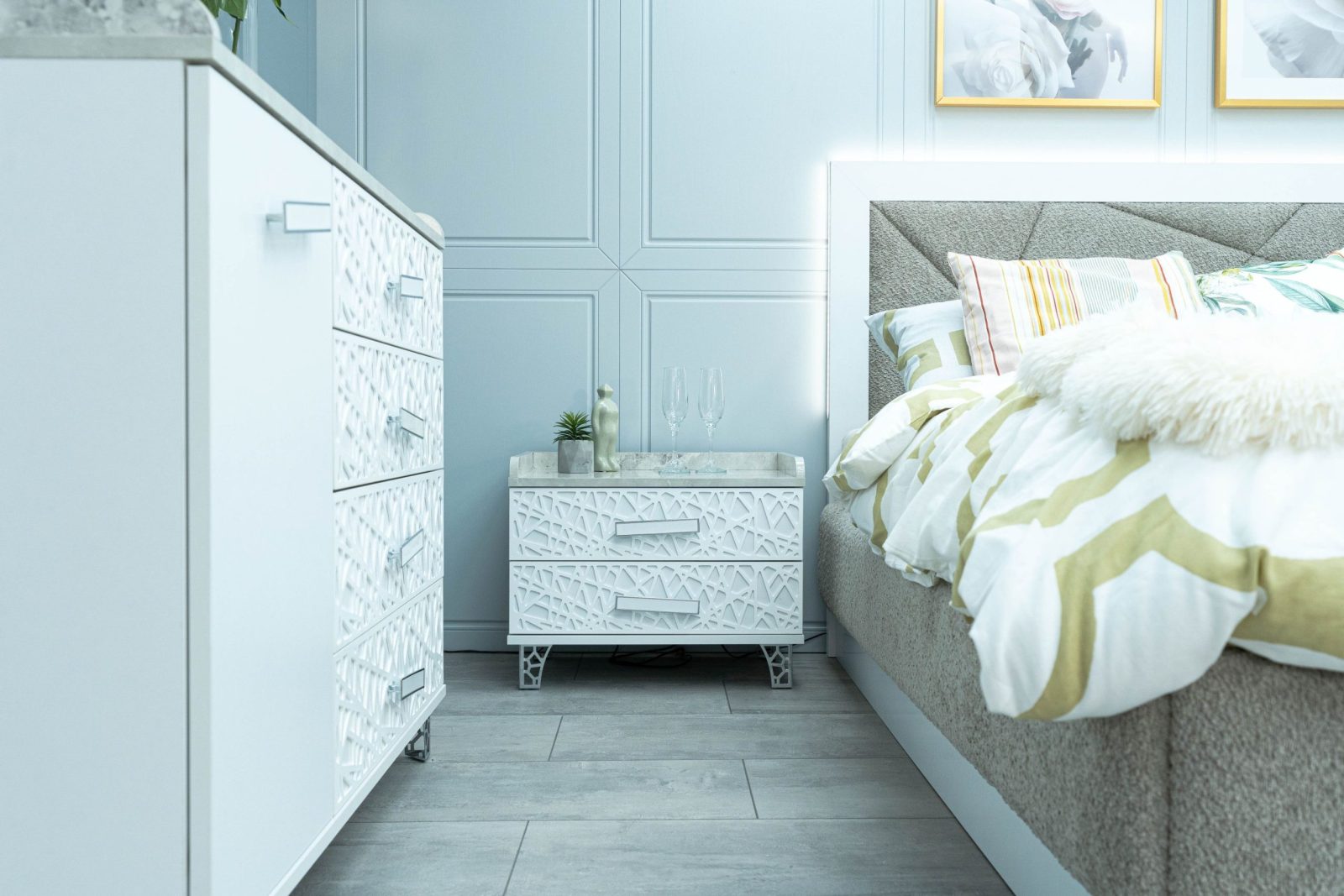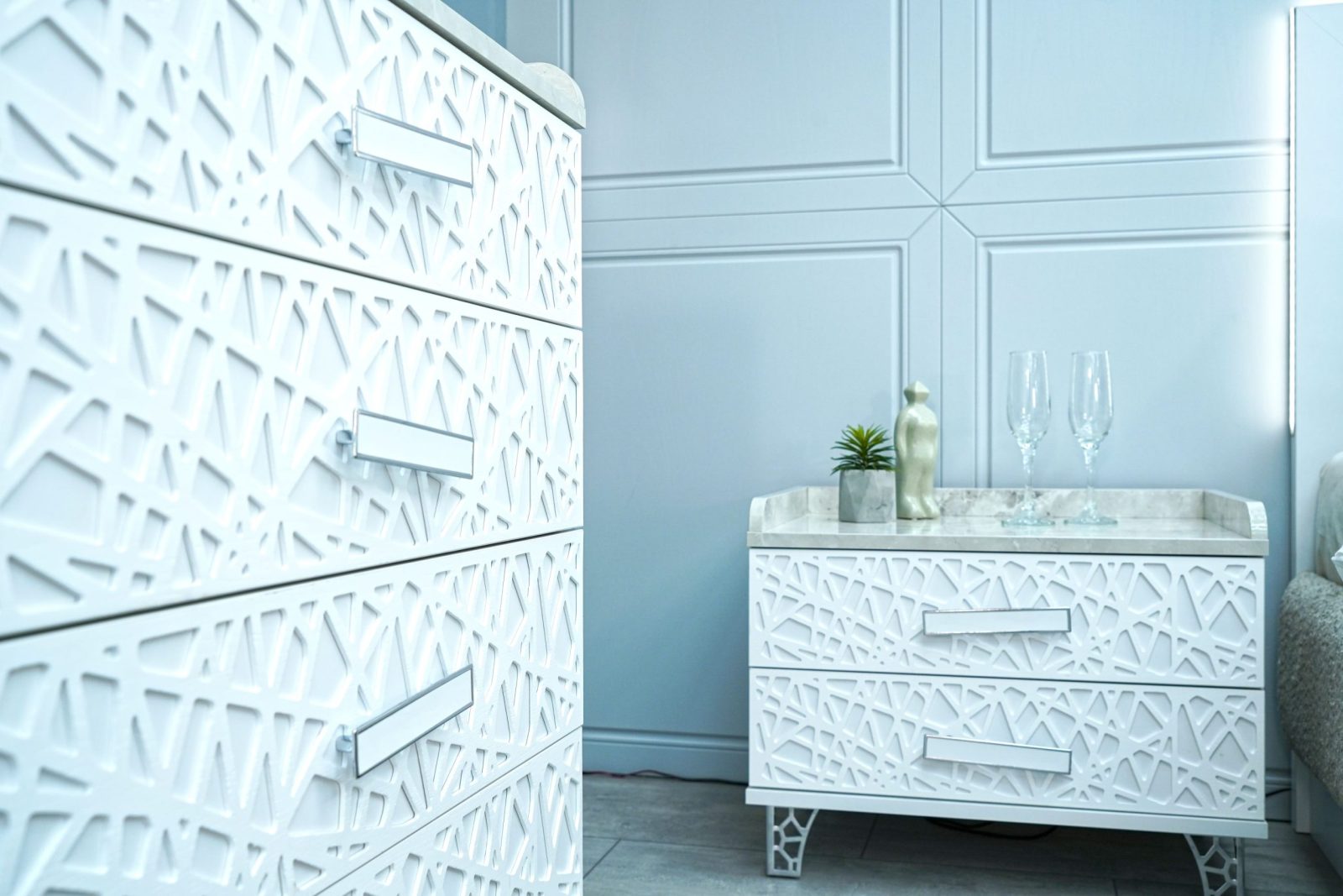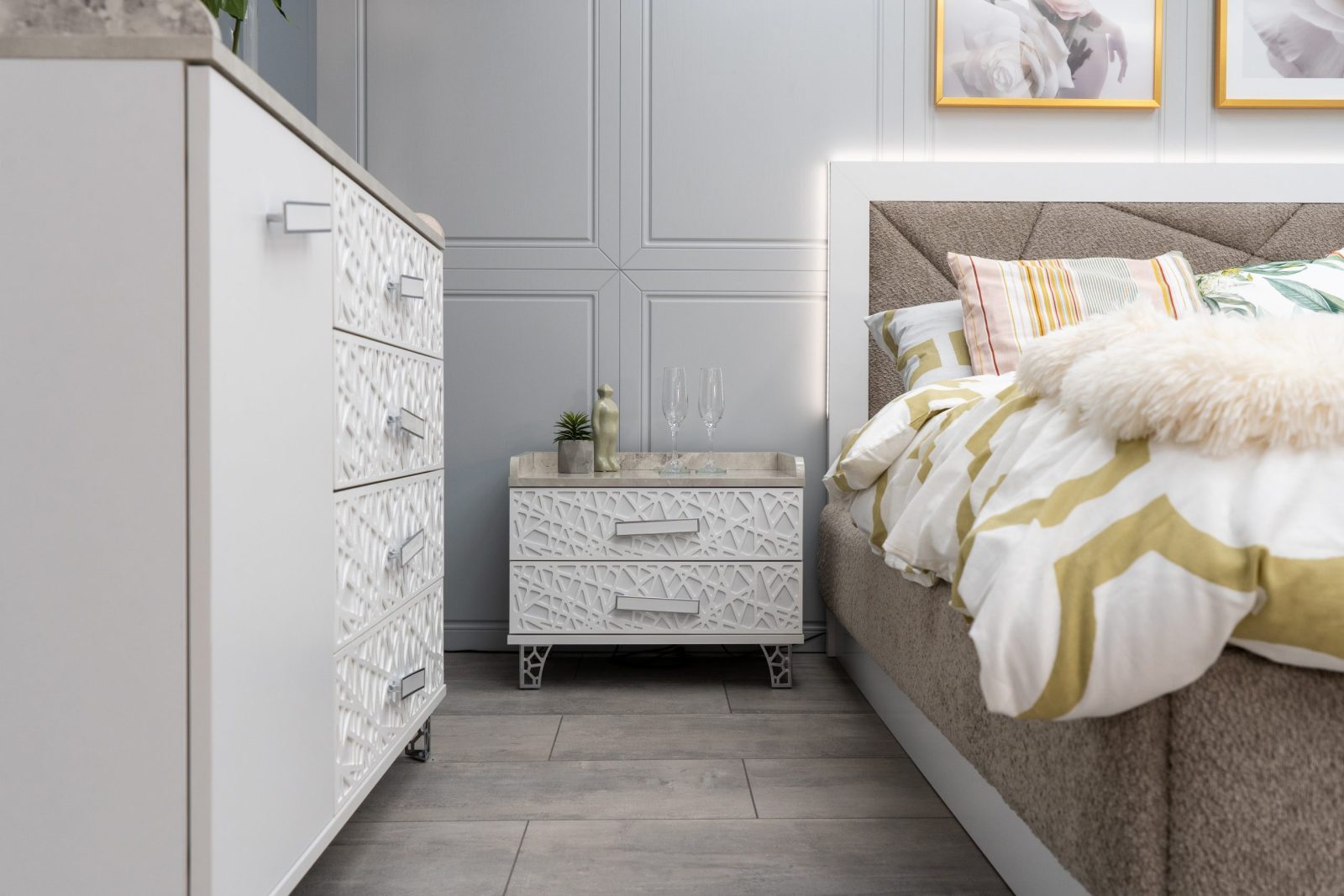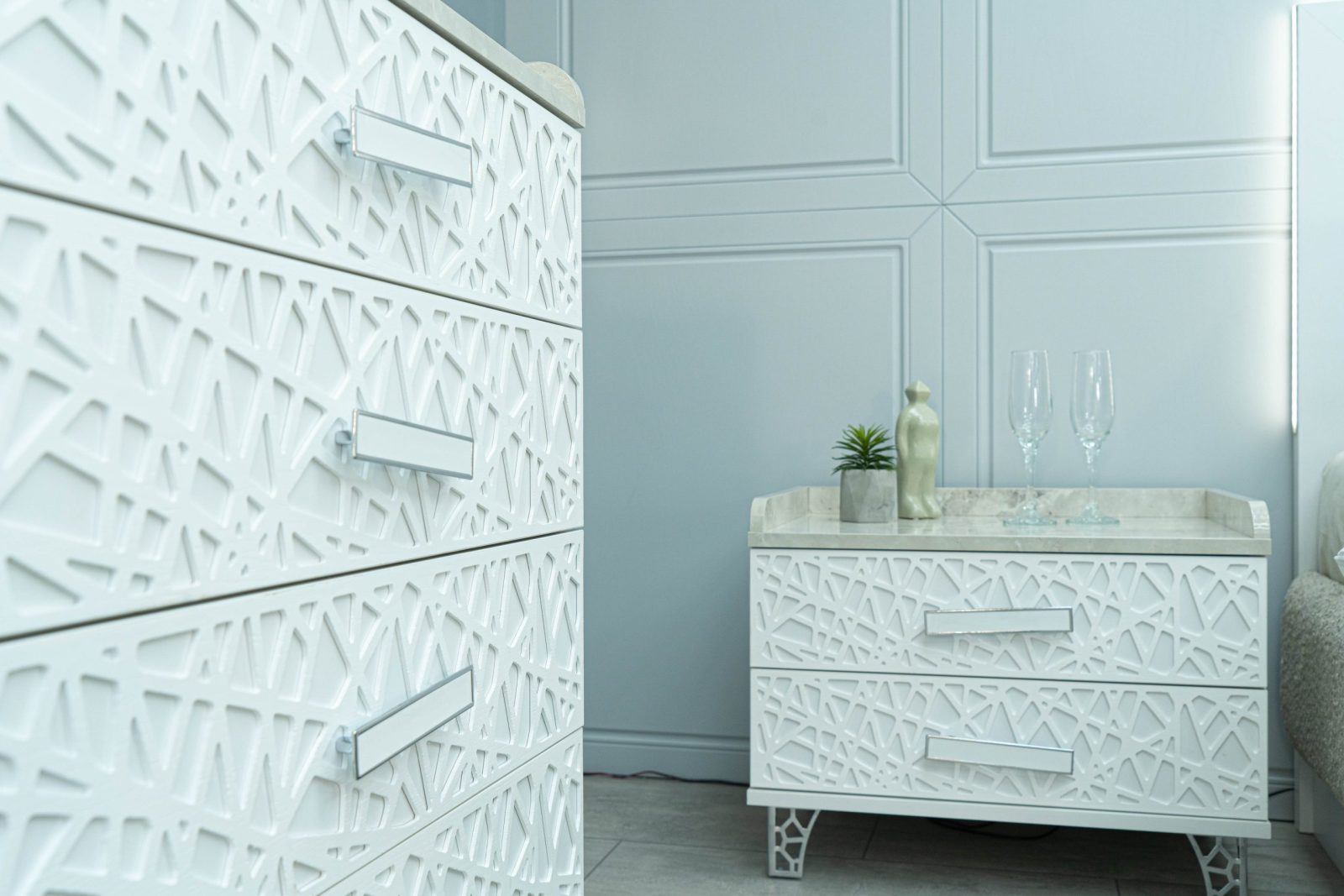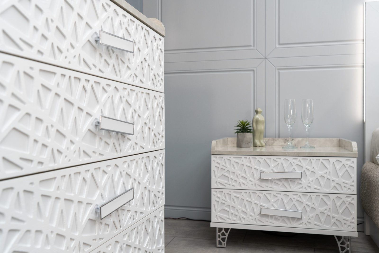 Нощно шкафче: практични чекмеджета, дръжки с покритие – полиран никел и сърцевина от бяла керамика, крака от перфориран полиран никел, вградени МДФ ажурни пана, система скрити водачи Quadro Hettich – плавно затваряне – 2 бр. в к-т;