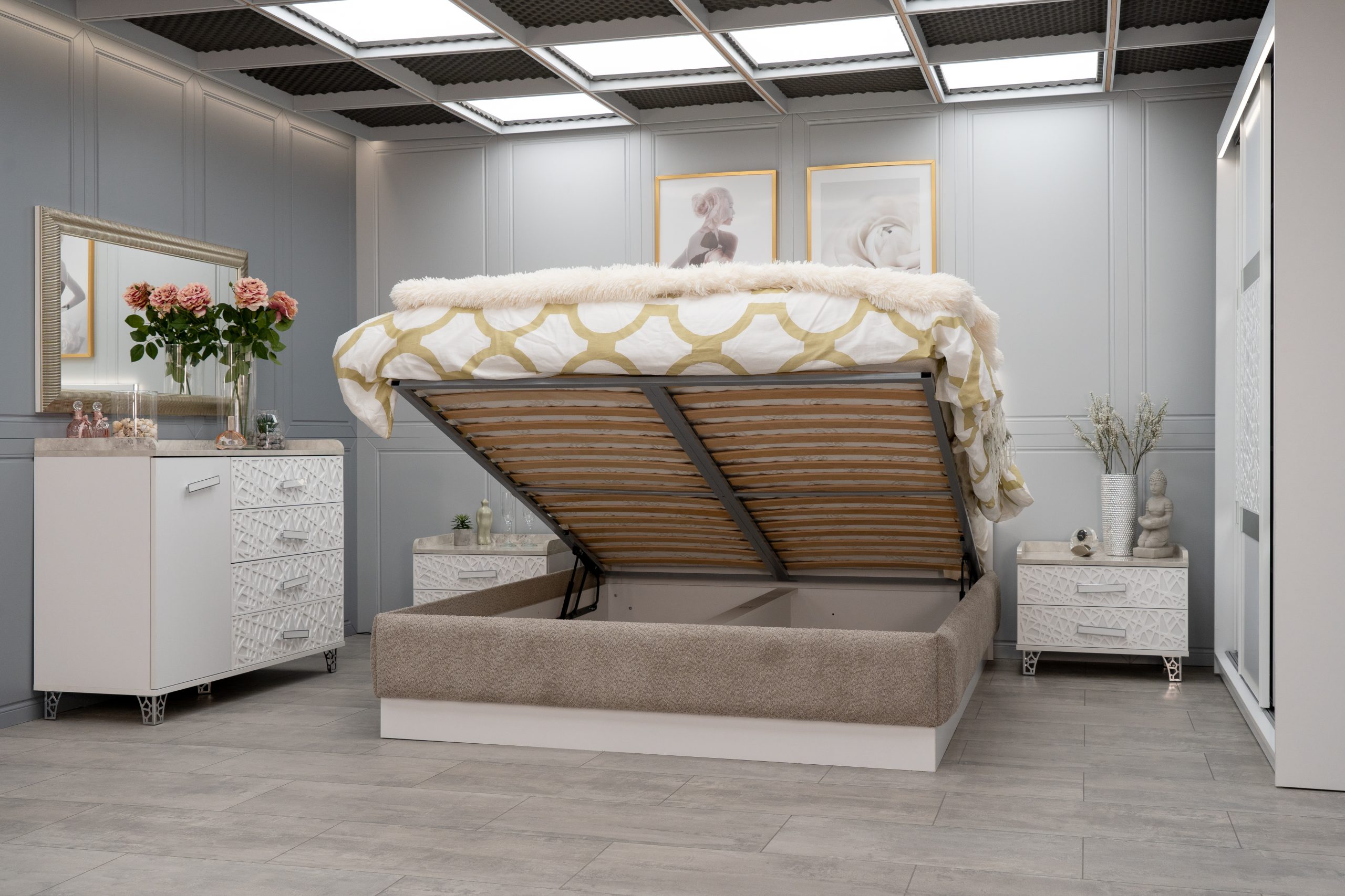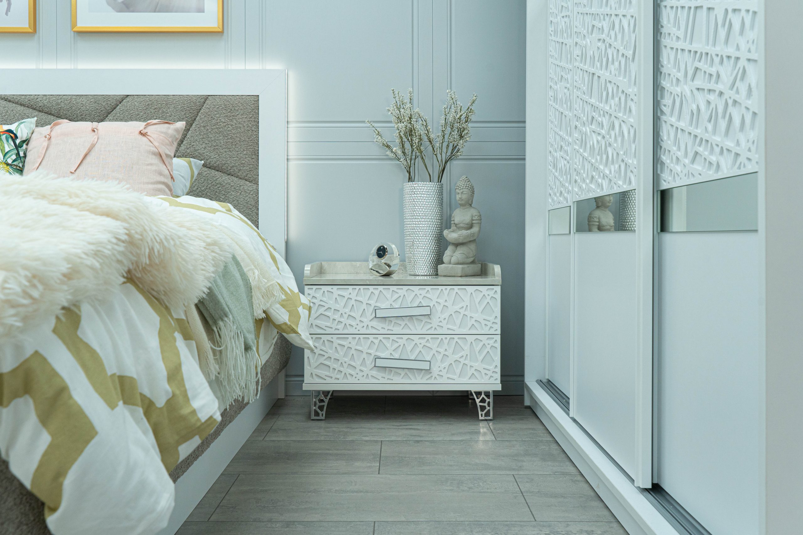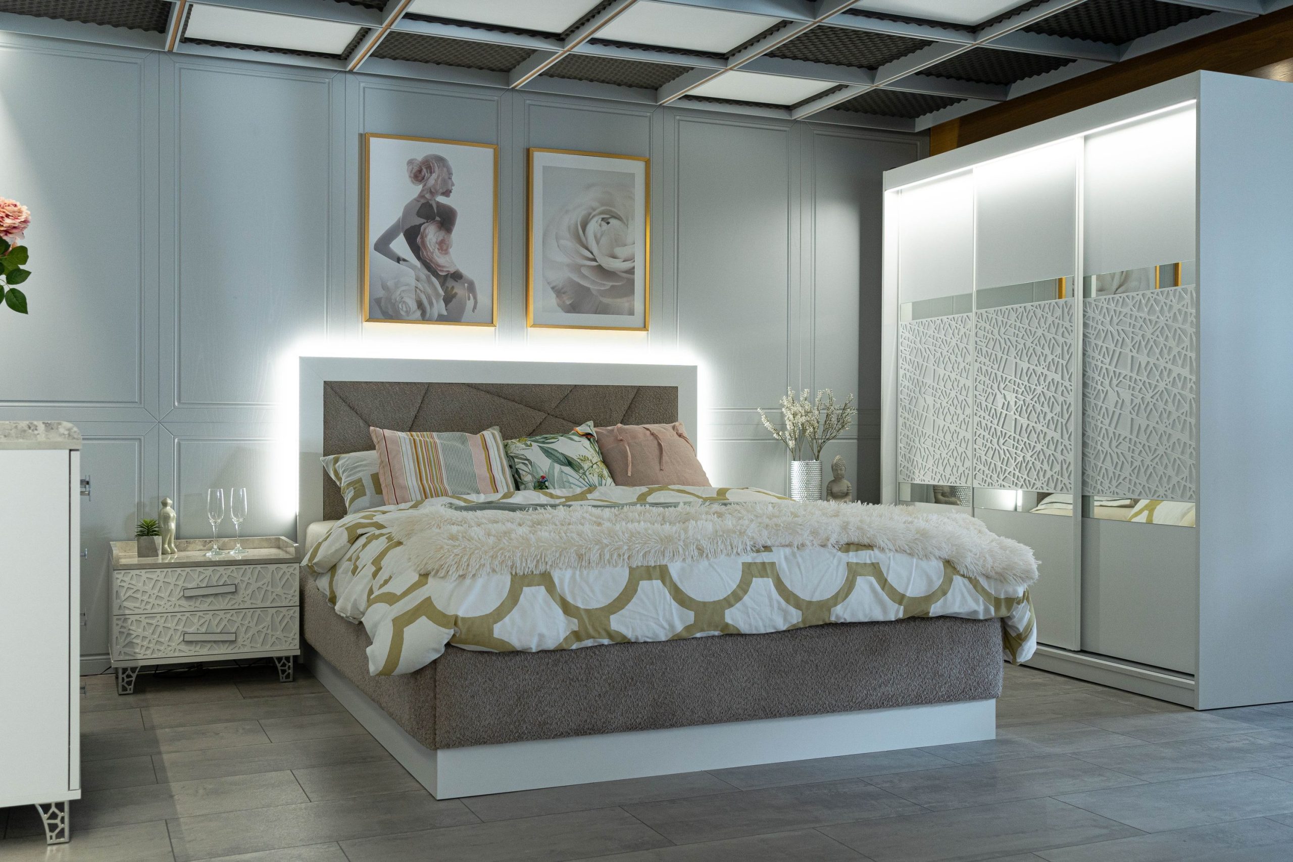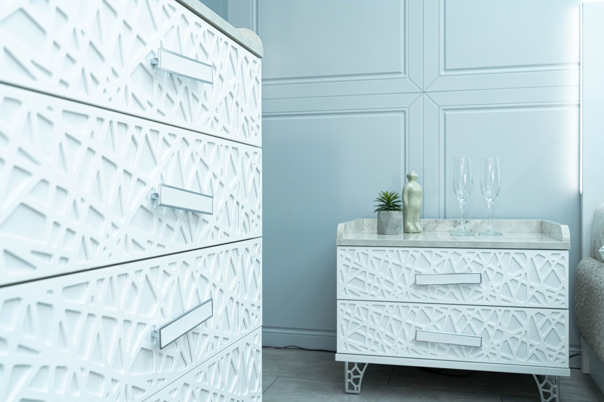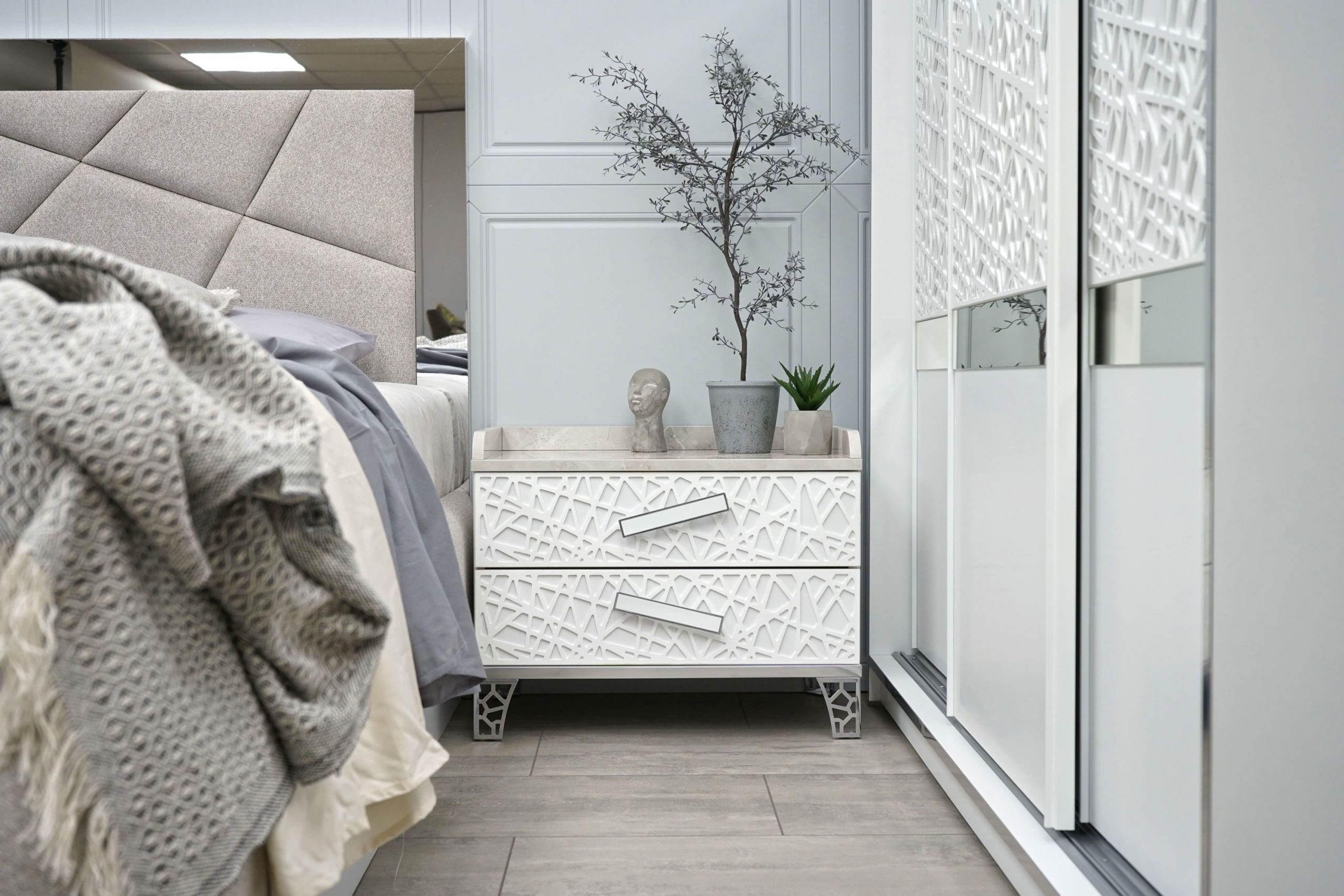 Нощно шкафче: практични чекмеджета, дръжки с покритие – полиран никел и сърцевина от бяла керамика, крака от перфориран полиран никел, вградени МДФ ажурни пана, система скрити водачи Quadro Hettich – плавно затваряне – 2 бр. в к-т;