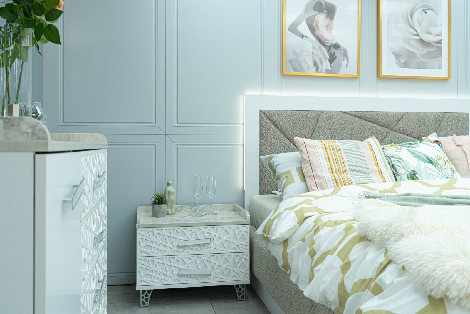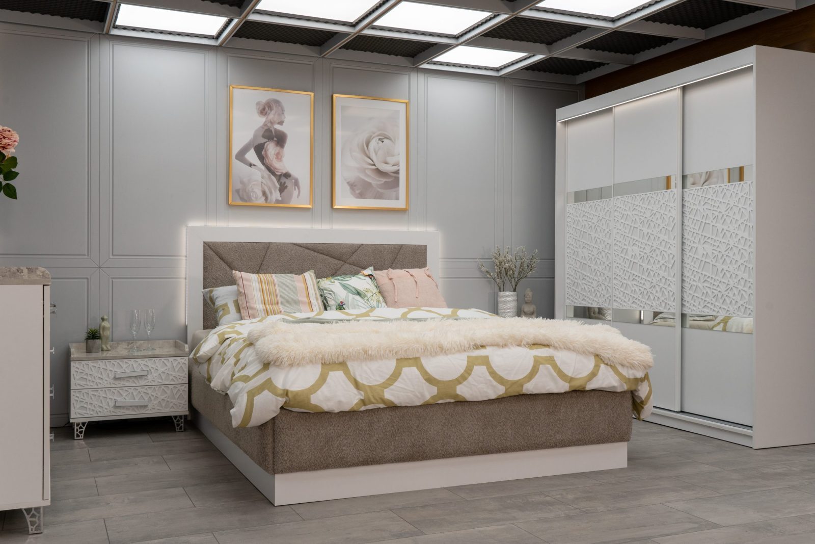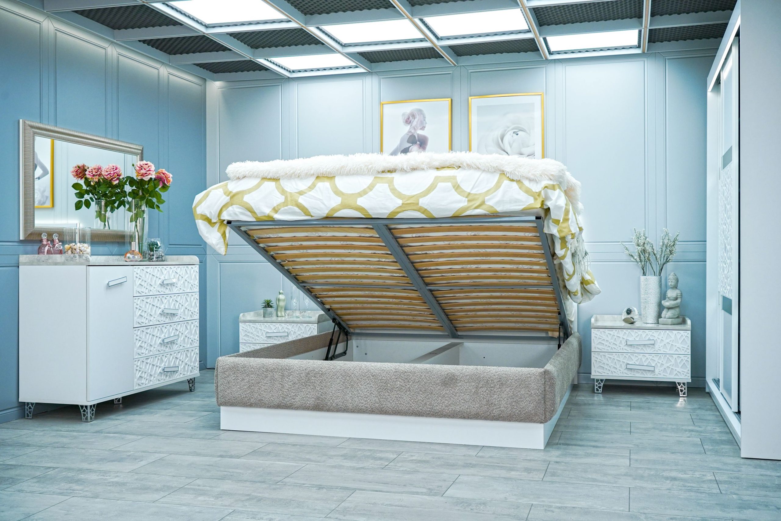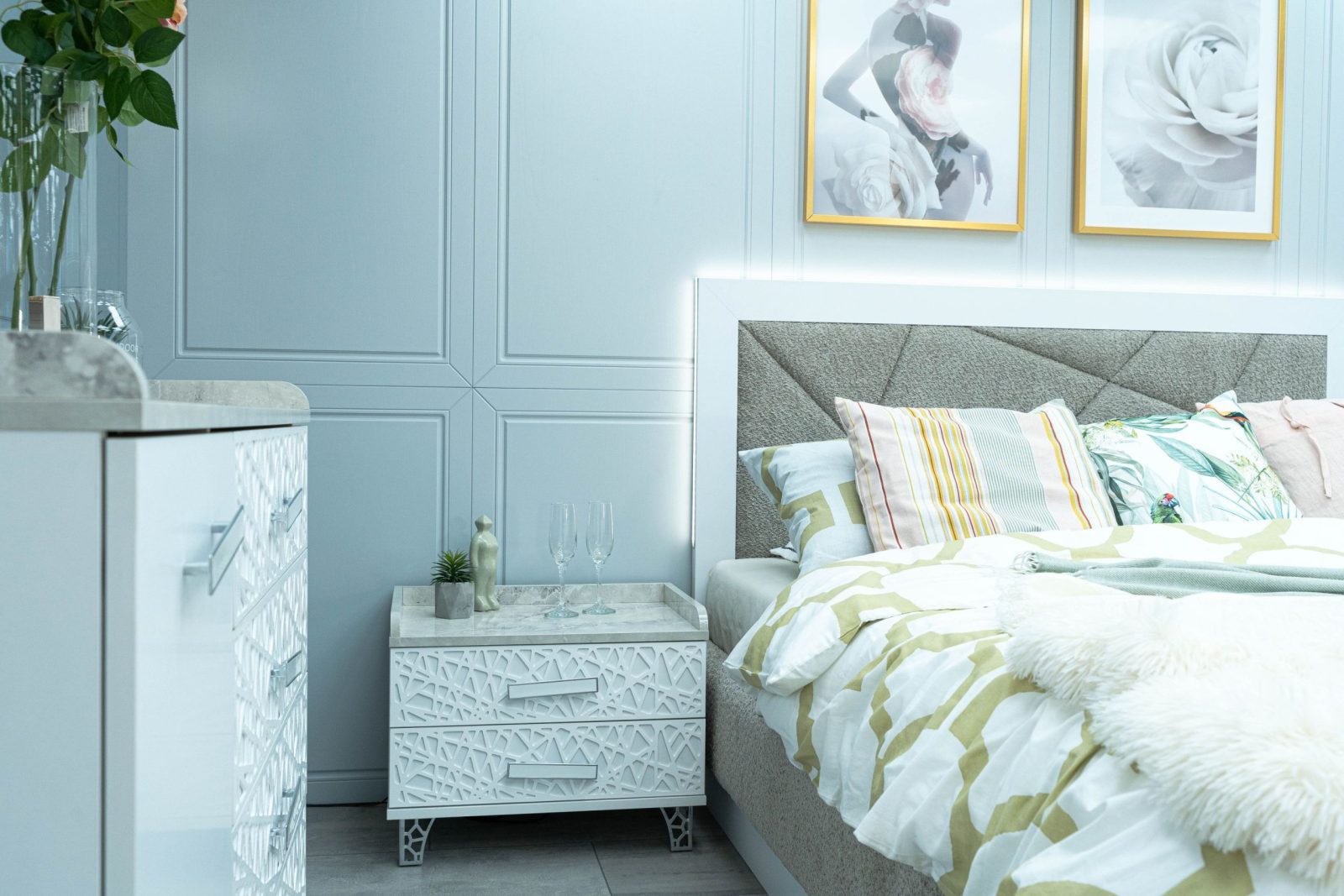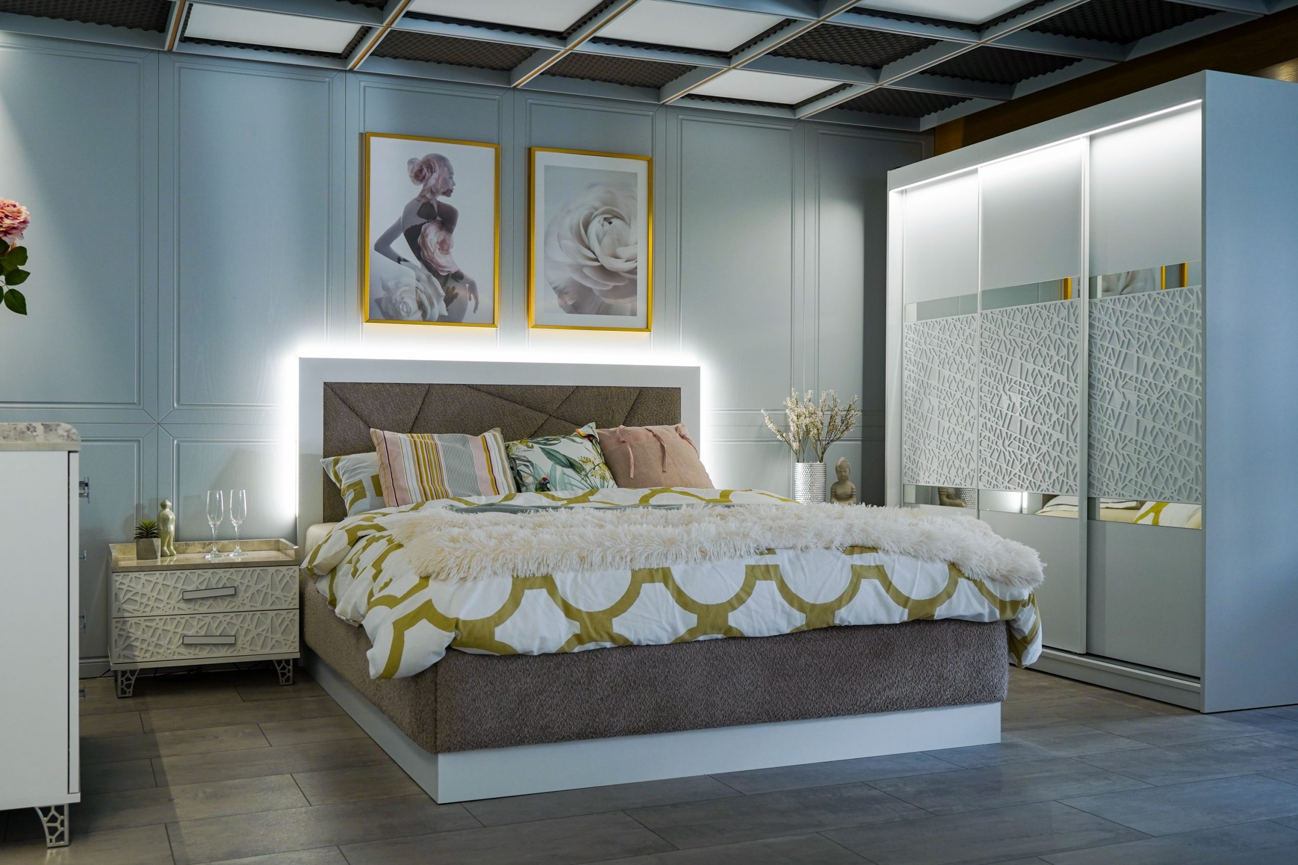 Нощно шкафче: практични чекмеджета, дръжки с покритие – полиран никел и сърцевина от бяла керамика, крака от перфориран полиран никел, вградени МДФ ажурни пана, система скрити водачи Quadro Hettich – плавно затваряне – 2 бр. в к-т;