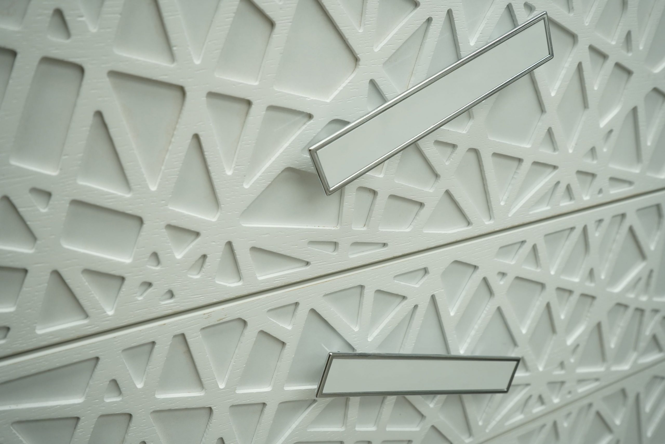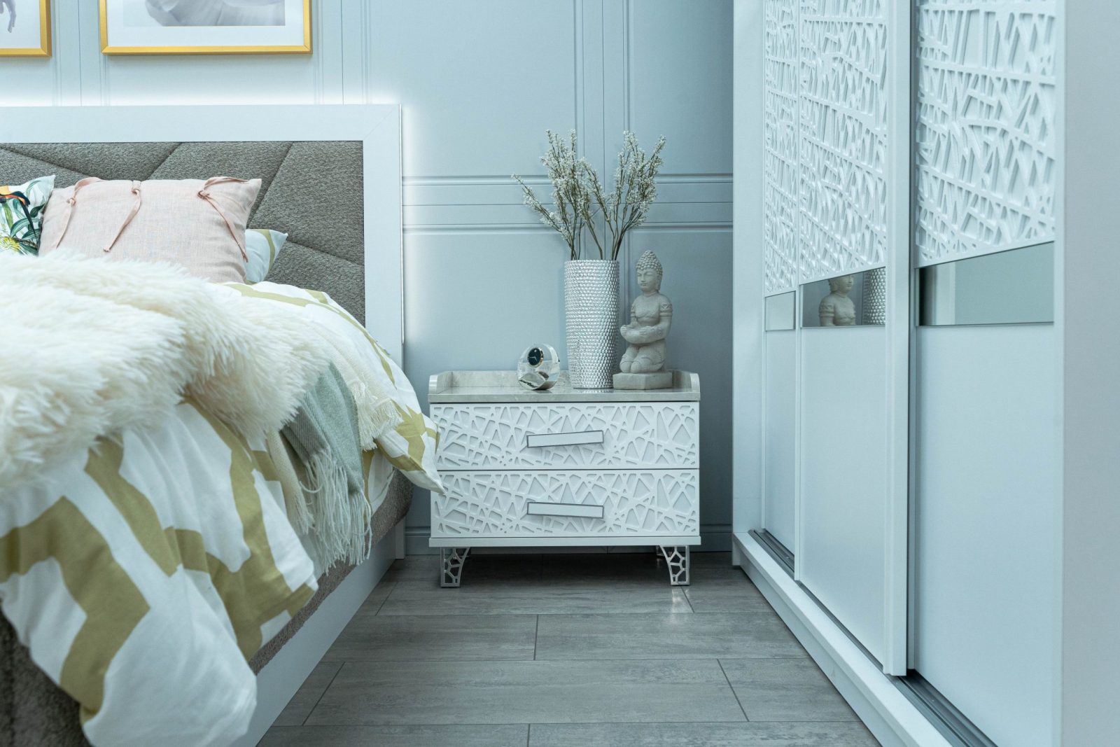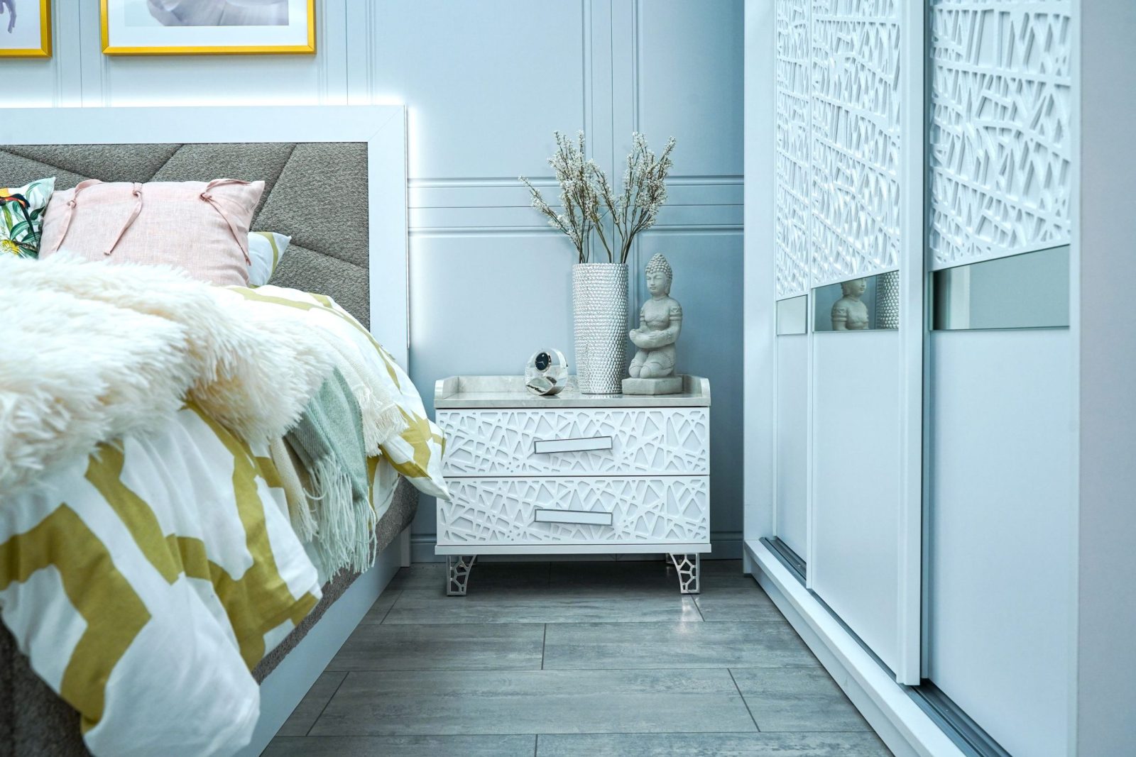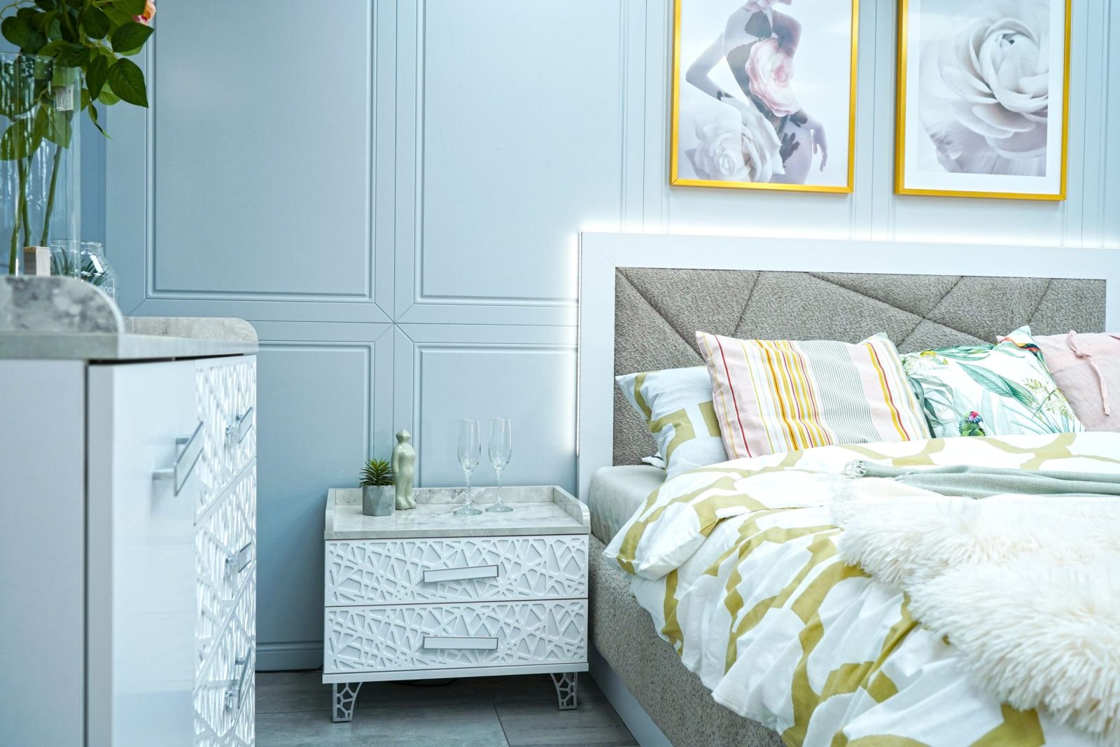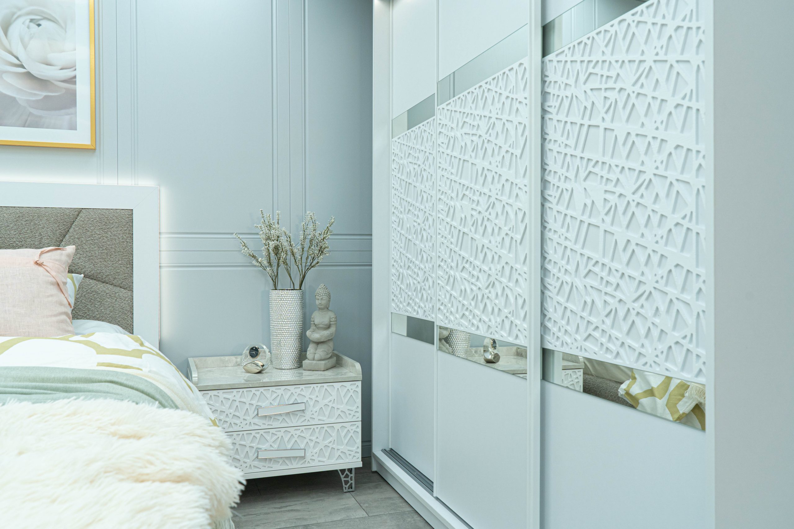 Нощно шкафче: практични чекмеджета, дръжки с покритие – полиран никел и сърцевина от бяла керамика, крака от перфориран полиран никел, вградени МДФ ажурни пана, система скрити водачи Quadro Hettich – плавно затваряне – 2 бр. в к-т;