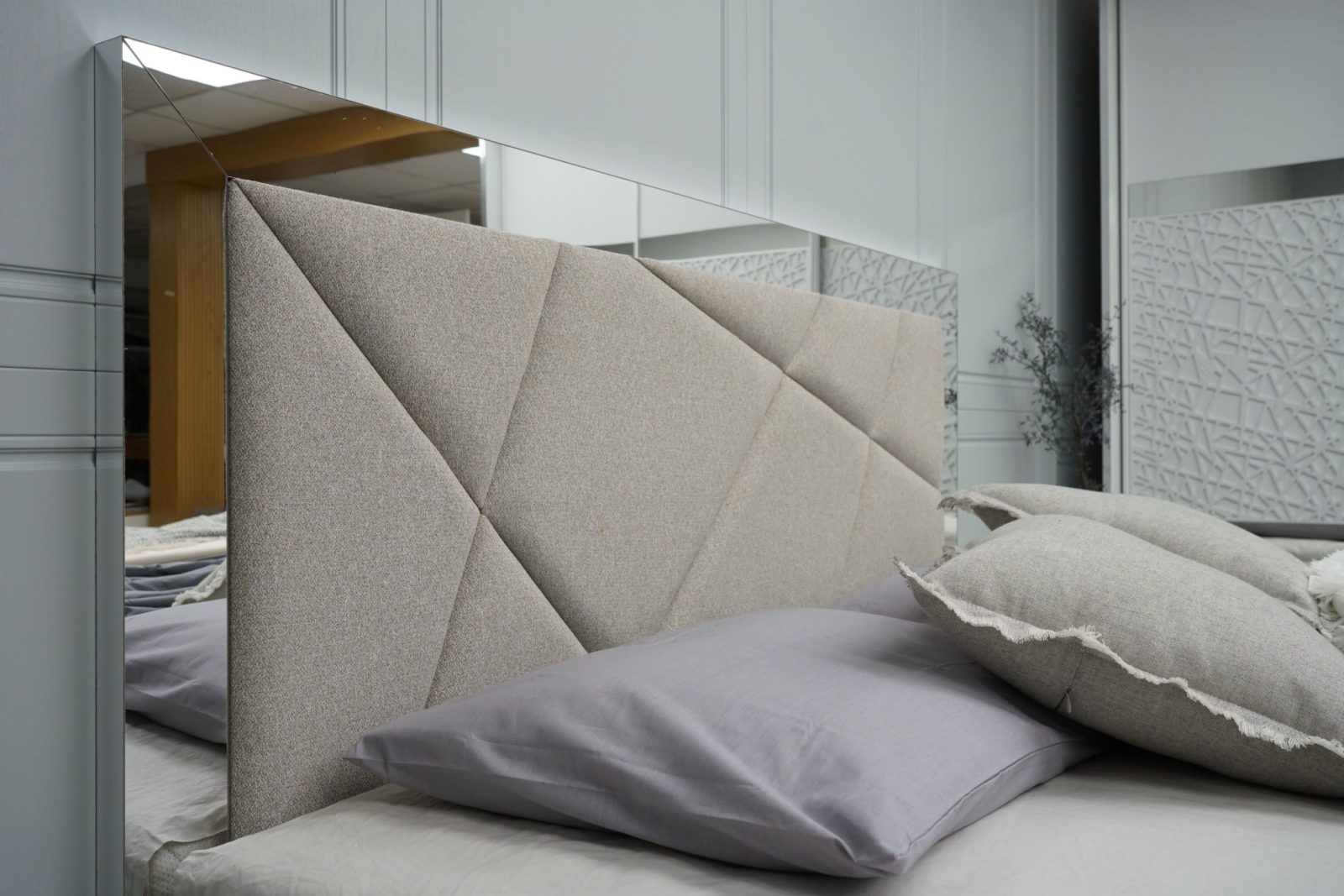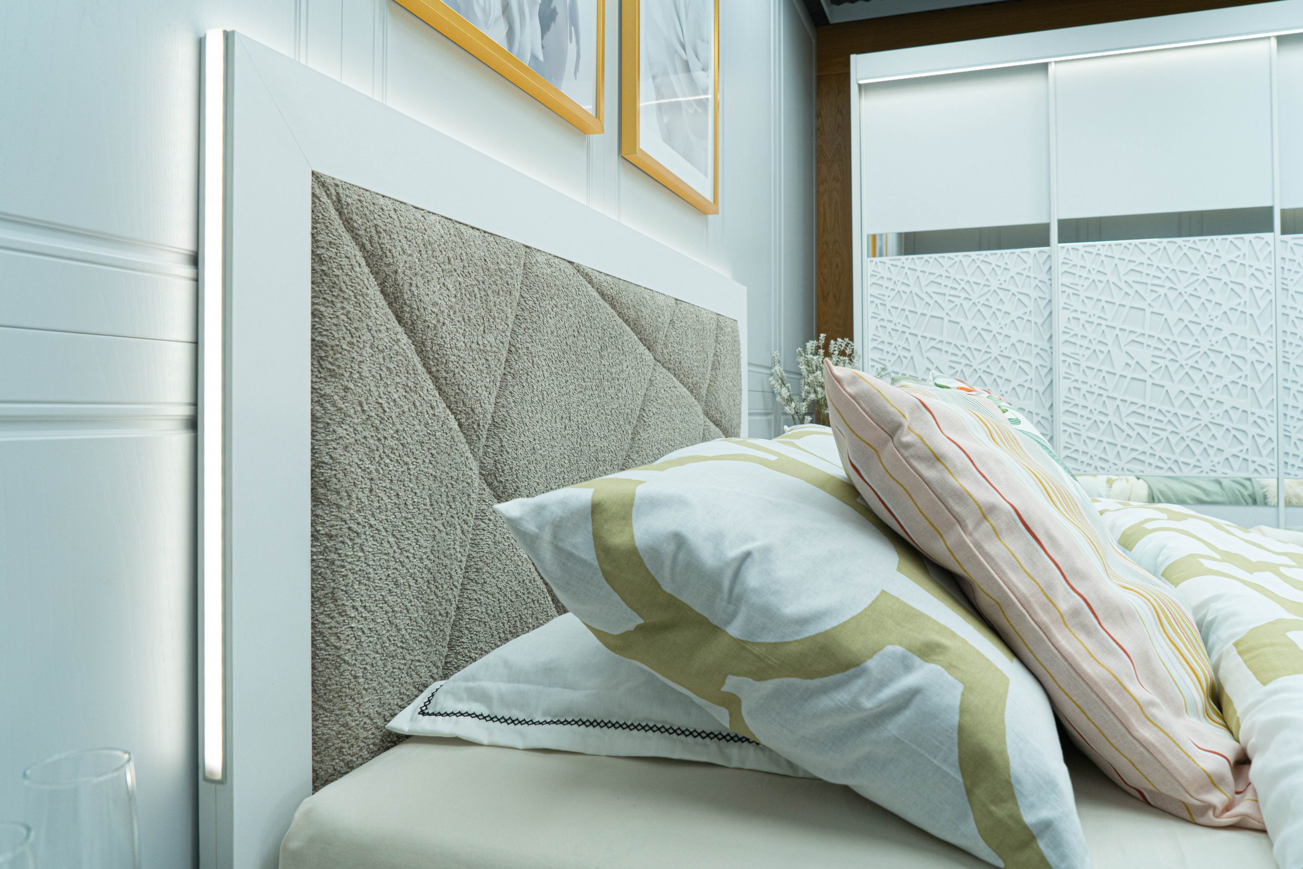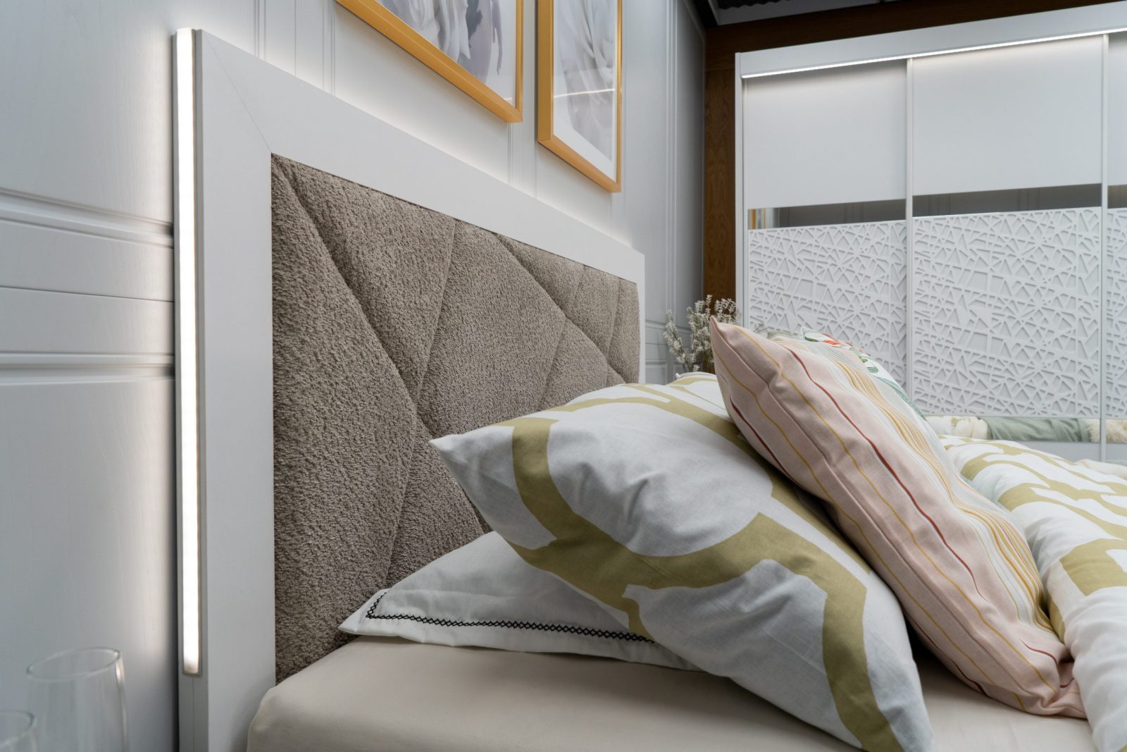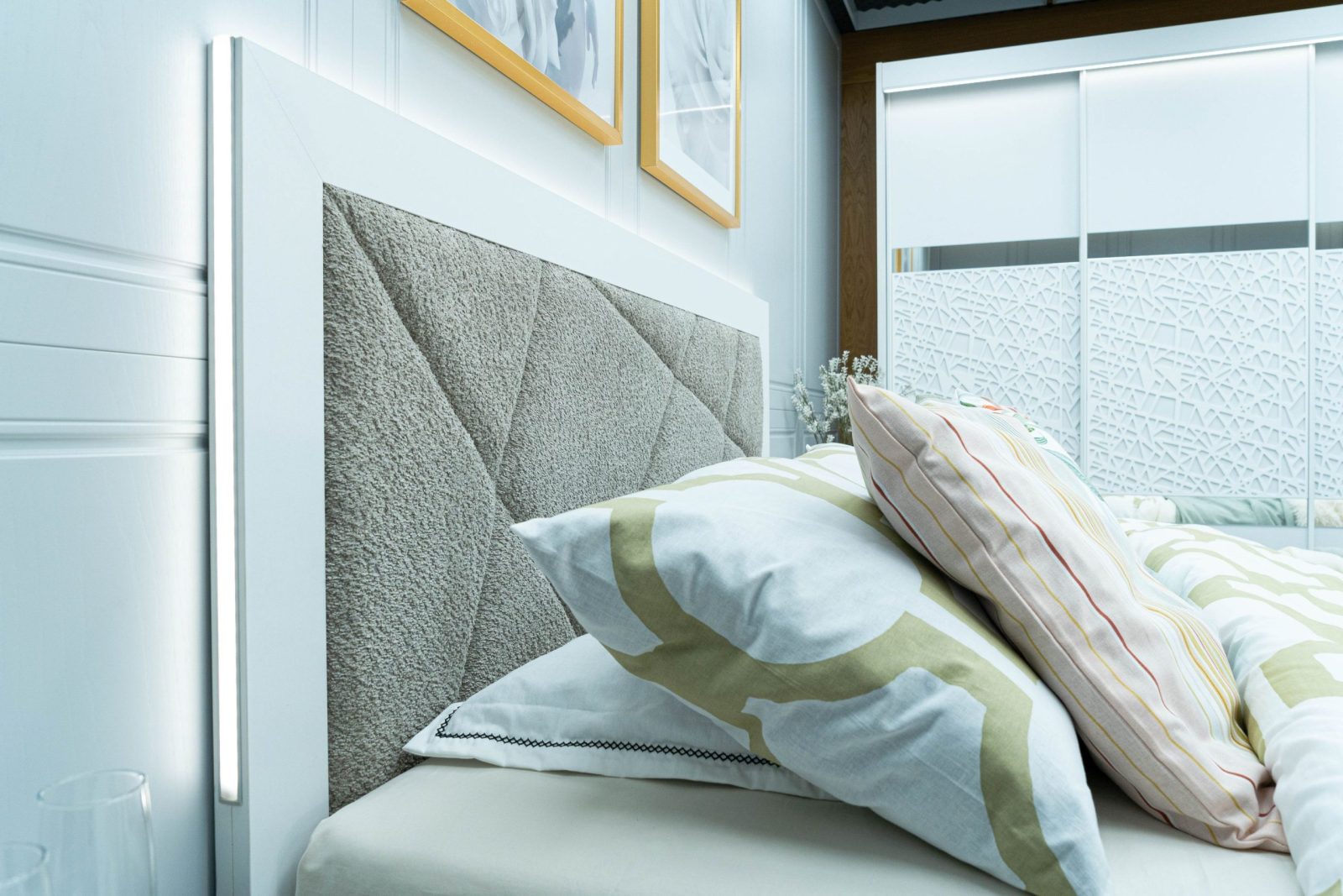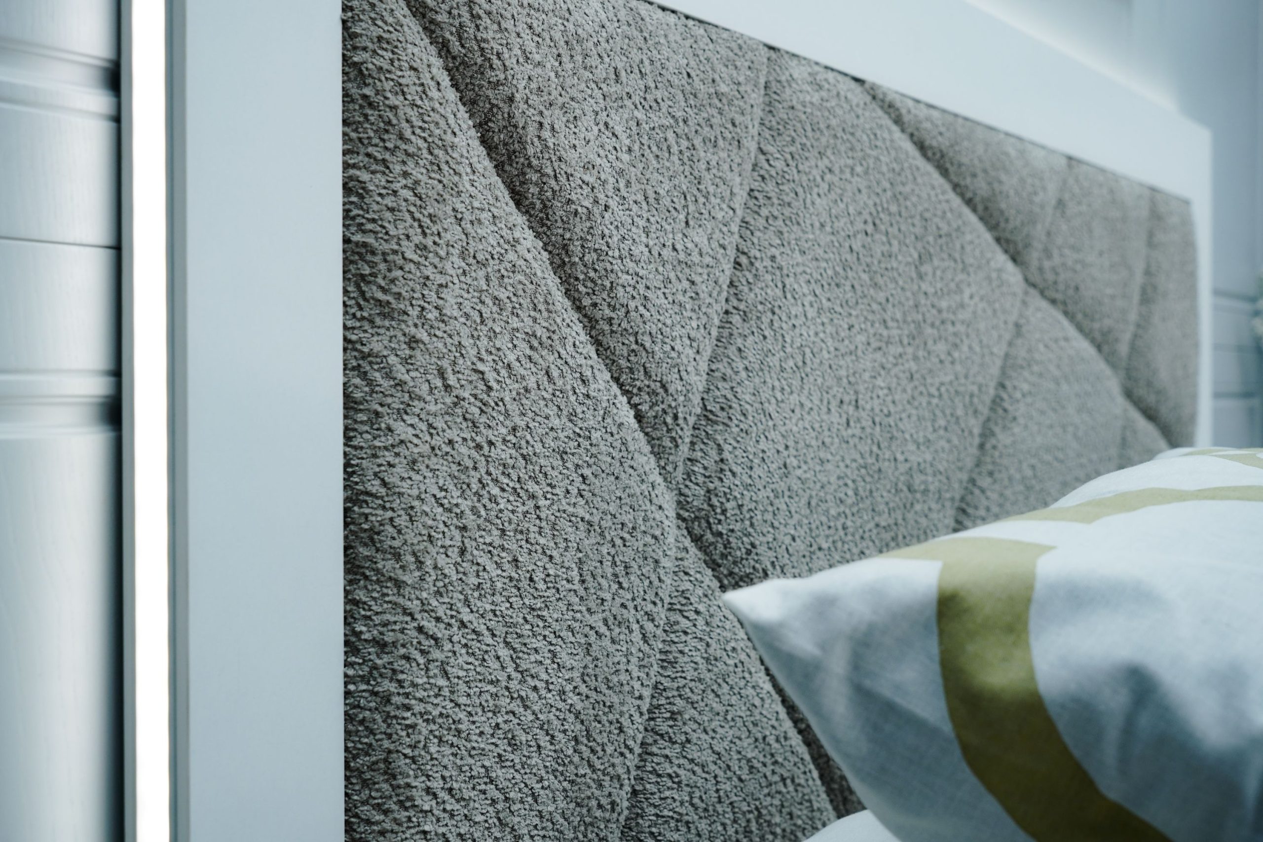 Легло: масивна табла с дебелина 36 мм с вградено LED осветление – режим на работа – сензор – допир контрол, вградените геометрични тапицирани пана са от високоизносовоустойчива дамаска, база за матрак с вграден вътрешен мост гарантиращ прав диагонал на матрака, външни тапицирани царги без външен ръб – високоизносовоустойчива дамаска. Всички използвани сглобки са метални – скрит монтаж – осигуряващи идеален външен вид на изделието, изработено за матрак с размер 160/200.
