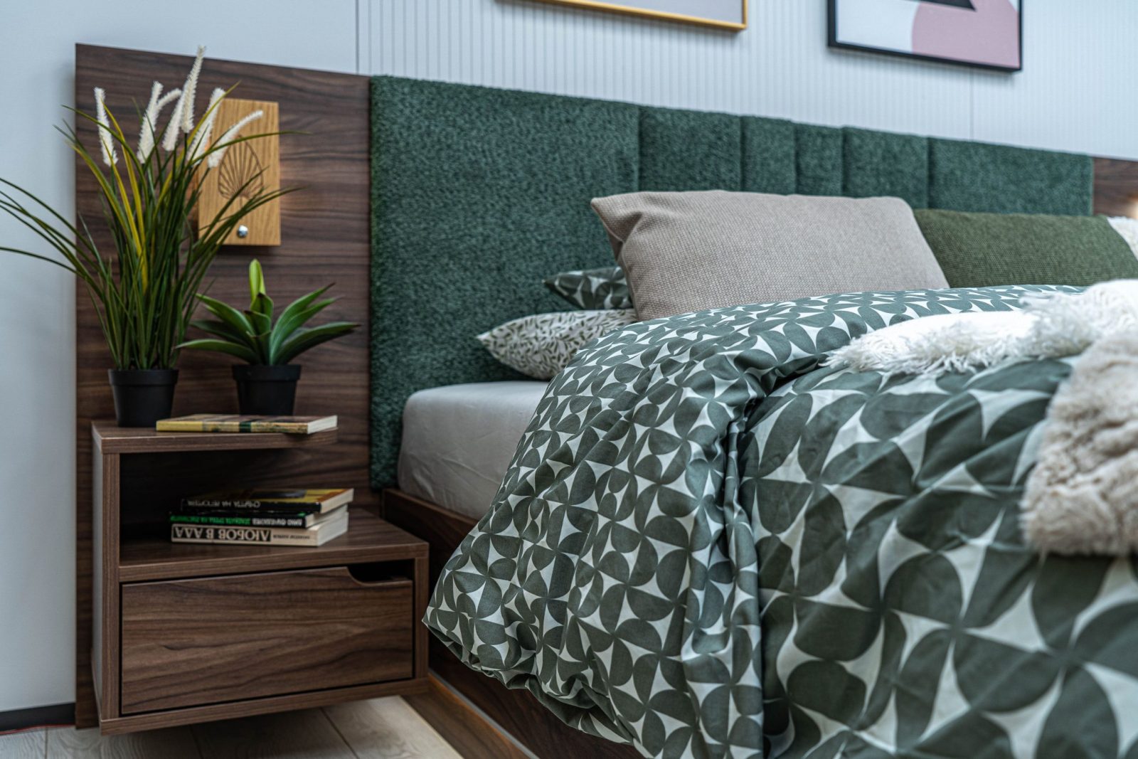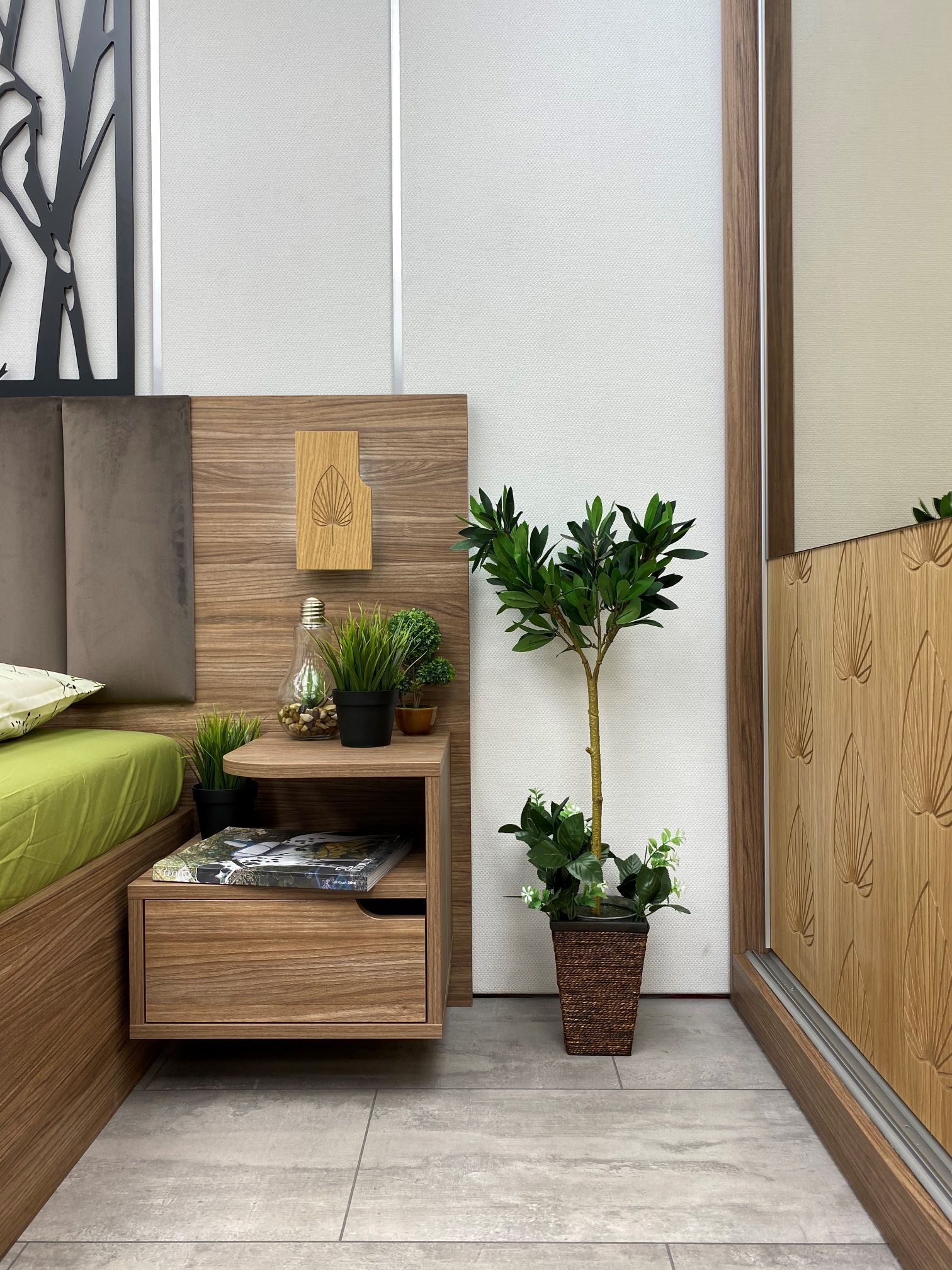 Нощно шкафче: Вградени нощни шкафчета в таблата на леглото – състоящи се от чекмедне с рафт и ниша – заработен захват в челото – тип на отваряне – без дръжка, система скрити водачи Quadro Hettich – плавно затваряне – 2 бр.