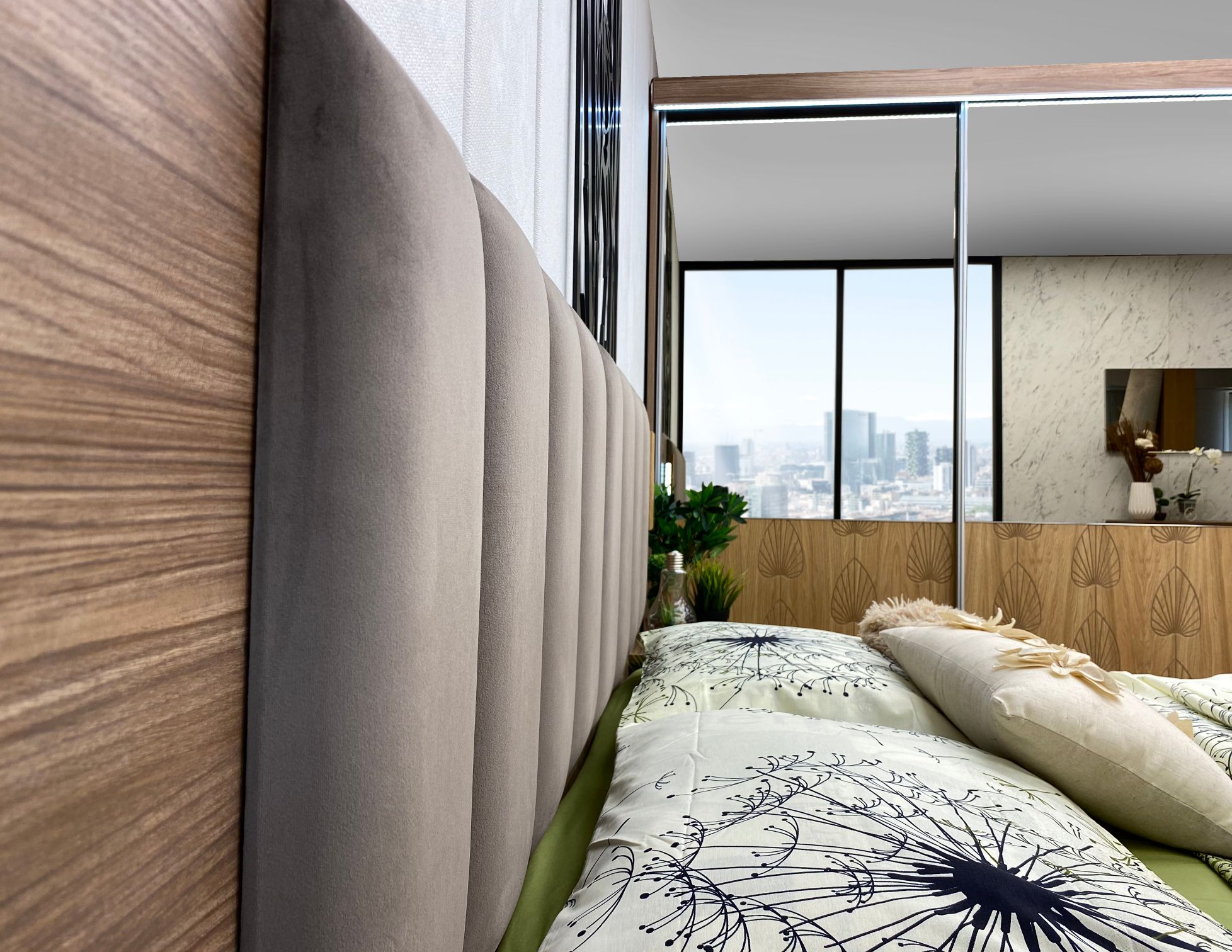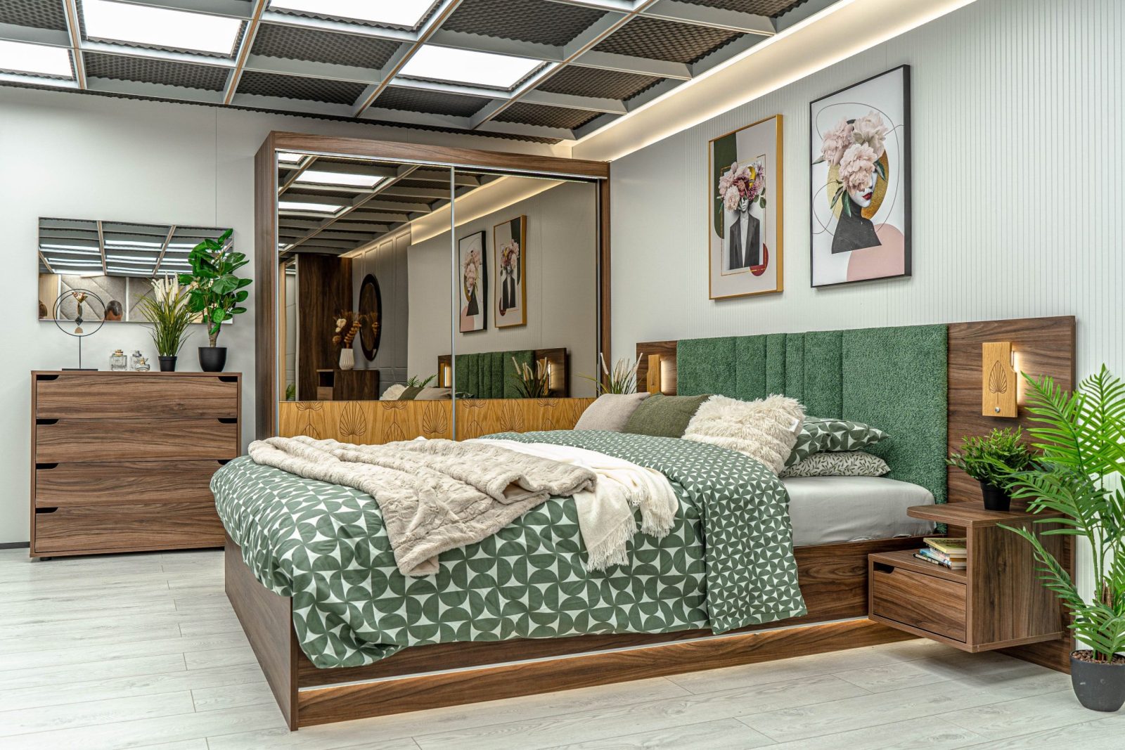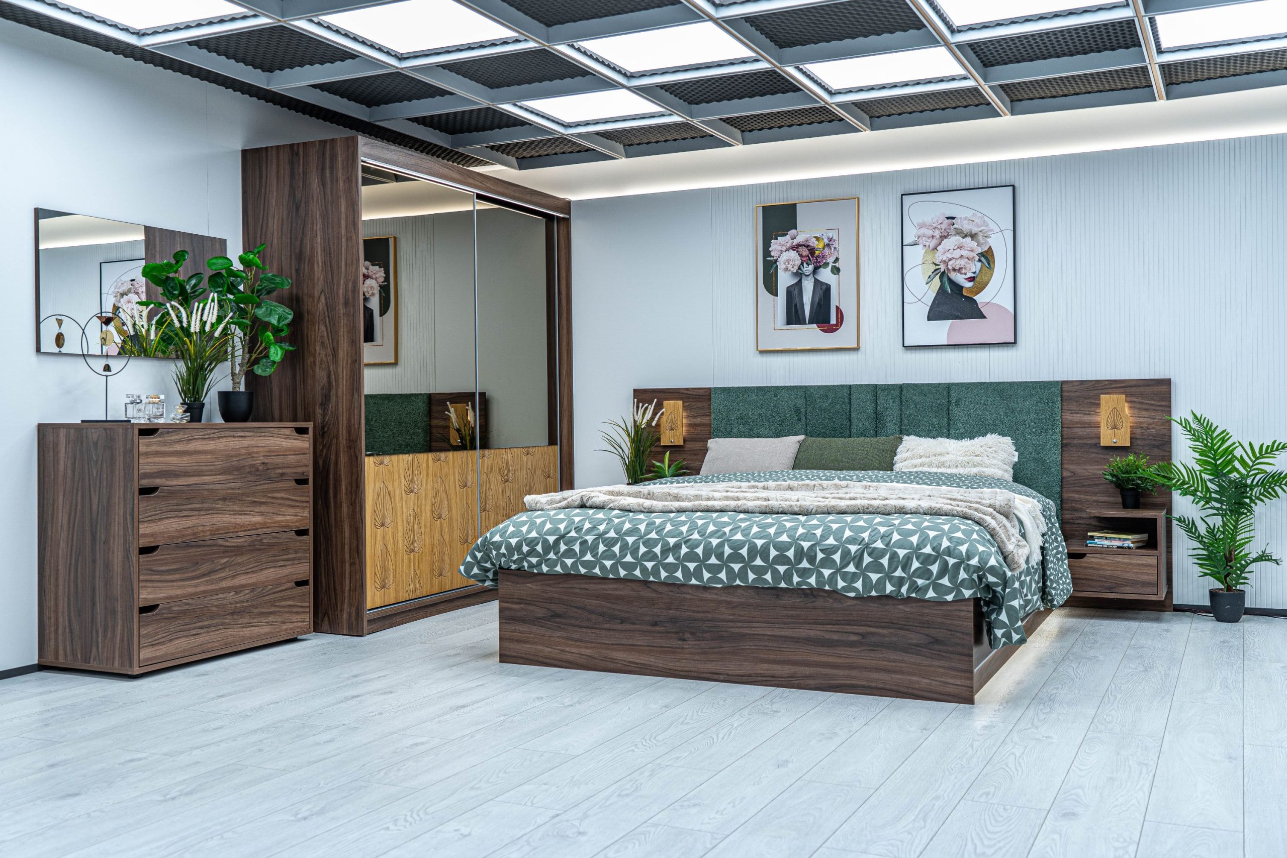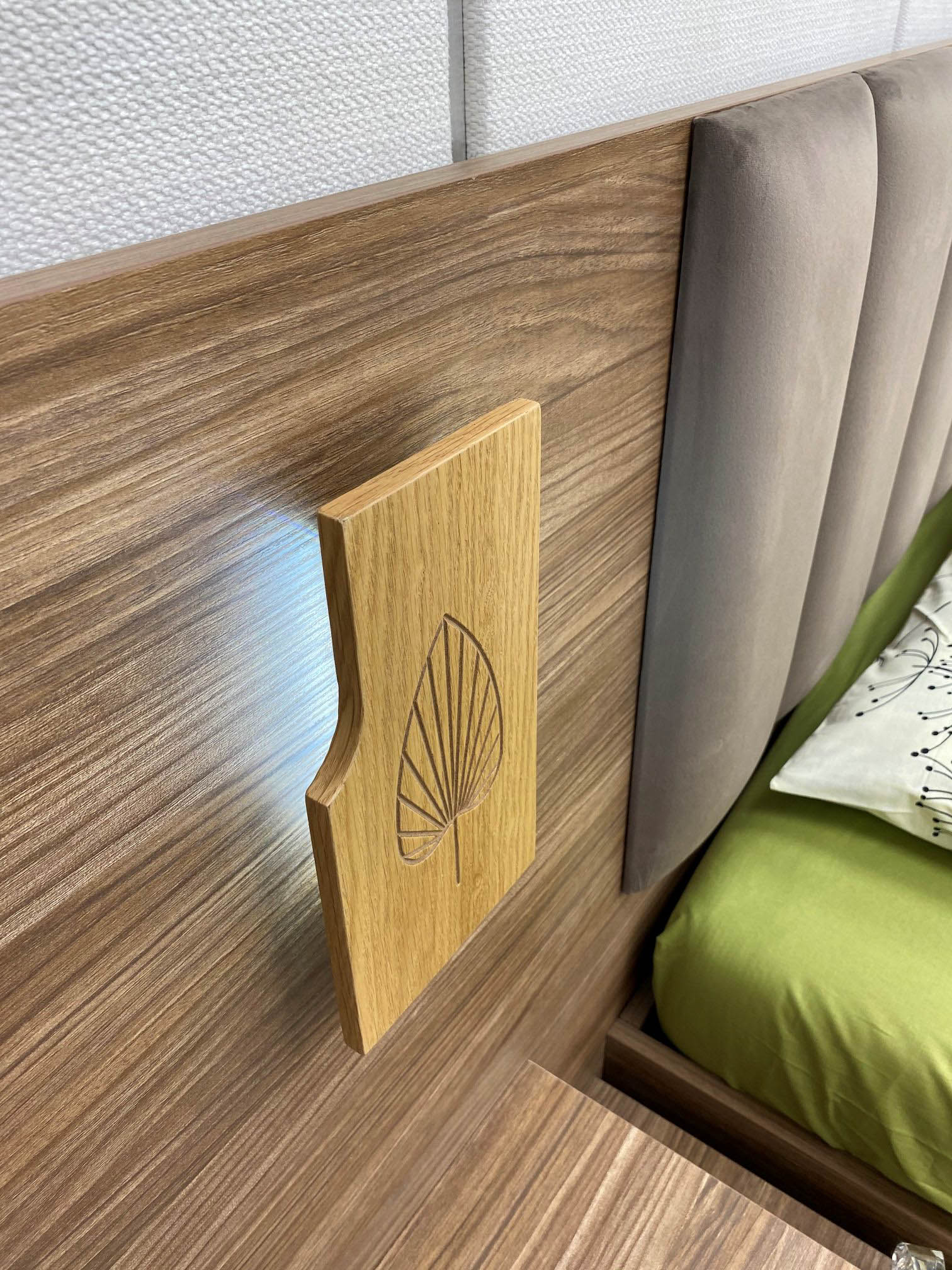 Легло: за матрак 160/200, Основна табла с вгредено LED осветление с плочка от МДФ фурнир дъб – вградена тапицирана табла от висок клас износоустойчив кълцан плюш, цвят – резида, заработен вертикален вътрешен мост в основта на леглото за допълнителна устойчивост и здравина на леглото. Всички сглобки за метални – невидими. Вертикалните царги са сдвоени с обща дебелина 36 мм. Плочката с LED осветление на таблата е с режим на работа – сензор за допир.