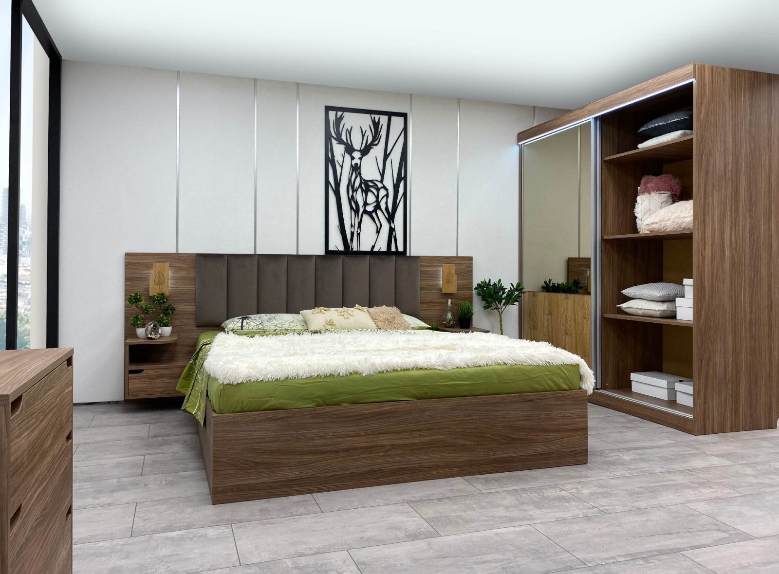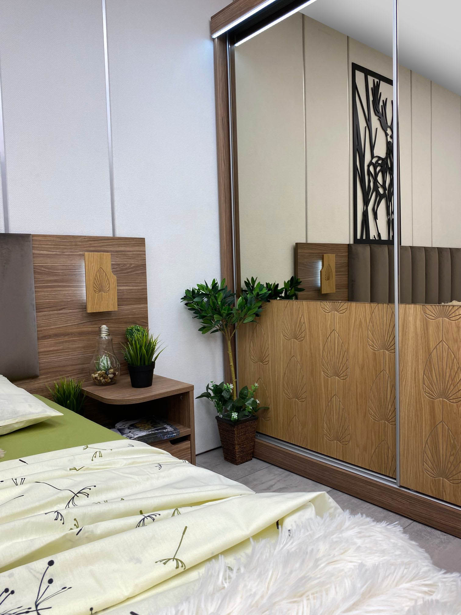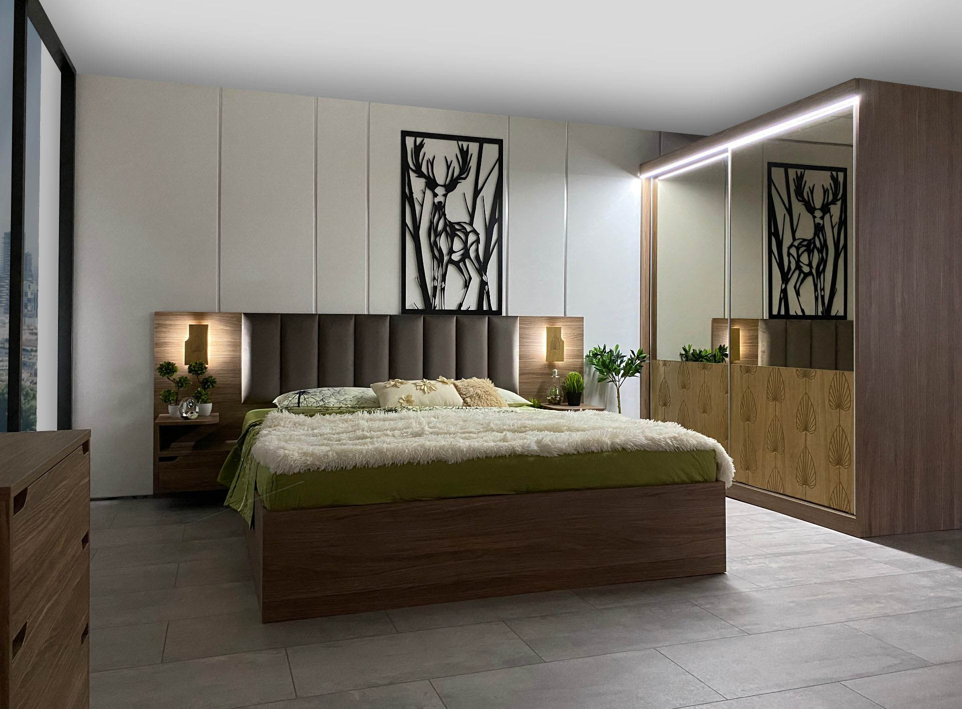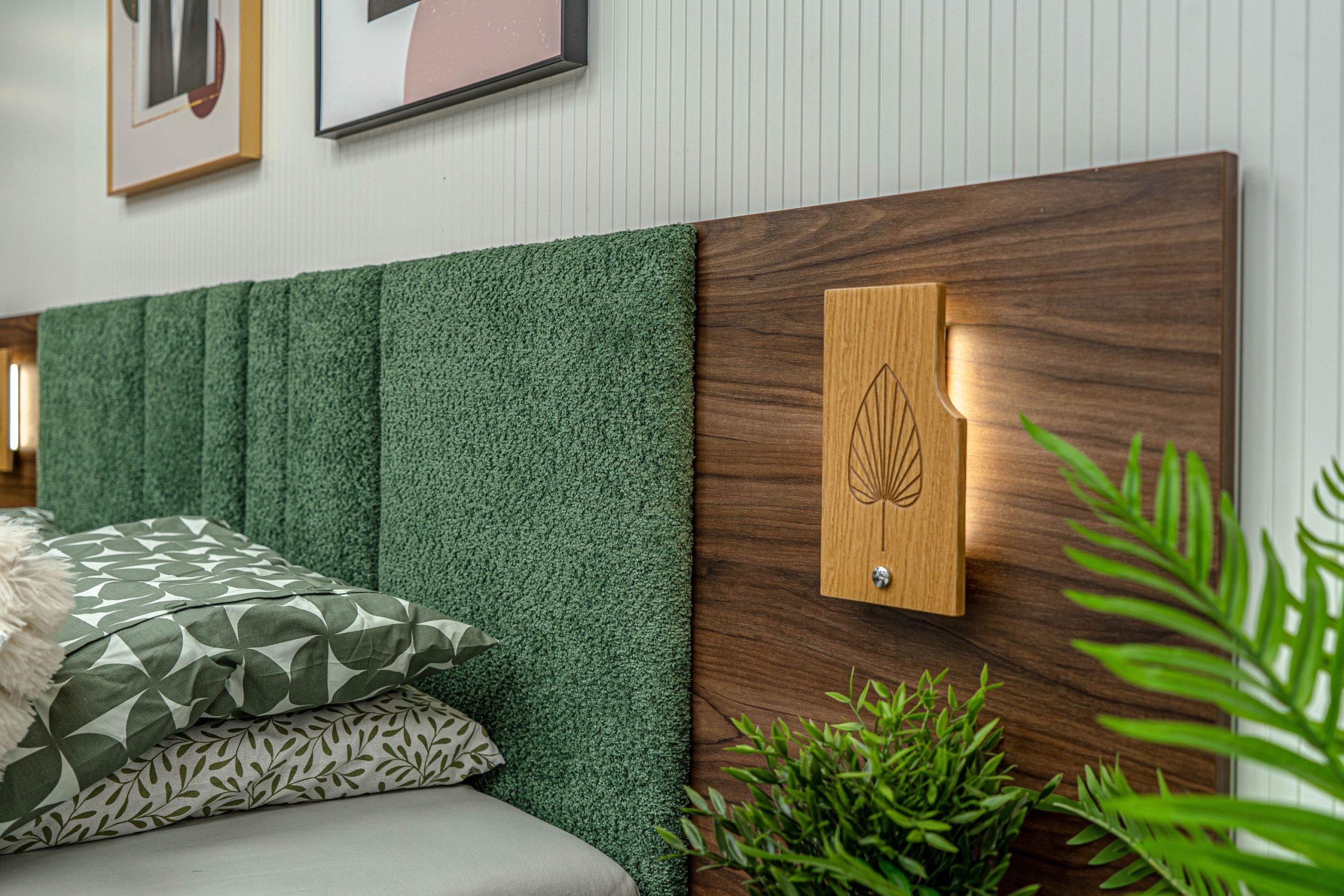 Легло: за матрак 160/200, Основна табла с вгредено LED осветление с плочка от МДФ фурнир дъб – вградена тапицирана табла от висок клас износоустойчив кълцан плюш, цвят – резида, заработен вертикален вътрешен мост в основта на леглото за допълнителна устойчивост и здравина на леглото. Всички сглобки за метални – невидими. Вертикалните царги са сдвоени с обща дебелина 36 мм. Плочката с LED осветление на таблата е с режим на работа – сензор за допир.