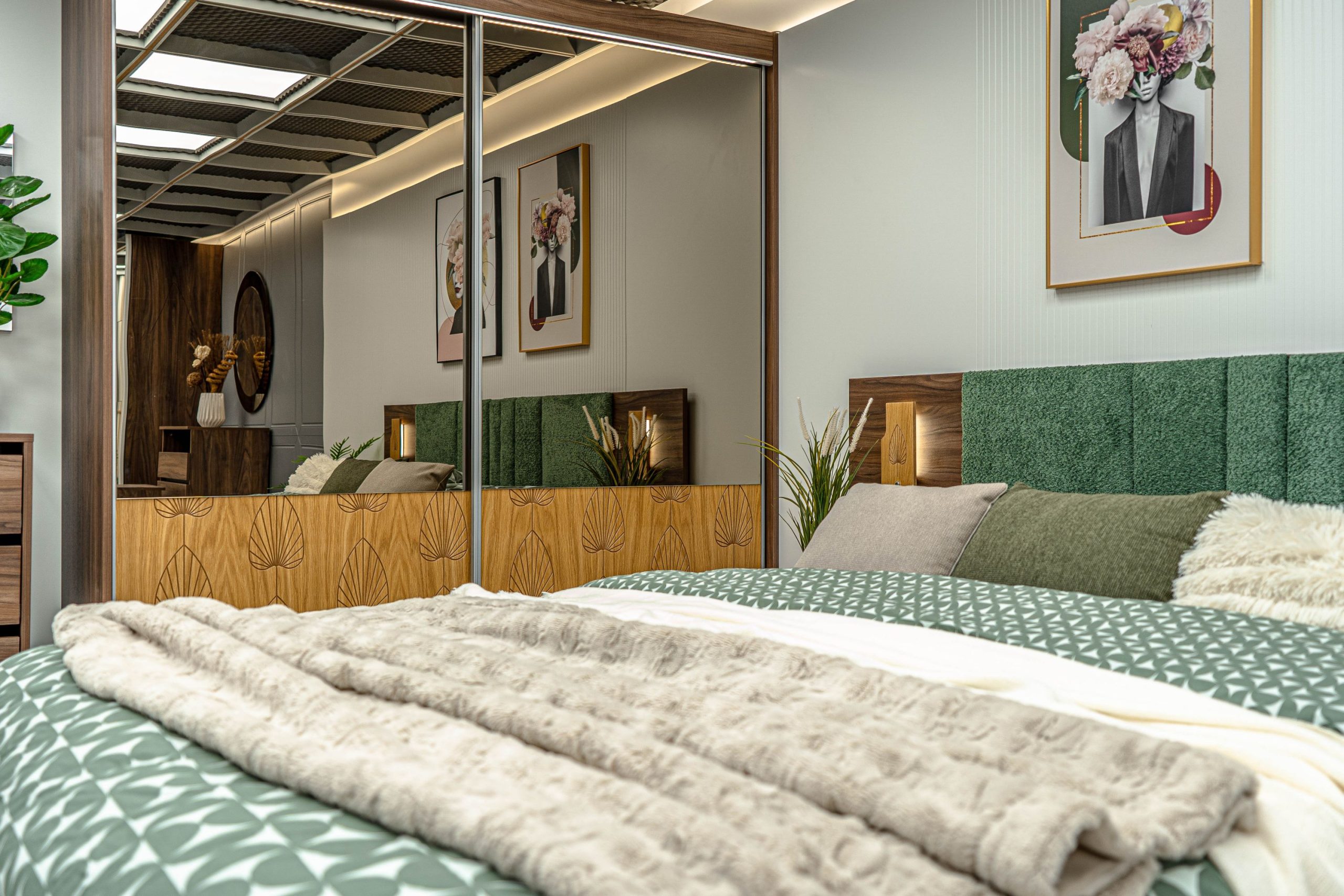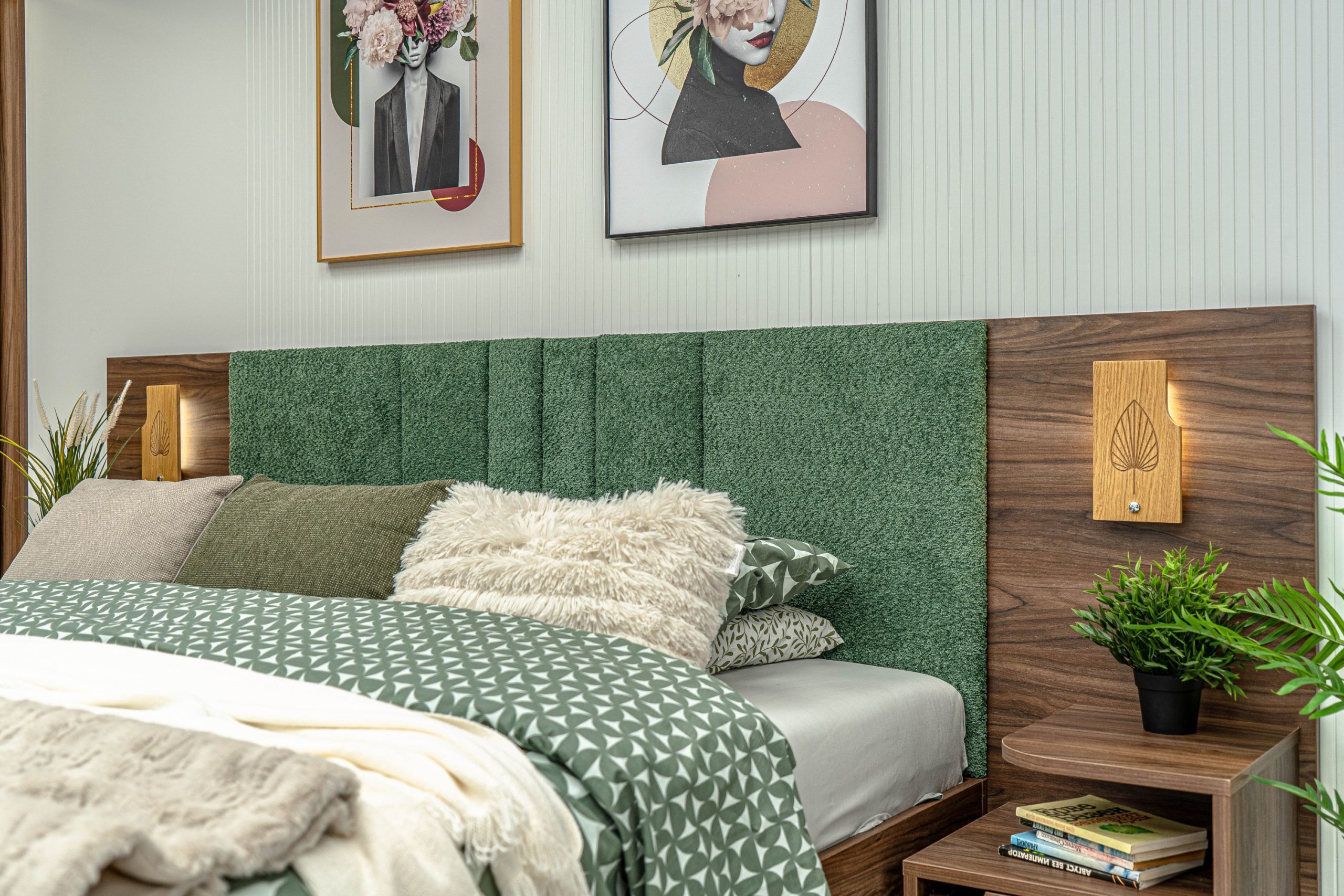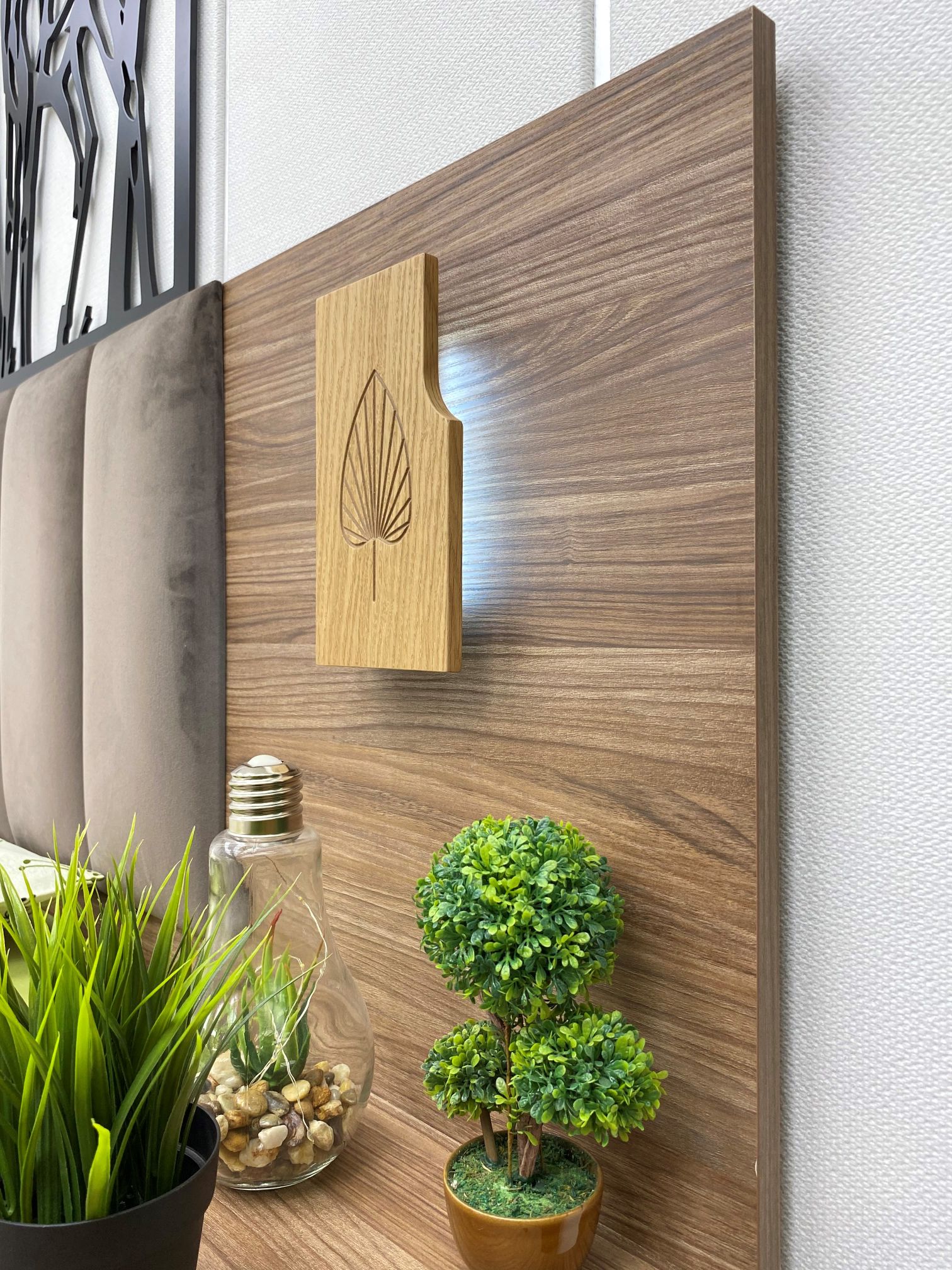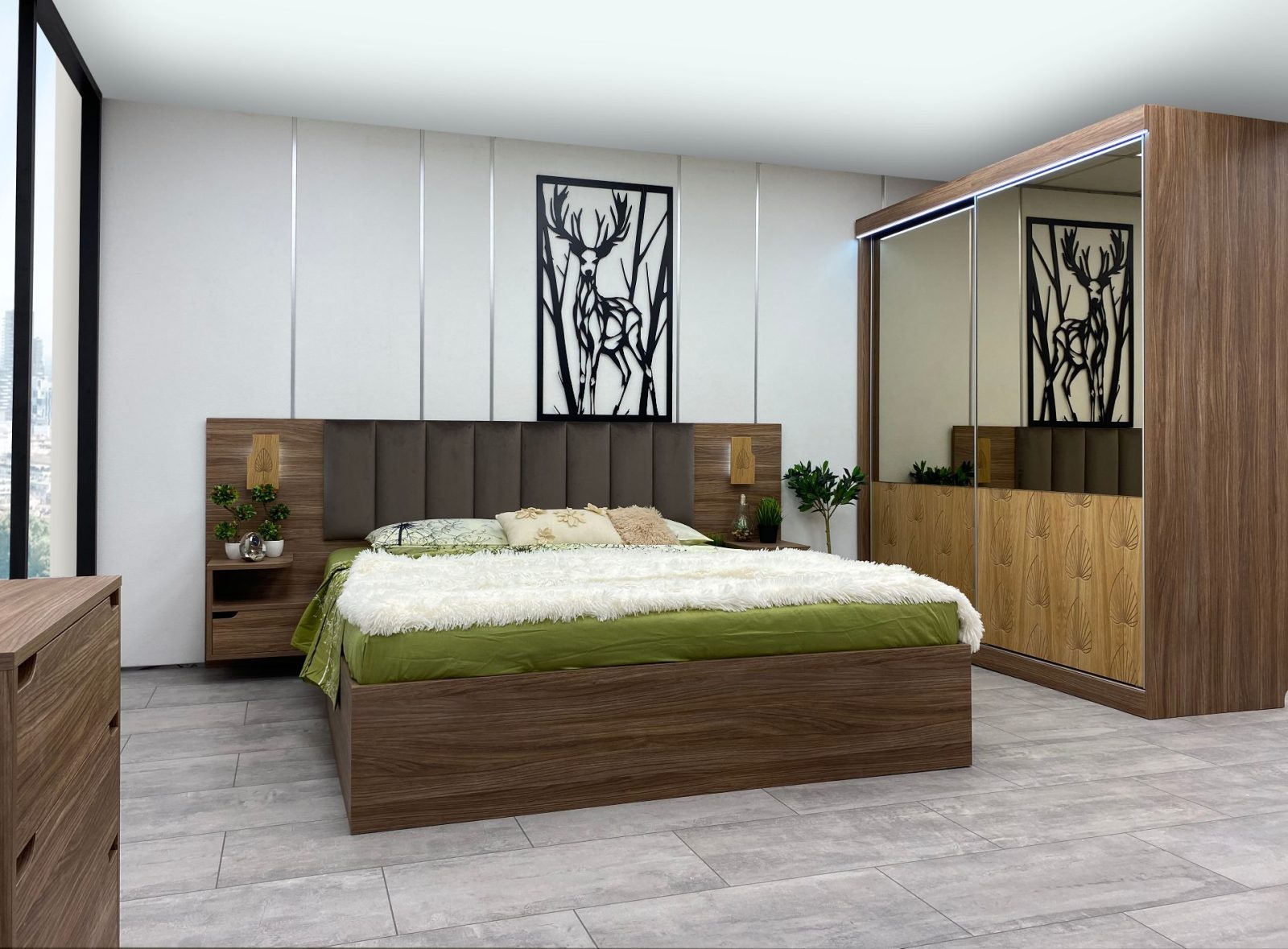Легло: за матрак 160/200, Основна табла с вгредено LED осветление с плочка от МДФ фурнир дъб – вградена тапицирана табла от висок клас износоустойчив кълцан плюш, цвят – резида, заработен вертикален вътрешен мост в основта на леглото за допълнителна устойчивост и здравина на леглото. Всички сглобки за метални – невидими. Вертикалните царги са сдвоени с обща дебелина 36 мм. Плочката с LED осветление на таблата е с режим на работа – сензор за допир.