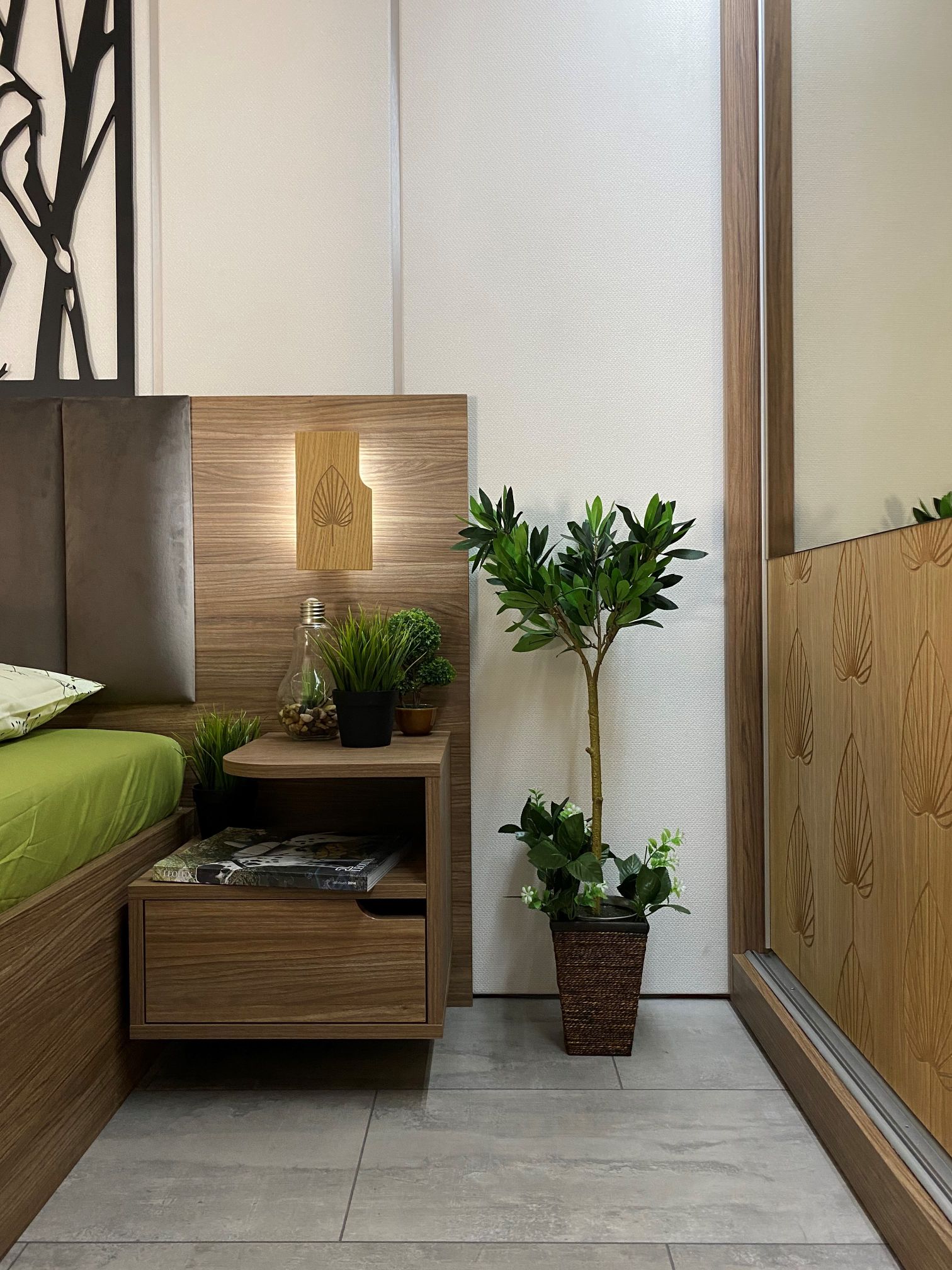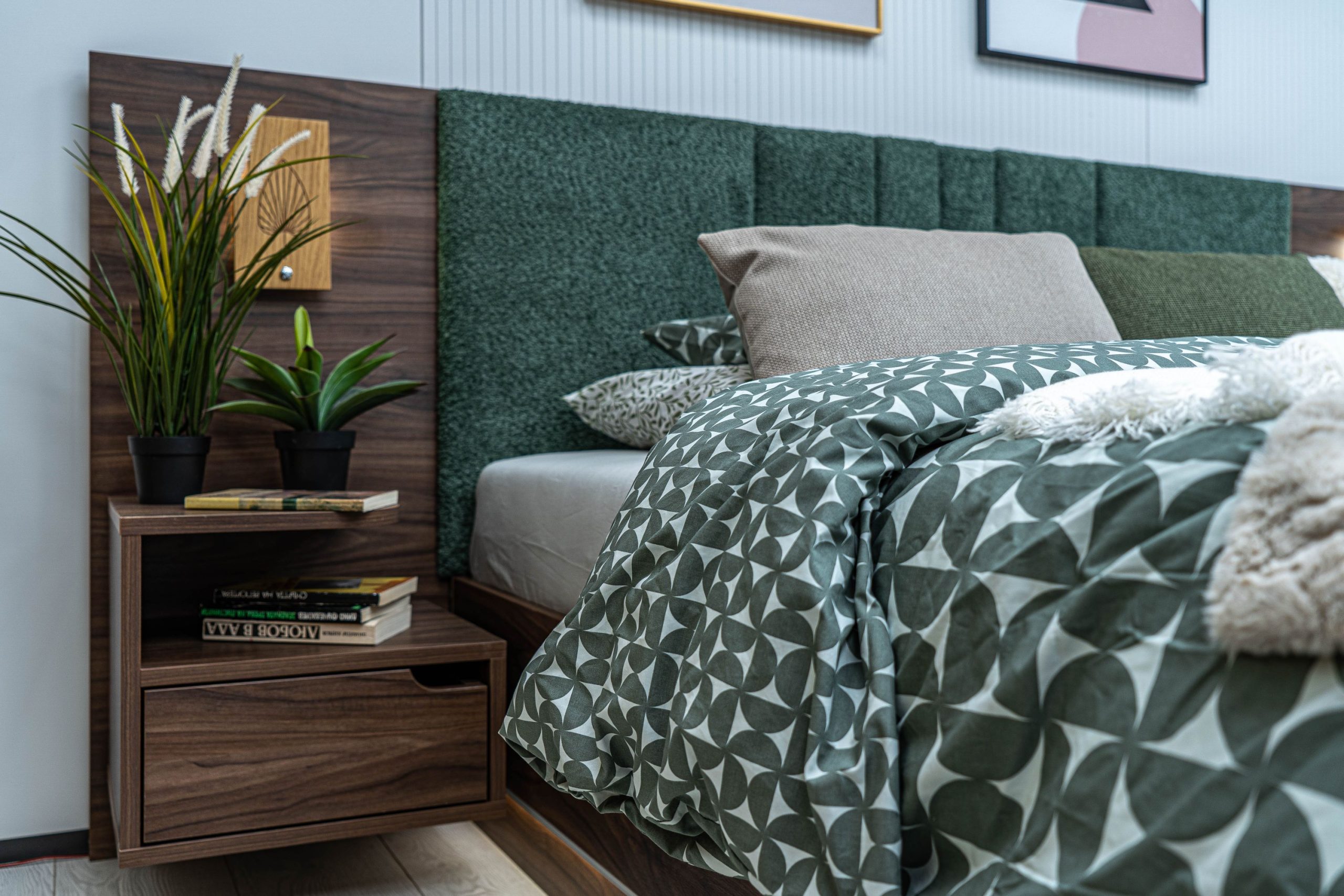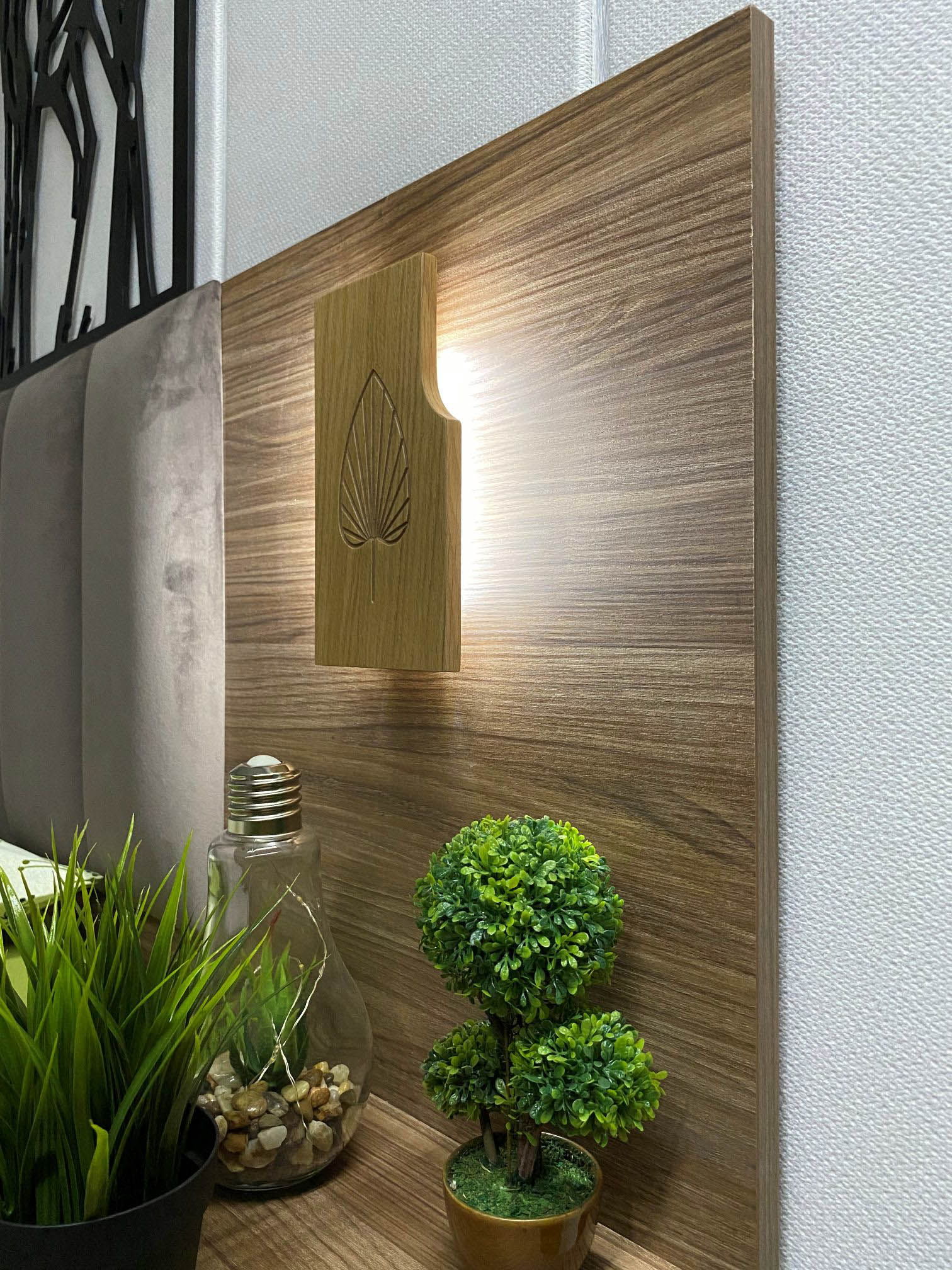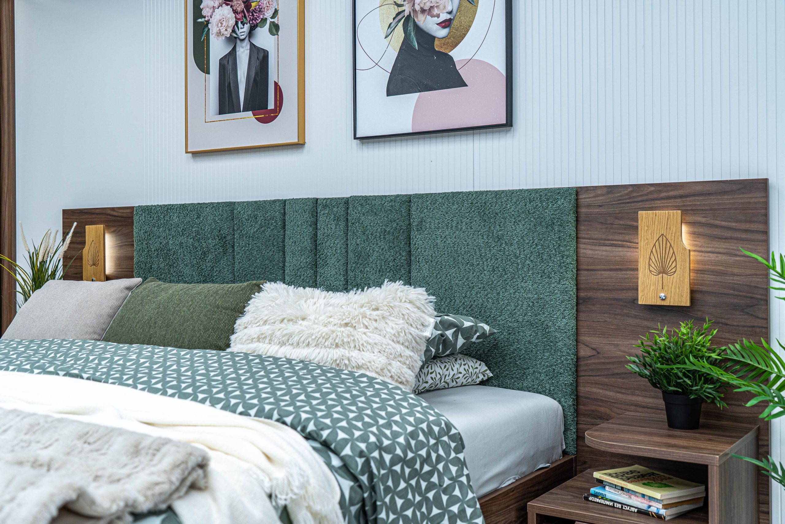 Легло: за матрак 160/200, Основна табла с вгредено LED осветление с плочка от МДФ фурнир дъб – вградена тапицирана табла от висок клас износоустойчив кълцан плюш, цвят – резида, заработен вертикален вътрешен мост в основта на леглото за допълнителна устойчивост и здравина на леглото. Всички сглобки за метални – невидими. Вертикалните царги са сдвоени с обща дебелина 36 мм. Плочката с LED осветление на таблата е с режим на работа – сензор за допир.