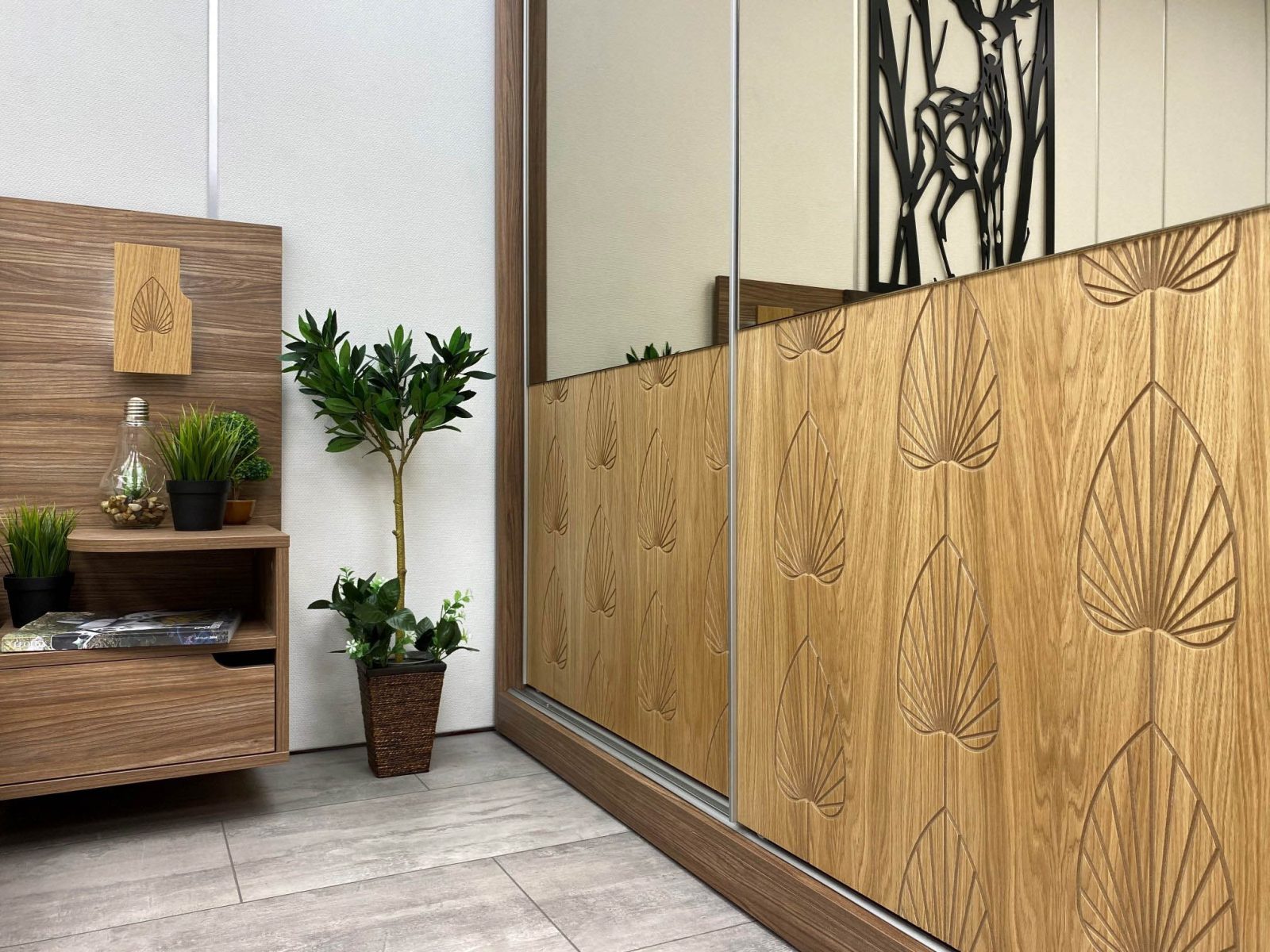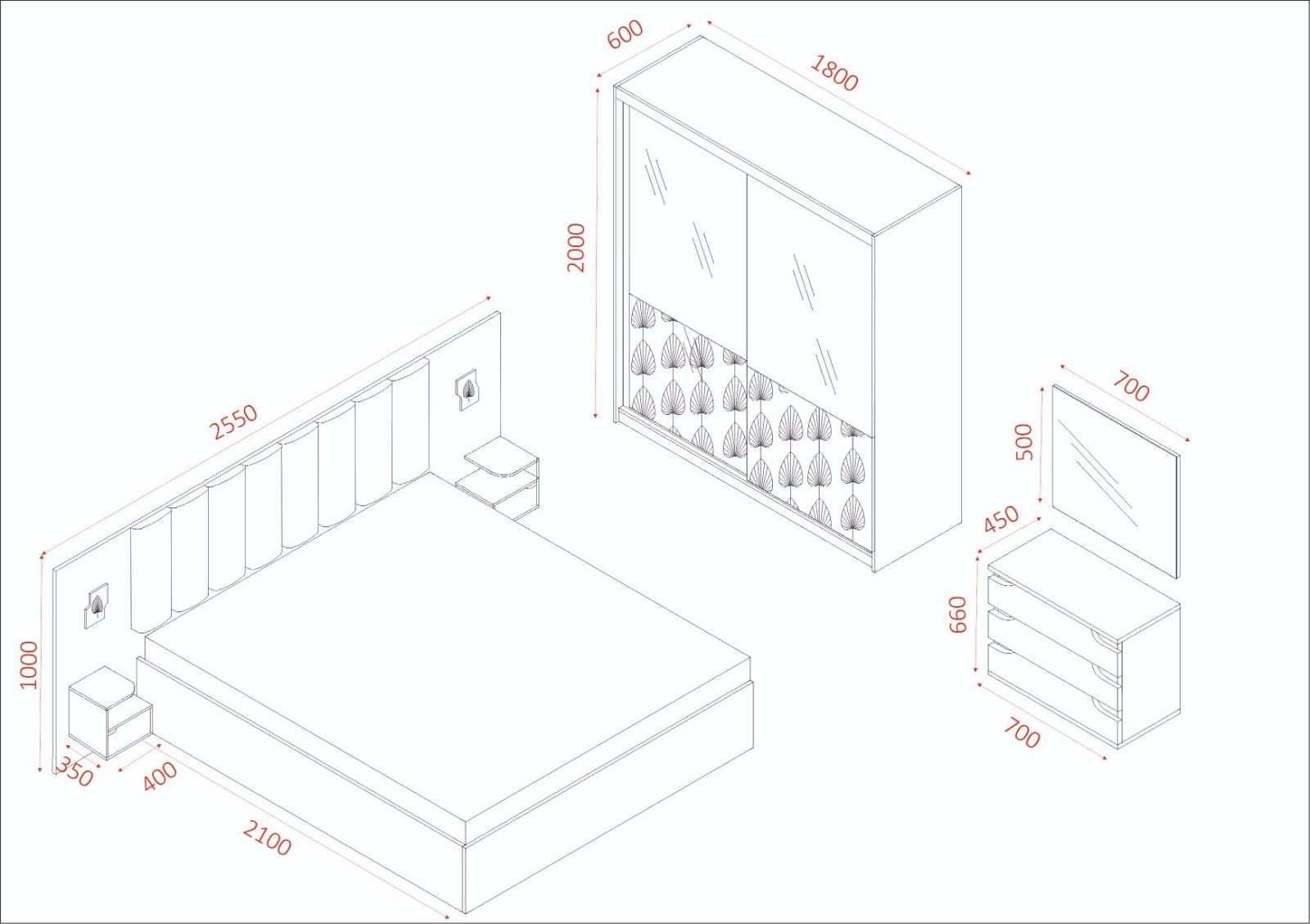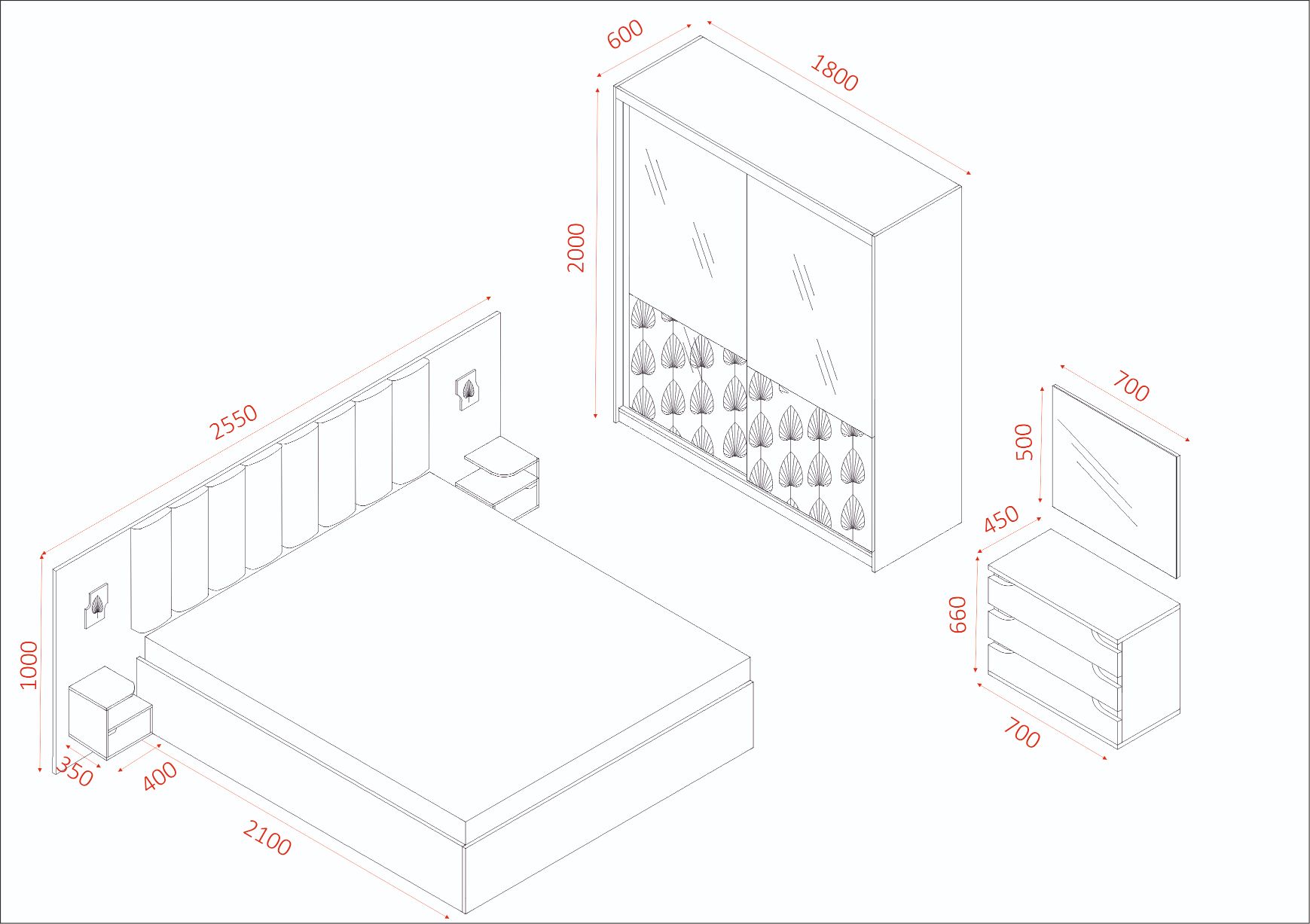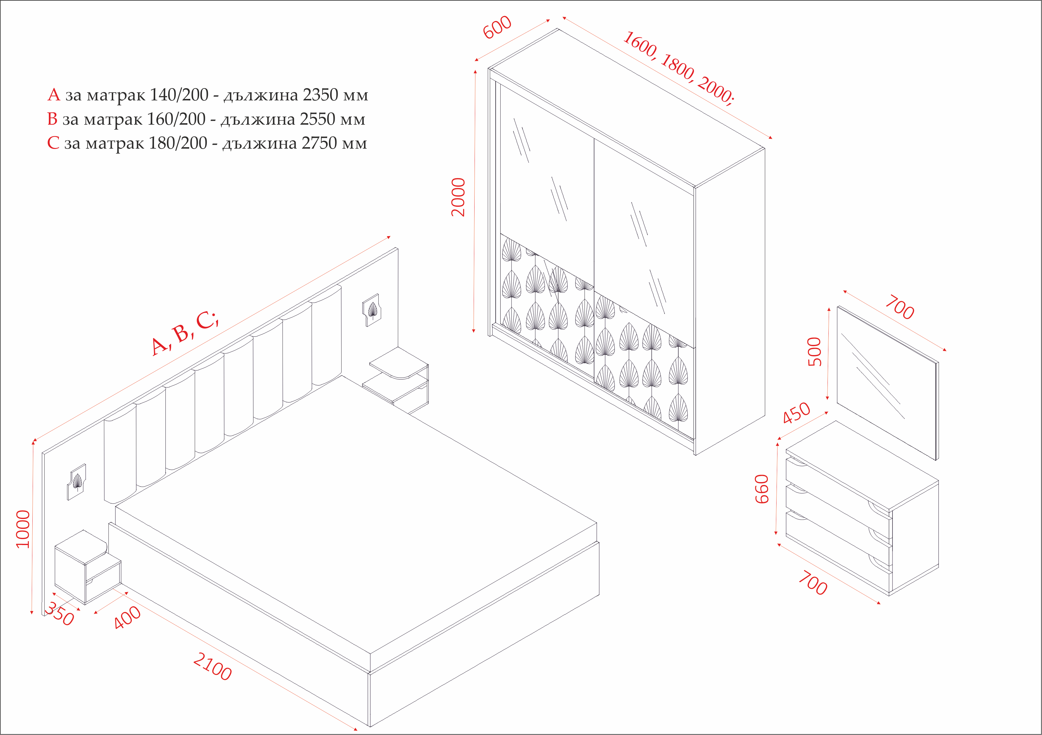 Гардероб: Плъзгаща с вътрешно водене с вертикално разположени вградени алуминиеви „П“- образни кант дръжки, с допълнително излят външен улей за лесно и удобно захващане, спомагащи ефективното плъзгане на системата и гарантиращи устойчивост и здравина на вратите; използвани са сглобки за скрит монтаж, метални рафтоносачи за стабилност на рафтовете, лост за дрехи – метален с форма на елипса и покритие никел. Вградени огледала – нюанс на покритието – опушен бронз. Цялата конструкция на гардероба е монтирана върху метални реглажни „пети“, осигуряващи изрядна нивелация на изделието за правилната му експлоатация, Долни пана на вратите -от гравиран МДФ естествен фурнир дъб – 18 мм;
