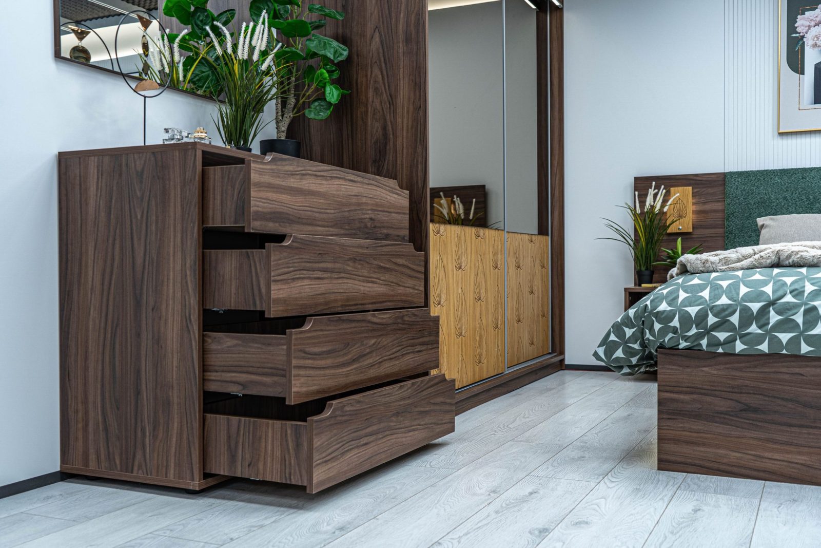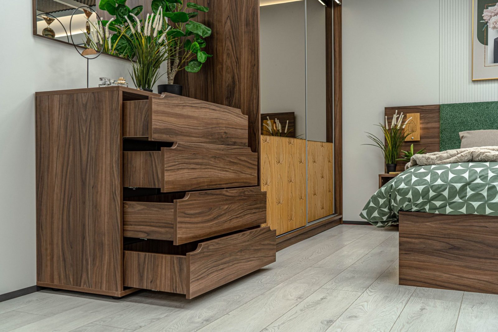 Скрин с огледало – вкл в цената! Четири дълбоки и практични чекмеджета – заработен захват в челото – тип на отваряне – без дръжка, система скрити водачи Quadro Hettich – плавно затваряне, паното с огледало е с опция за хоризонтален и вертикален монтаж;