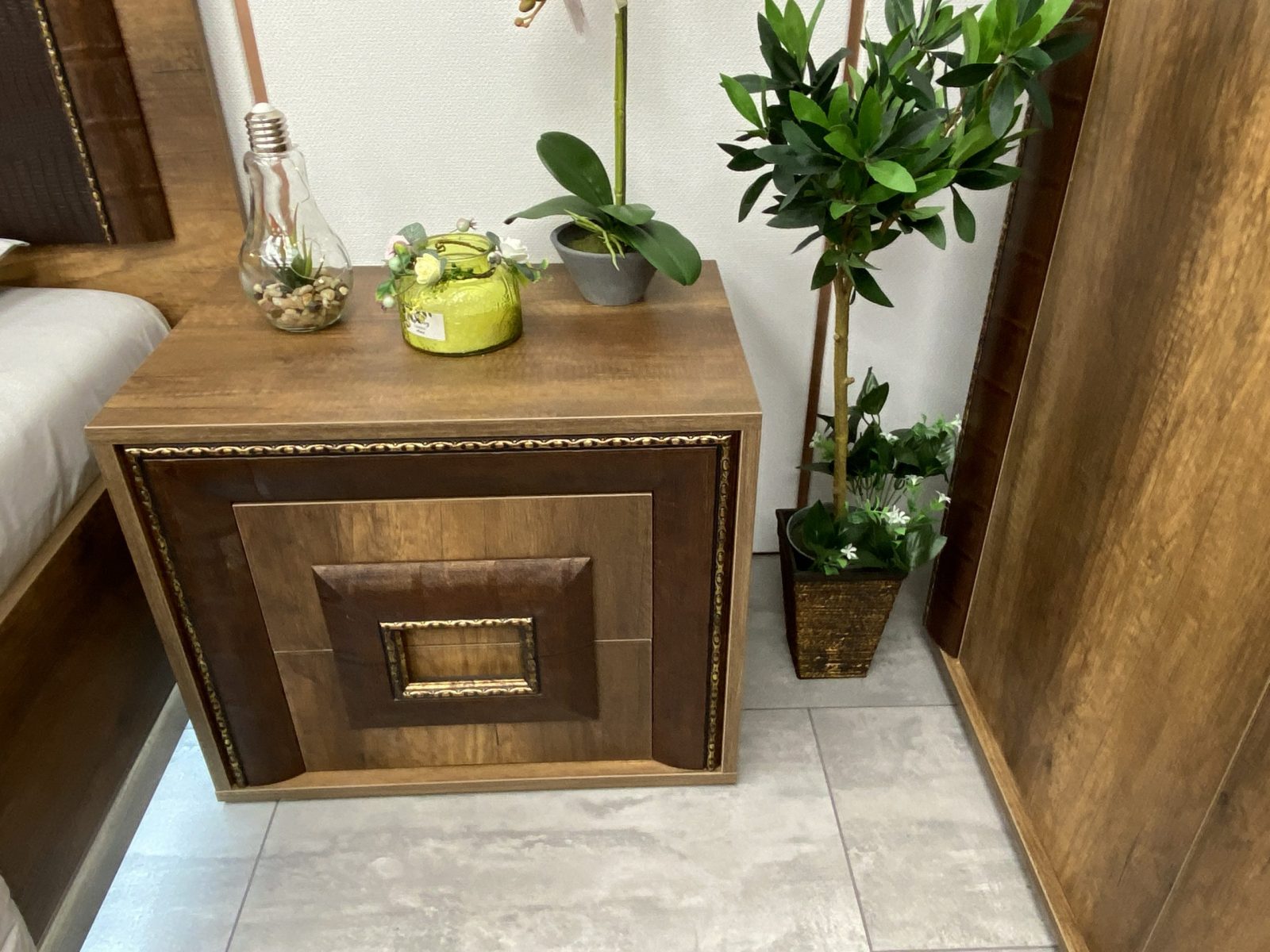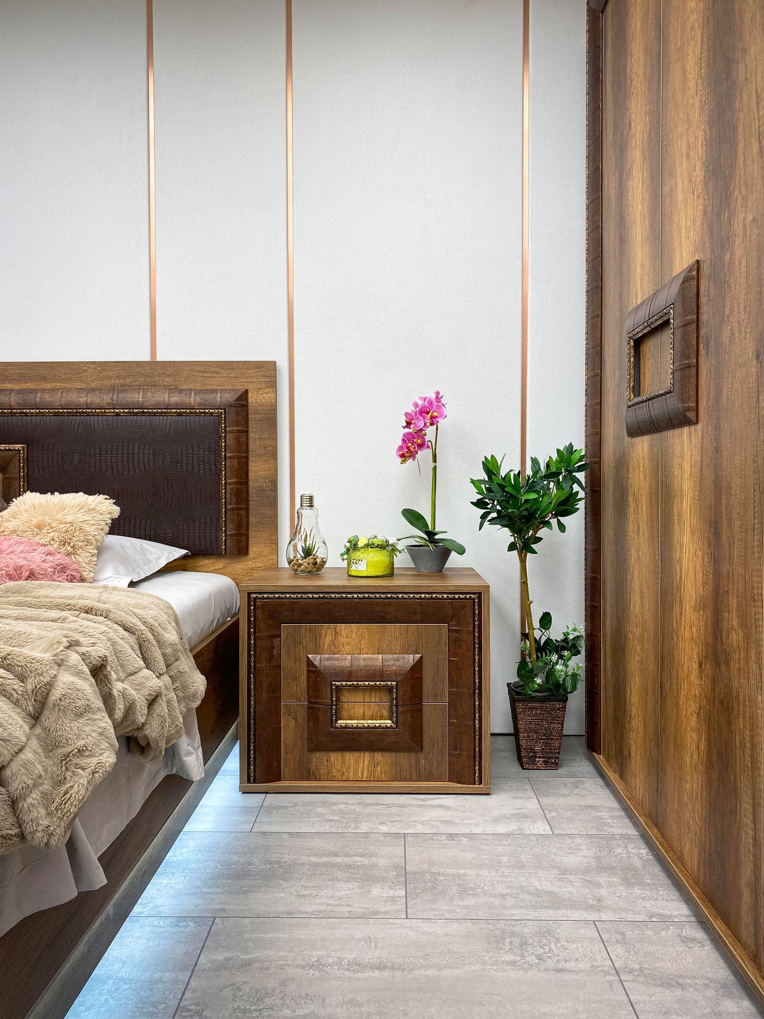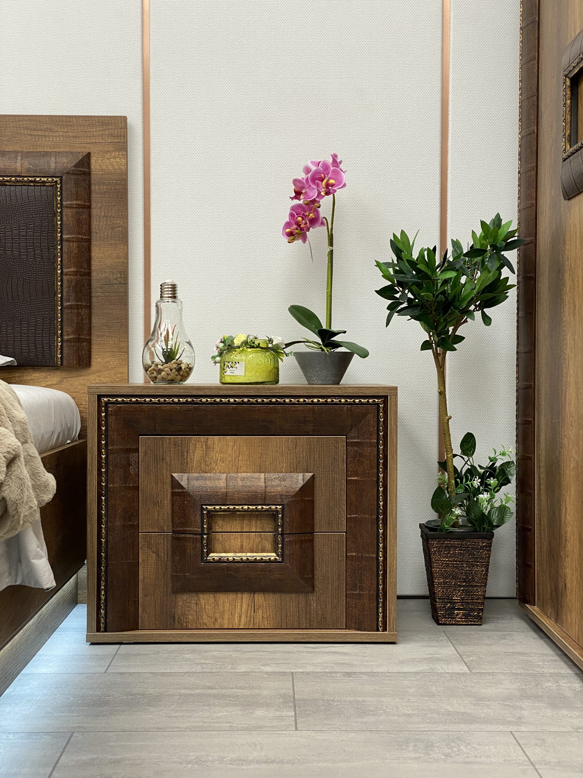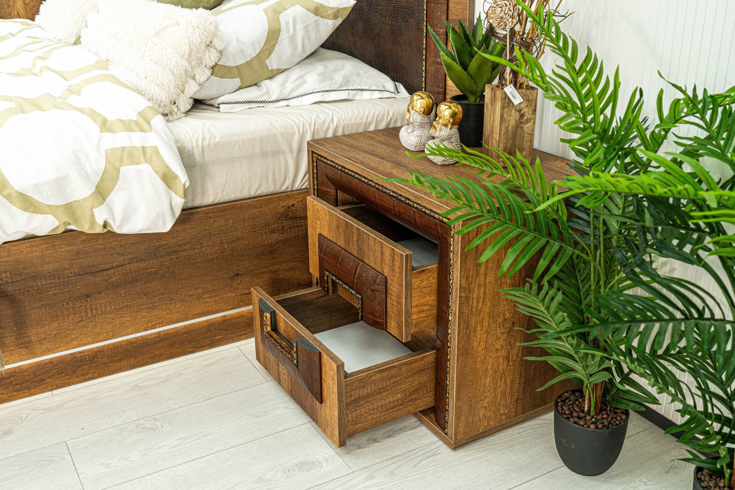 Нощно шкафче: Две практични чекмеджета с дръжки – прецизно изпълнение от интериорен профил цвят сребро, сглобка тип „герунг“, система скрити водачи Quadro Hettich – плавно затваряне . Уникалният дизайн е подчертан и рамкиран с „П“ – образен интериорен профил – сглобка тип „герунг“ – 2 бр.