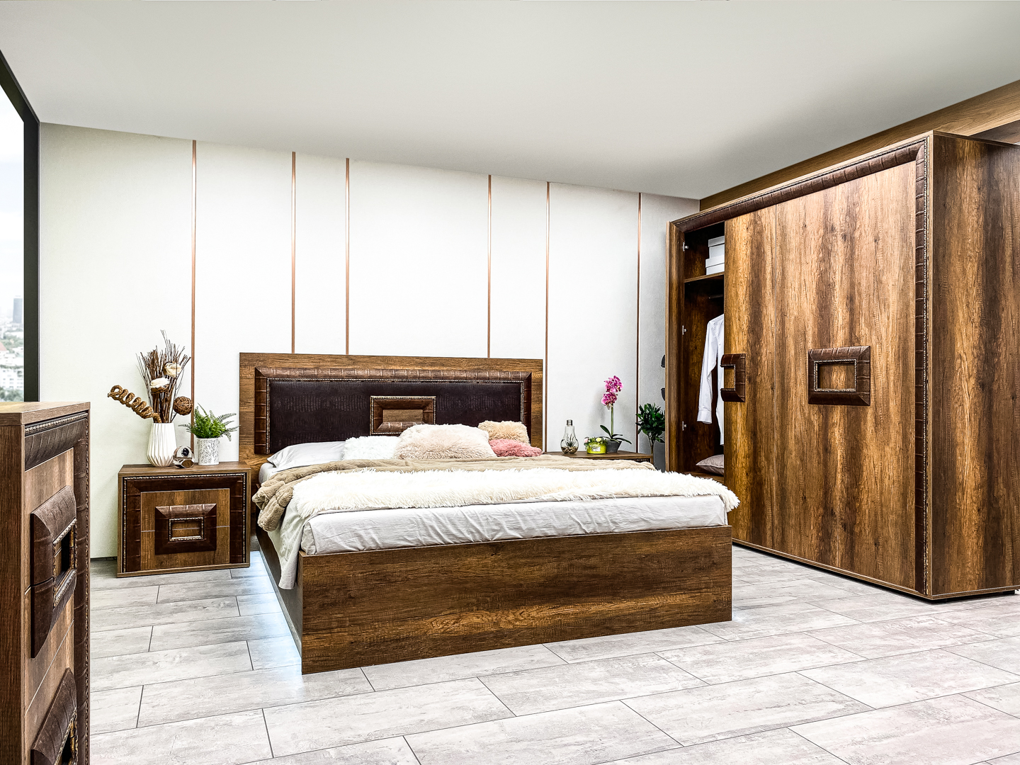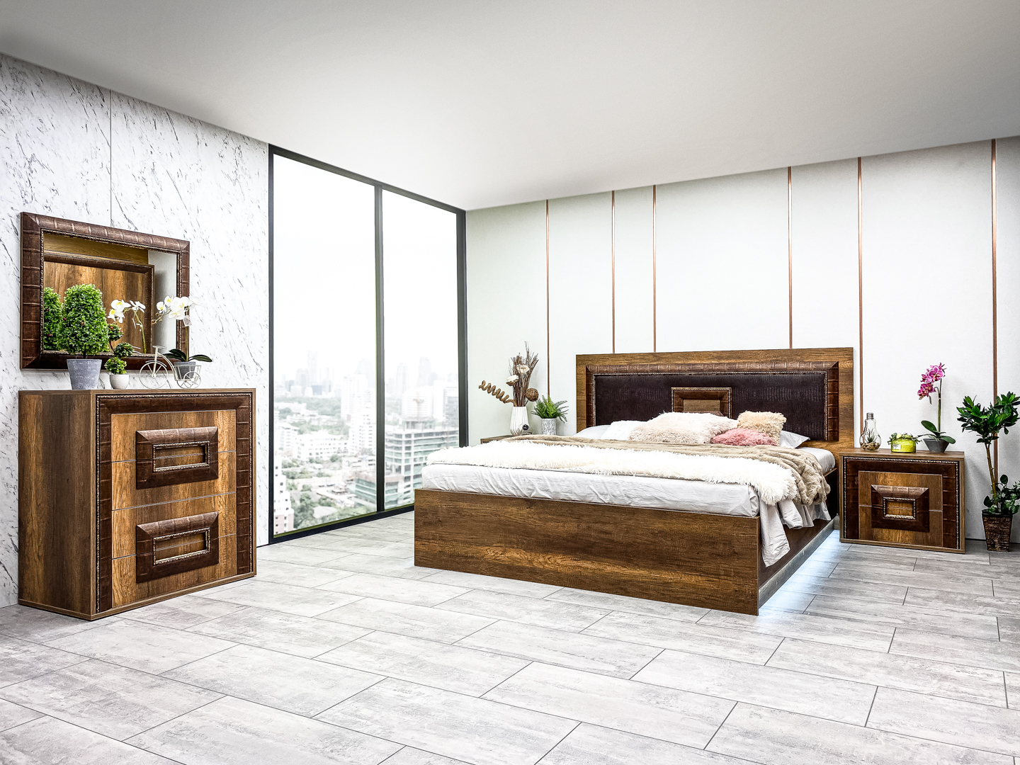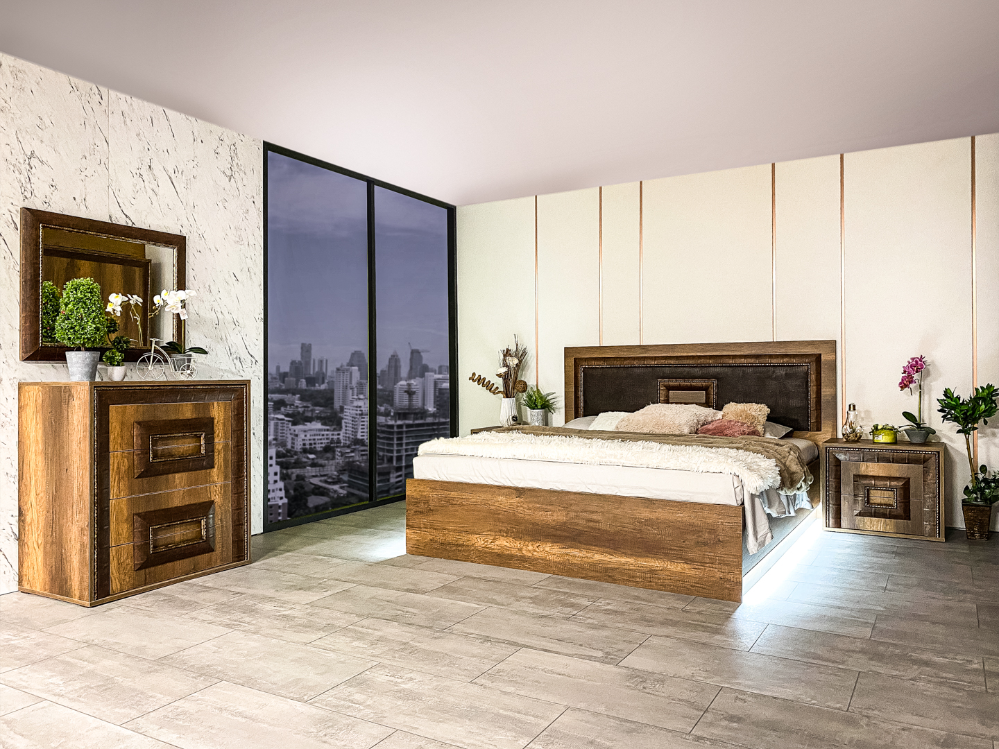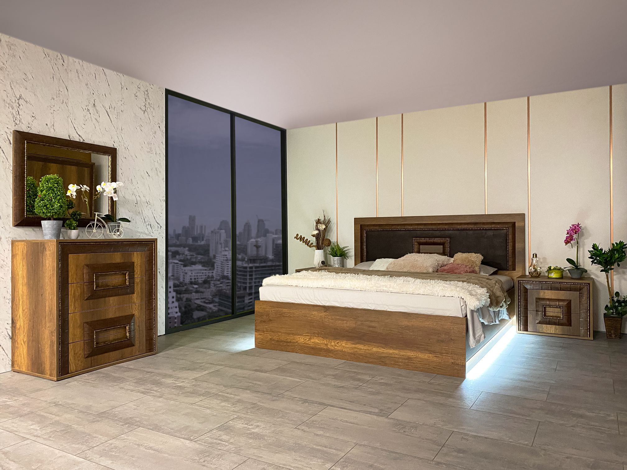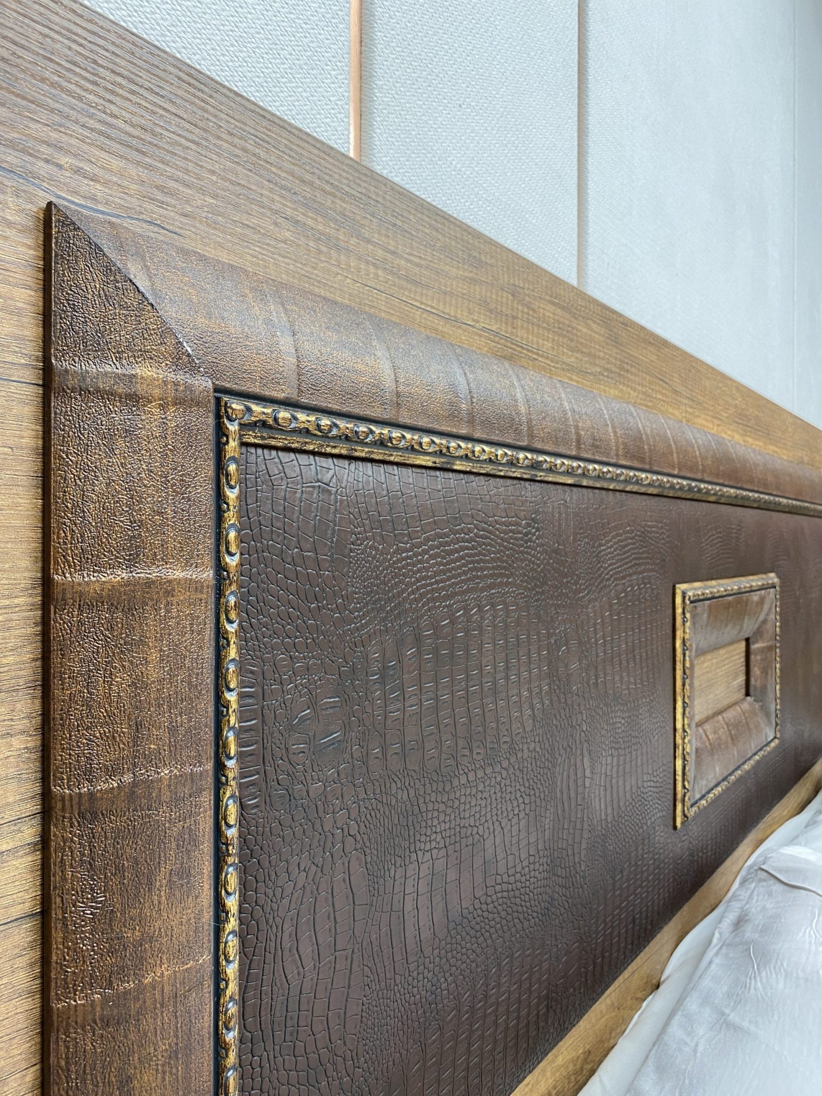 Легло: Елегантна табла, състояща се от основна плюс вградена тапицирана декоративна табла, рамкована от интериорен профил в цвят златно – кафяво, с подчертан завършващ златен ажур,  акцентирано присъствие на горещо щампована еко кожа тип „крокодилска шарка“. Базата за матрак е с вграден вътрешен мост, който гарантира прав диагонал на леглото. Всички сглобки са метални – скрит монтаж.  Дългите царги на леглото са сдвоени в които е вградено практично LED осветление с начин на работа – дистационно.