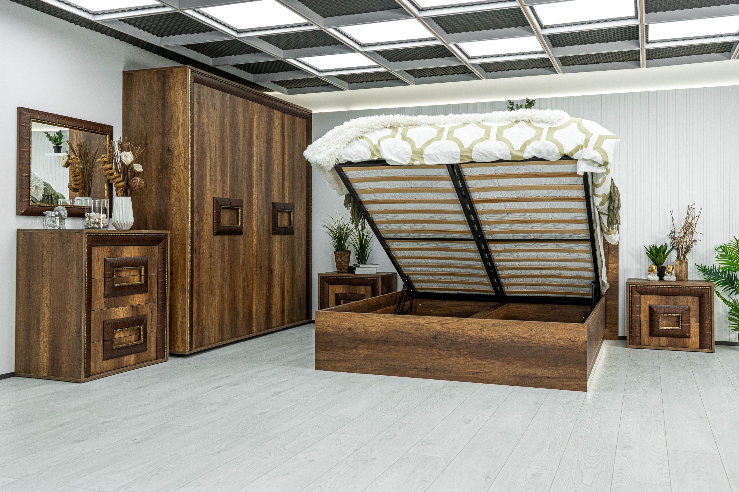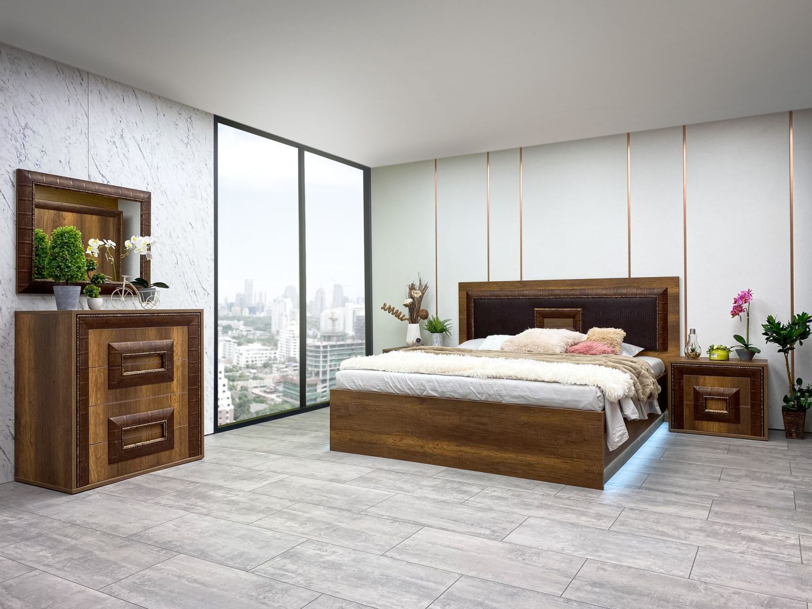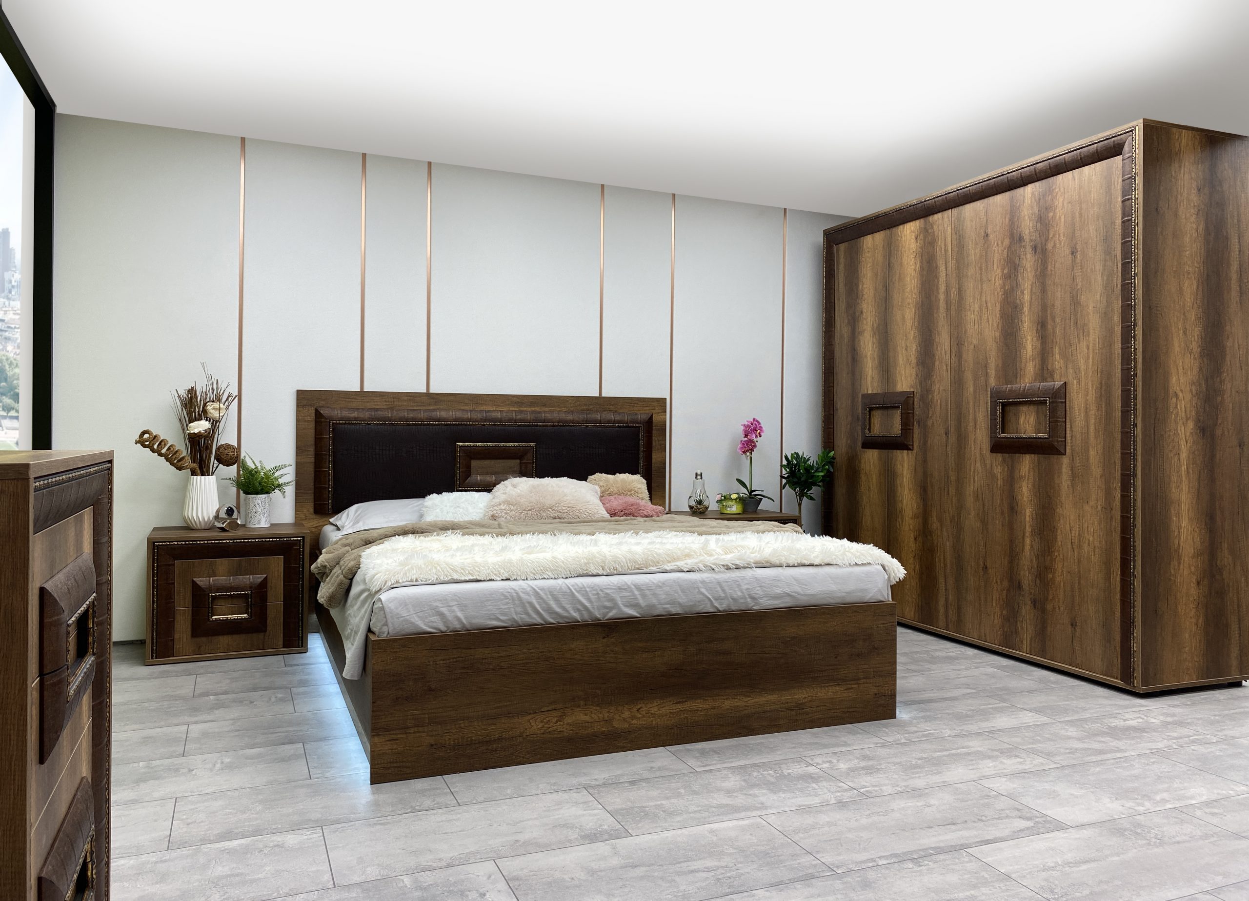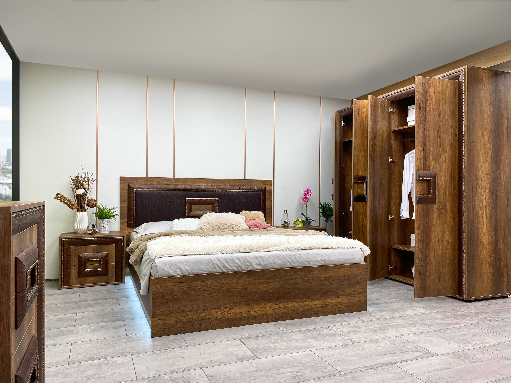 Легло: Елегантна табла, състояща се от основна плюс вградена тапицирана декоративна табла, рамкована от интериорен профил в цвят златно – кафяво, с подчертан завършващ златен ажур,  акцентирано присъствие на горещо щампована еко кожа тип „крокодилска шарка“. Базата за матрак е с вграден вътрешен мост, който гарантира прав диагонал на леглото. Всички сглобки са метални – скрит монтаж.  Дългите царги на леглото са сдвоени в които е вградено практично LED осветление с начин на работа – дистационно.