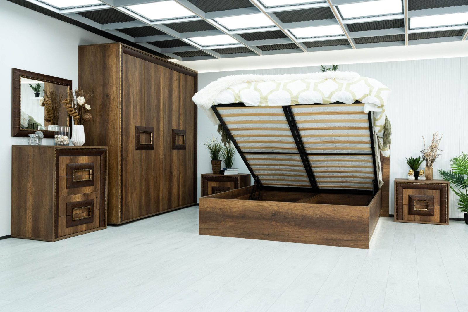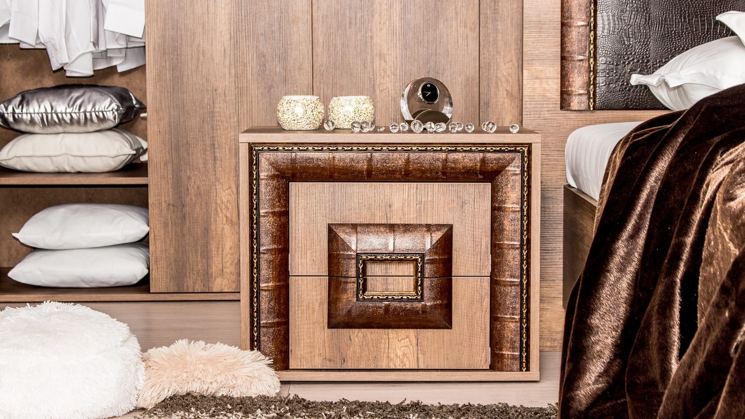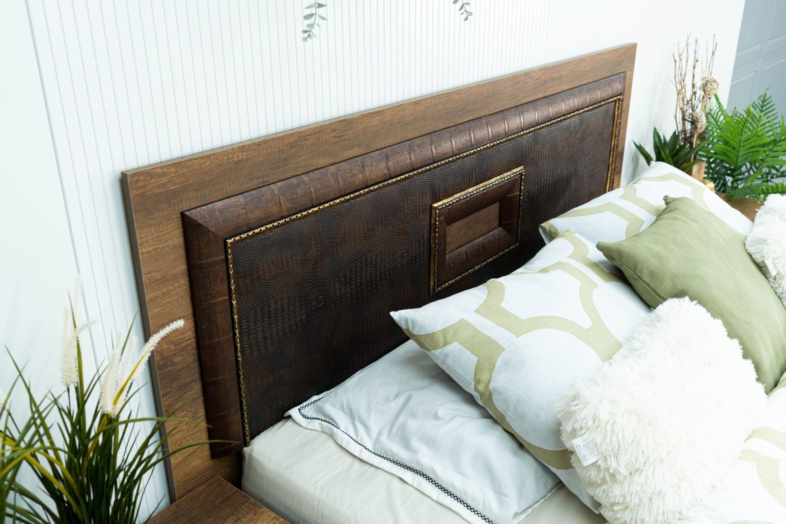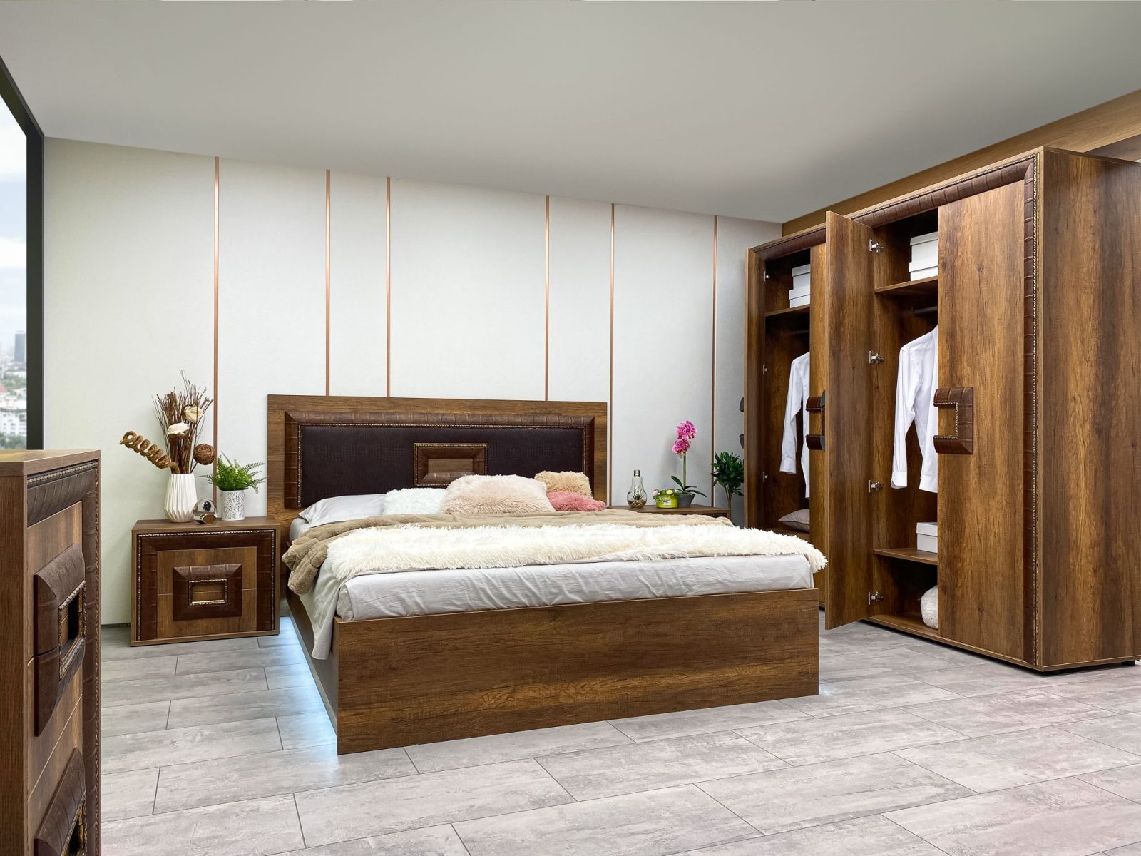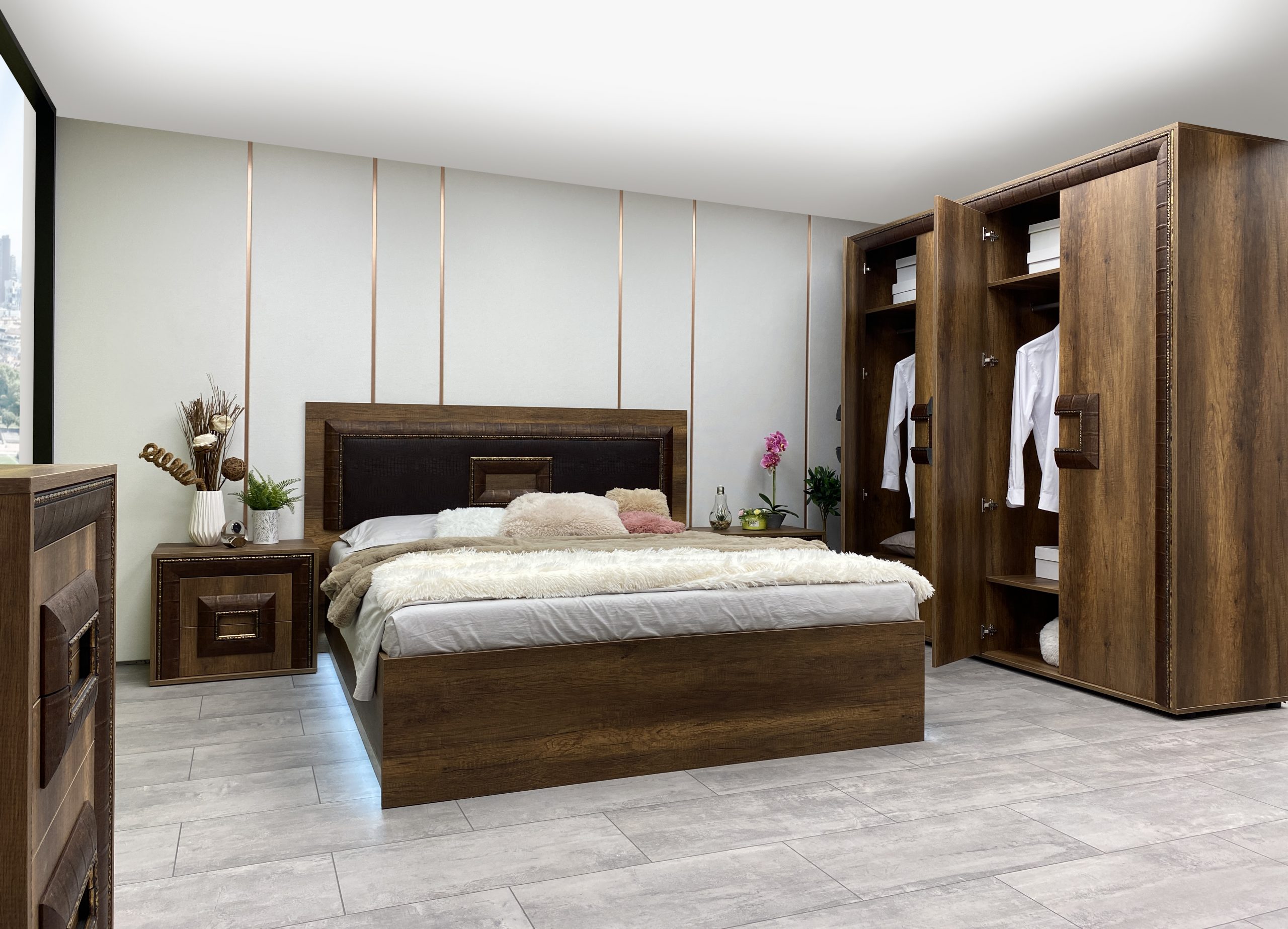 Легло: Елегантна табла, състояща се от основна плюс вградена тапицирана декоративна табла, рамкована от интериорен профил в цвят златно – кафяво, с подчертан завършващ златен ажур,  акцентирано присъствие на горещо щампована еко кожа тип „крокодилска шарка“. Базата за матрак е с вграден вътрешен мост, който гарантира прав диагонал на леглото. Всички сглобки са метални – скрит монтаж.  Дългите царги на леглото са сдвоени в които е вградено практично LED осветление с начин на работа – дистационно.