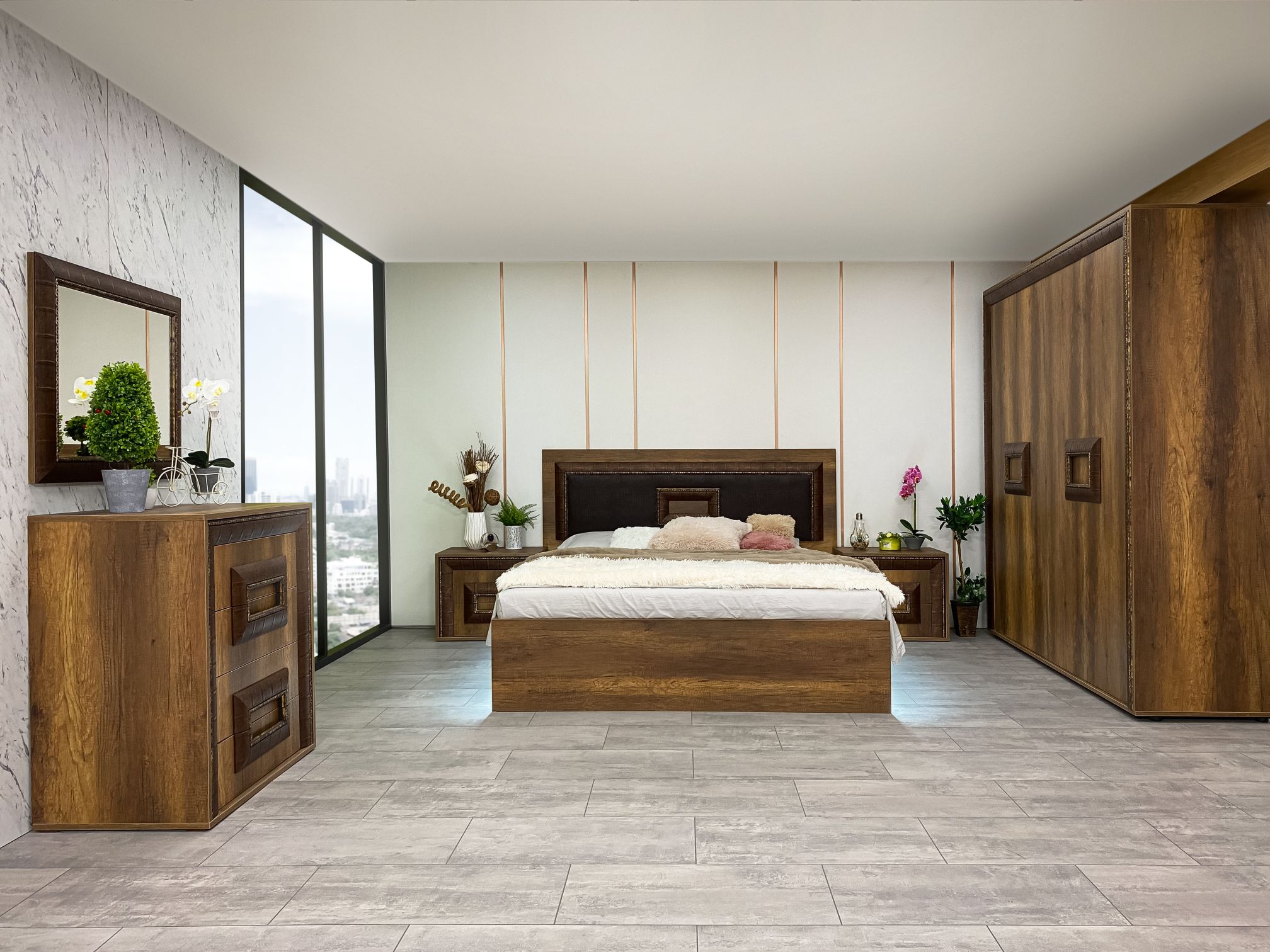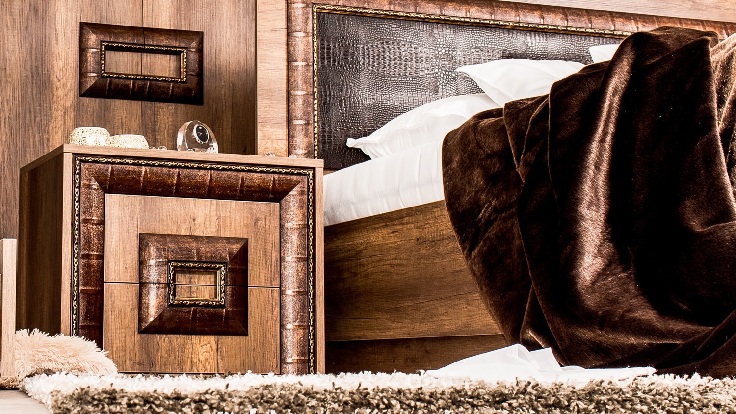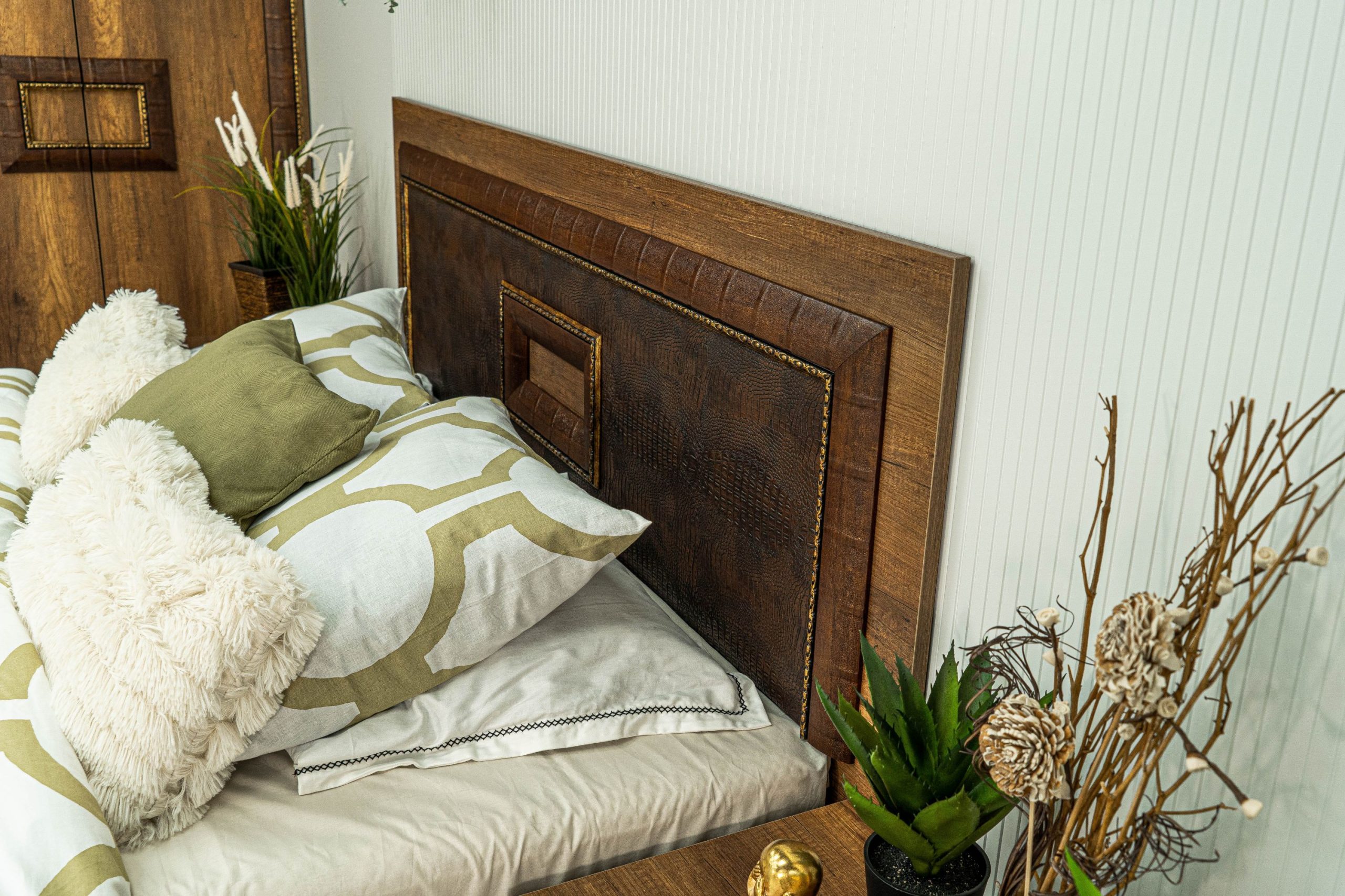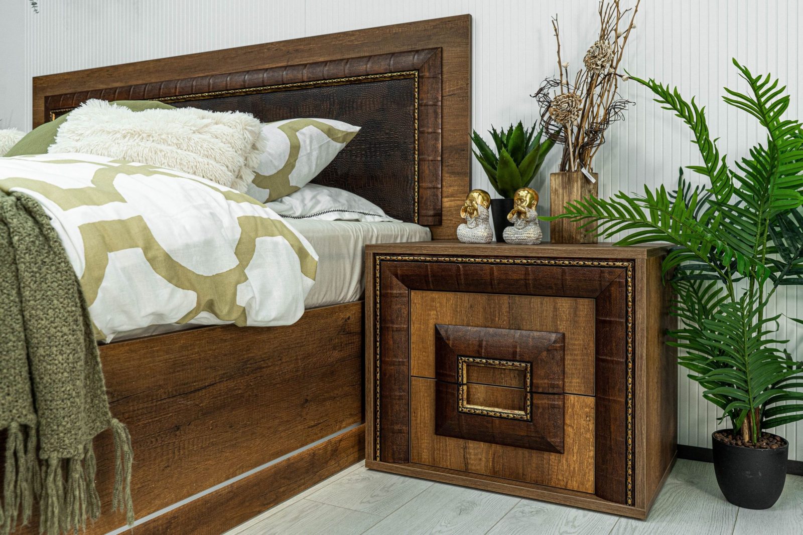 Легло: Елегантна табла, състояща се от основна плюс вградена тапицирана декоративна табла, рамкована от интериорен профил в цвят златно – кафяво, с подчертан завършващ златен ажур,  акцентирано присъствие на горещо щампована еко кожа тип „крокодилска шарка“. Базата за матрак е с вграден вътрешен мост, който гарантира прав диагонал на леглото. Всички сглобки са метални – скрит монтаж.  Дългите царги на леглото са сдвоени в които е вградено практично LED осветление с начин на работа – дистационно.
