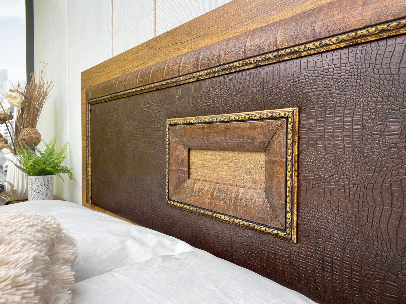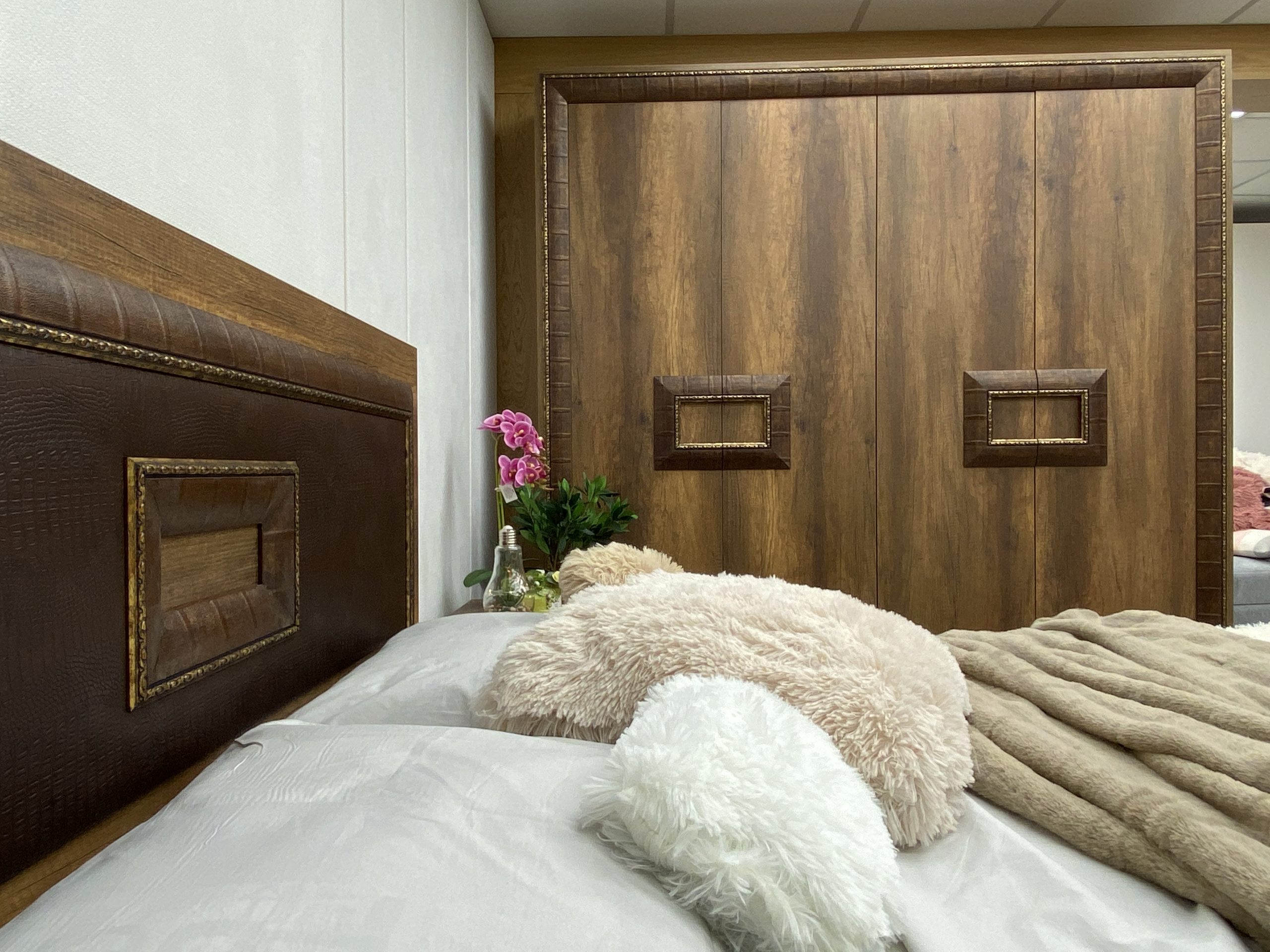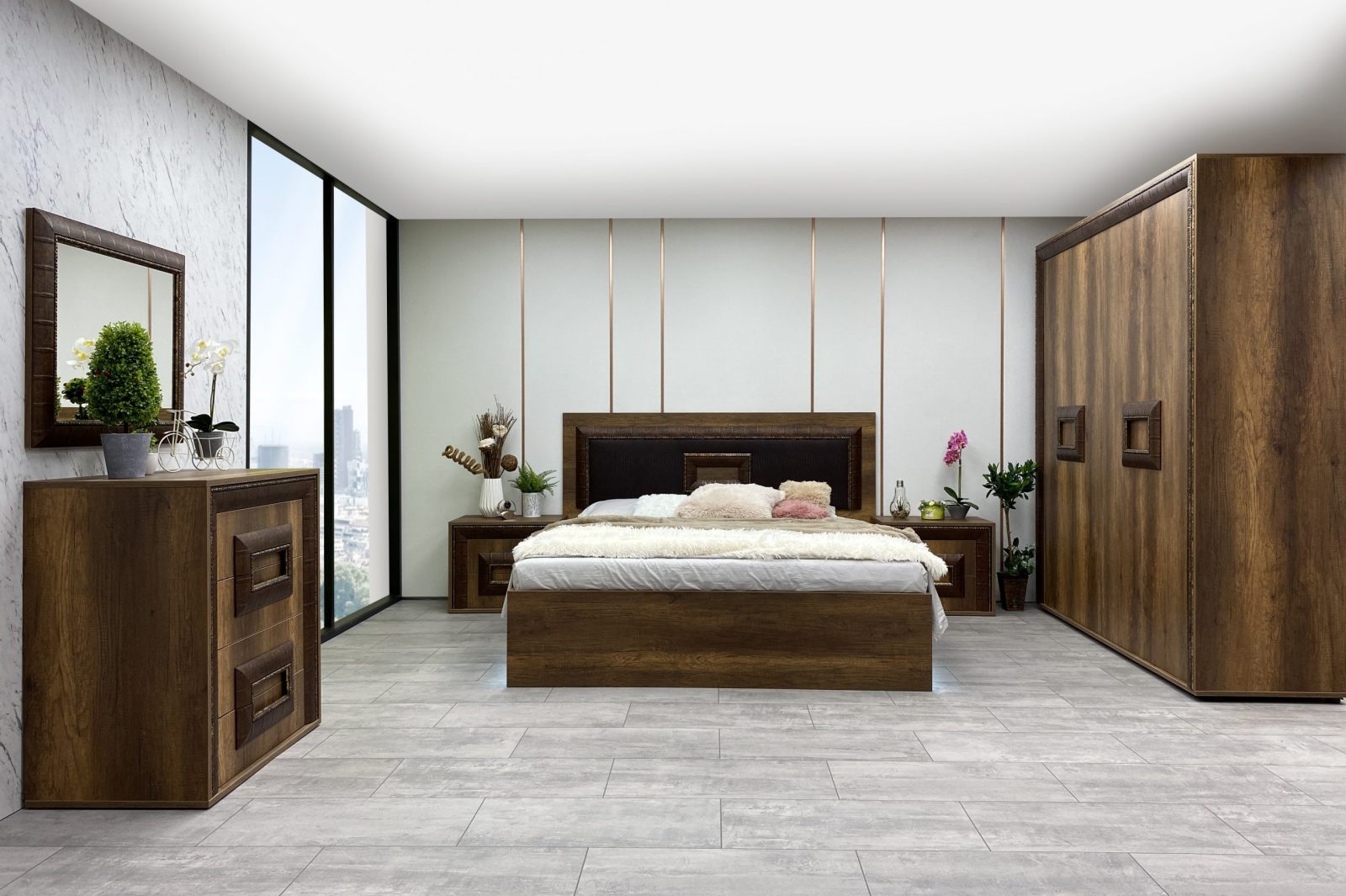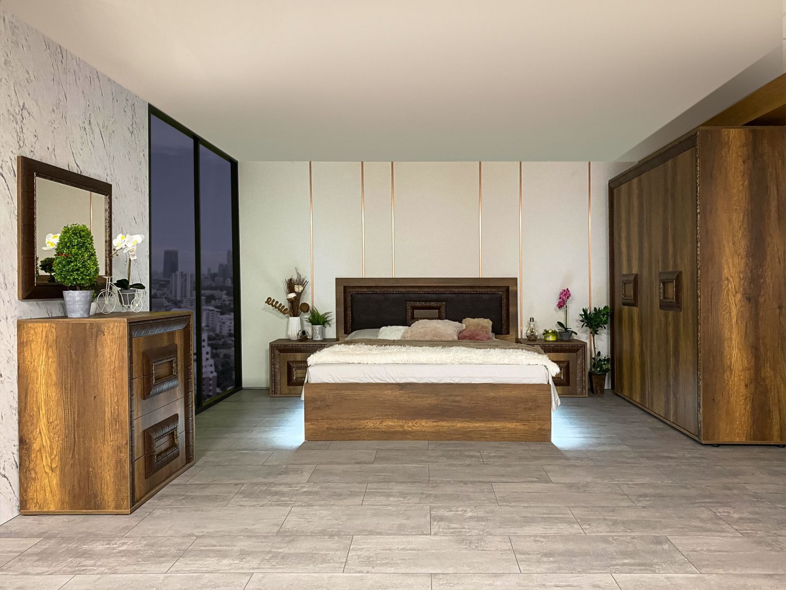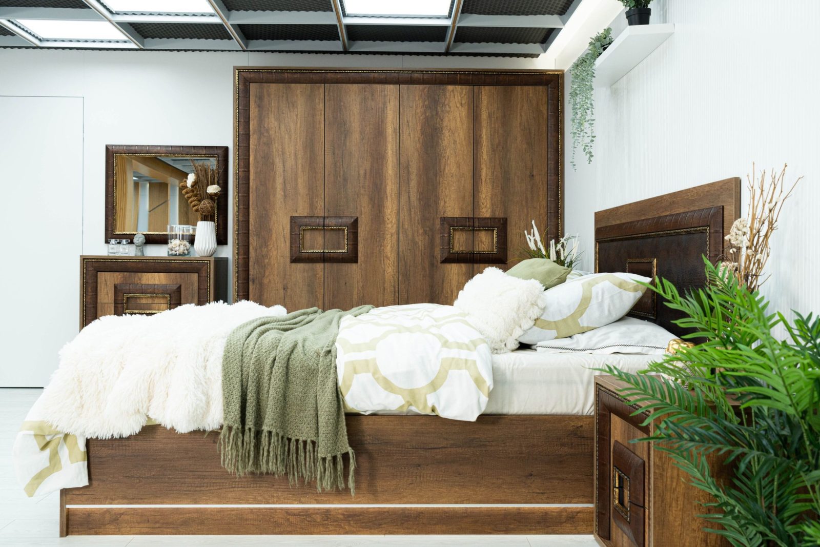 Легло: Елегантна табла, състояща се от основна плюс вградена тапицирана декоративна табла, рамкована от интериорен профил в цвят златно – кафяво, с подчертан завършващ златен ажур,  акцентирано присъствие на горещо щампована еко кожа тип „крокодилска шарка“. Базата за матрак е с вграден вътрешен мост, който гарантира прав диагонал на леглото. Всички сглобки са метални – скрит монтаж.  Дългите царги на леглото са сдвоени в които е вградено практично LED осветление с начин на работа – дистационно.