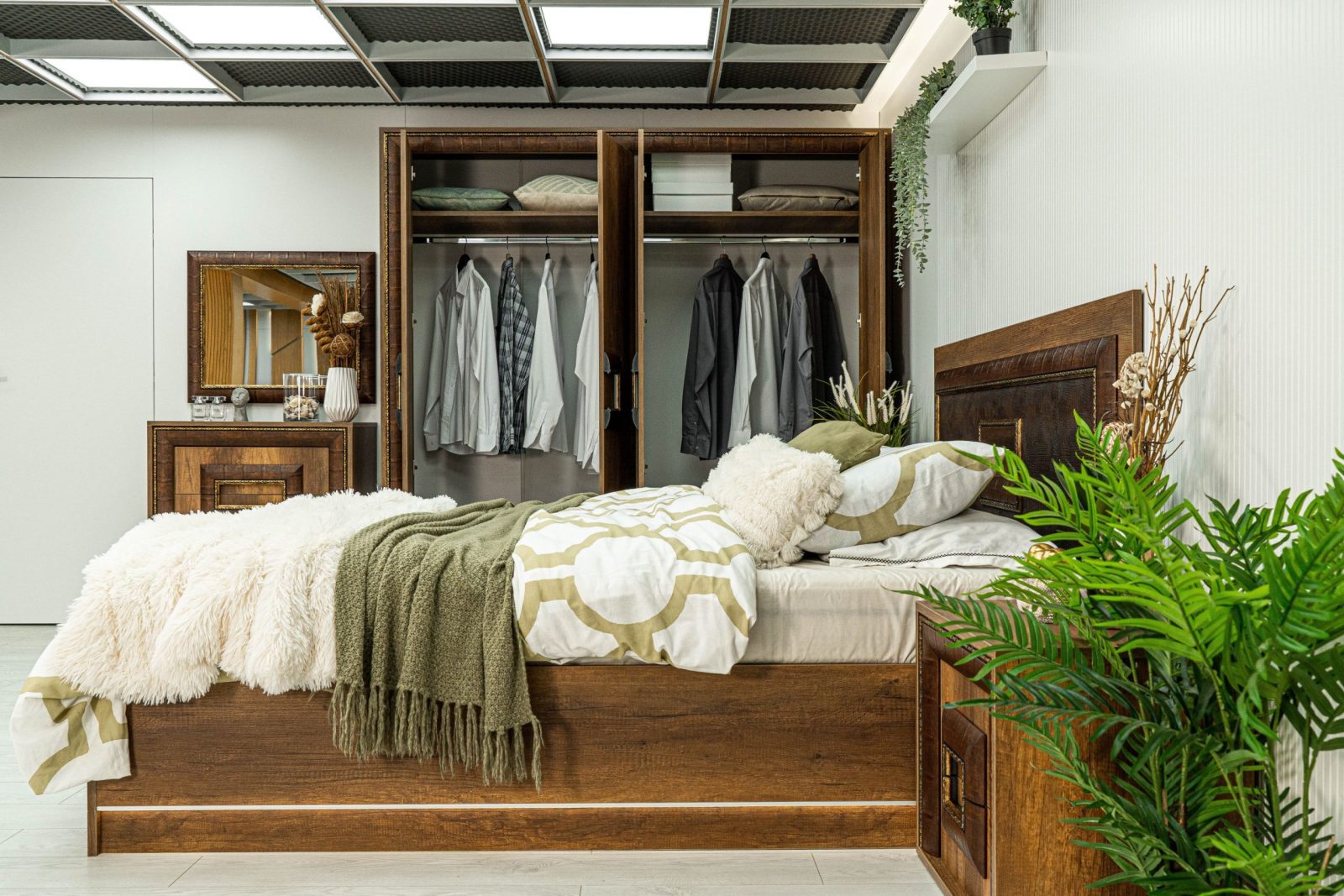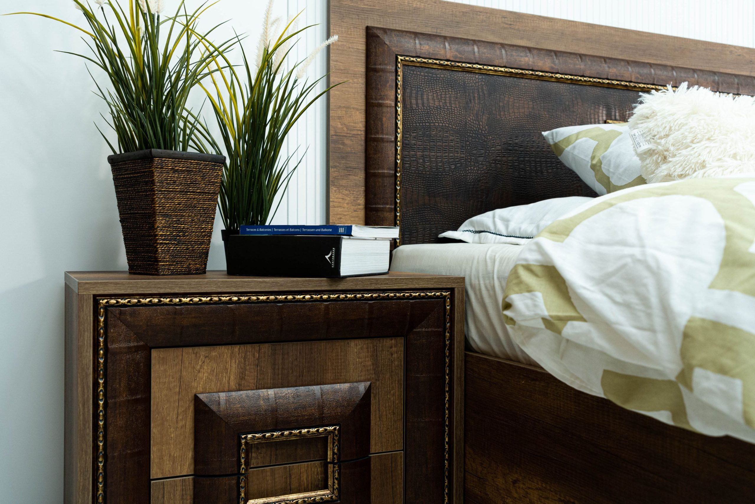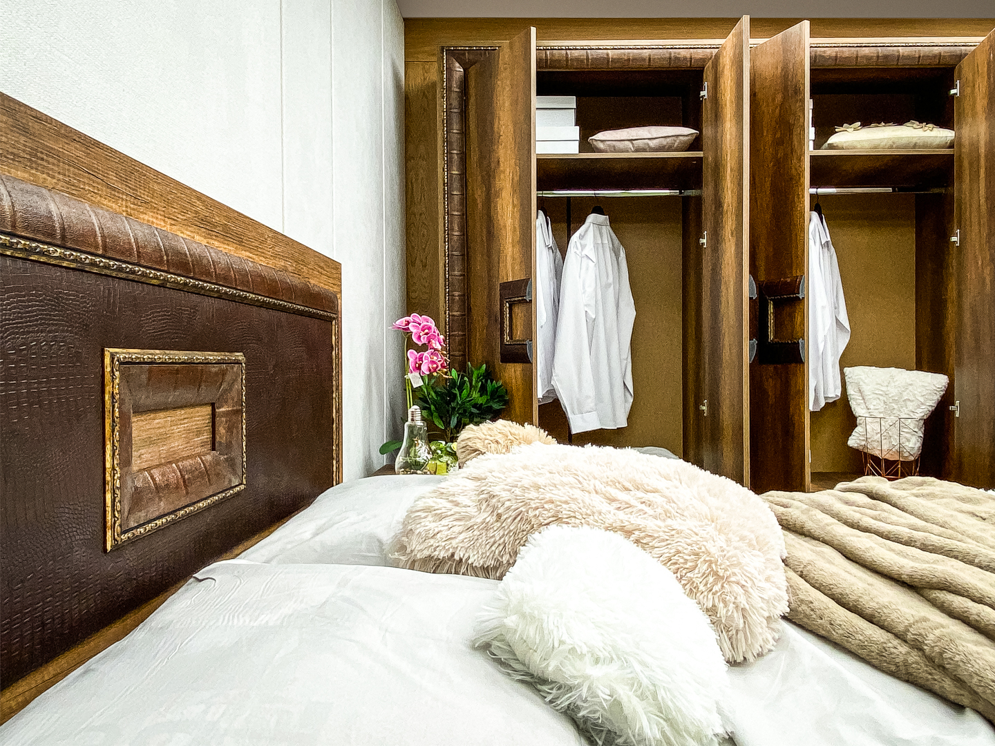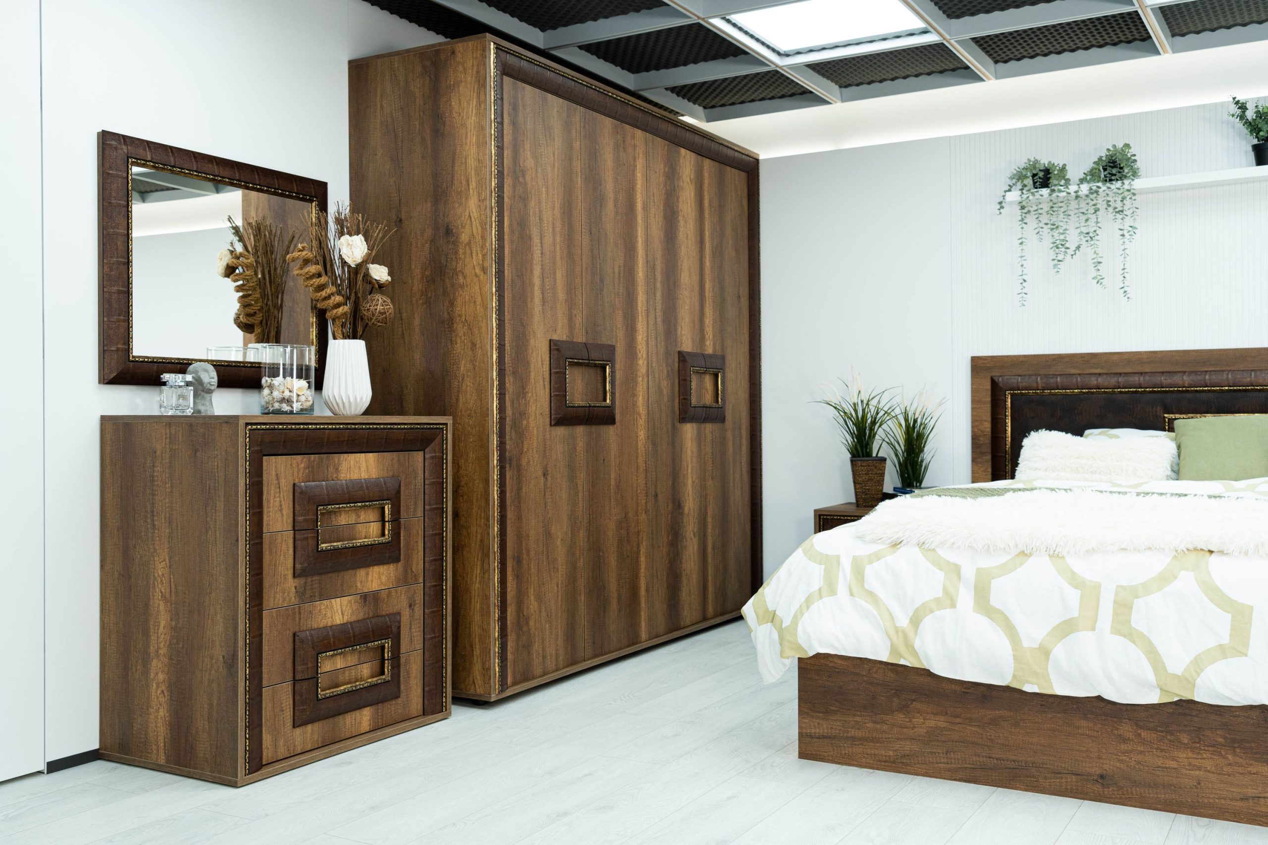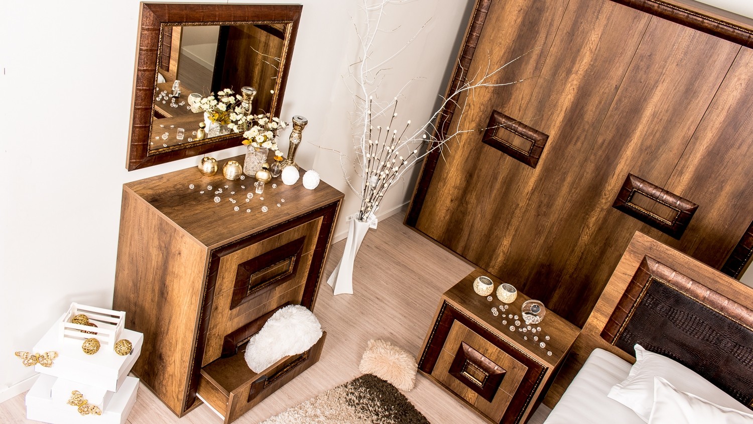 Легло: Елегантна табла, състояща се от основна плюс вградена тапицирана декоративна табла, рамкована от интериорен профил в цвят златно – кафяво, с подчертан завършващ златен ажур,  акцентирано присъствие на горещо щампована еко кожа тип „крокодилска шарка“. Базата за матрак е с вграден вътрешен мост, който гарантира прав диагонал на леглото. Всички сглобки са метални – скрит монтаж.  Дългите царги на леглото са сдвоени в които е вградено практично LED осветление с начин на работа – дистационно.
