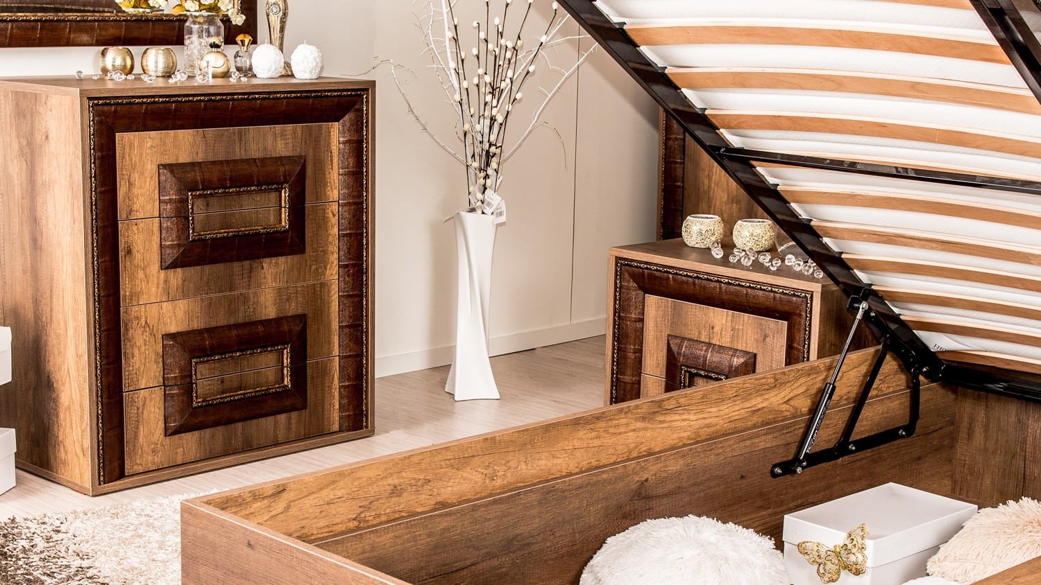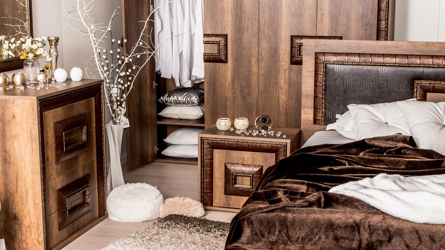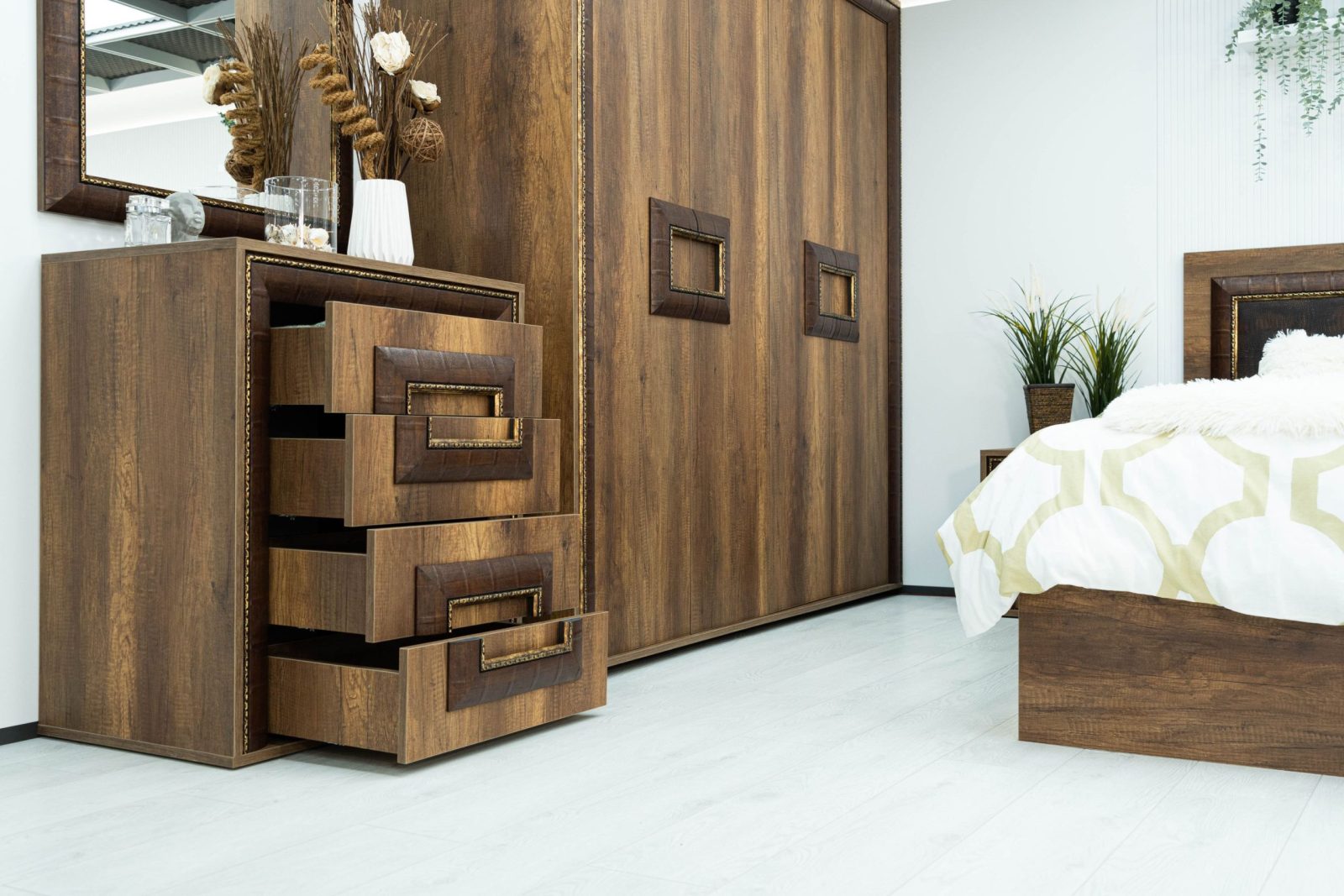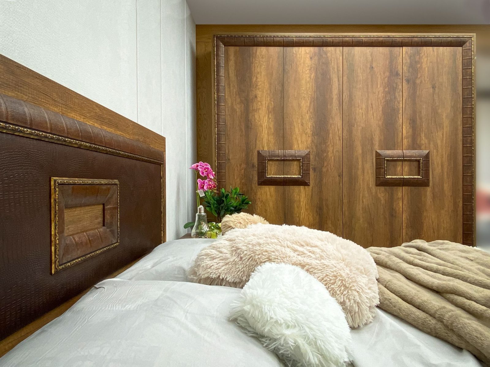 Легло: Елегантна табла, състояща се от основна плюс вградена тапицирана декоративна табла, рамкована от интериорен профил в цвят златно – кафяво, с подчертан завършващ златен ажур,  акцентирано присъствие на горещо щампована еко кожа тип „крокодилска шарка“. Базата за матрак е с вграден вътрешен мост, който гарантира прав диагонал на леглото. Всички сглобки са метални – скрит монтаж.  Дългите царги на леглото са сдвоени в които е вградено практично LED осветление с начин на работа – дистационно.